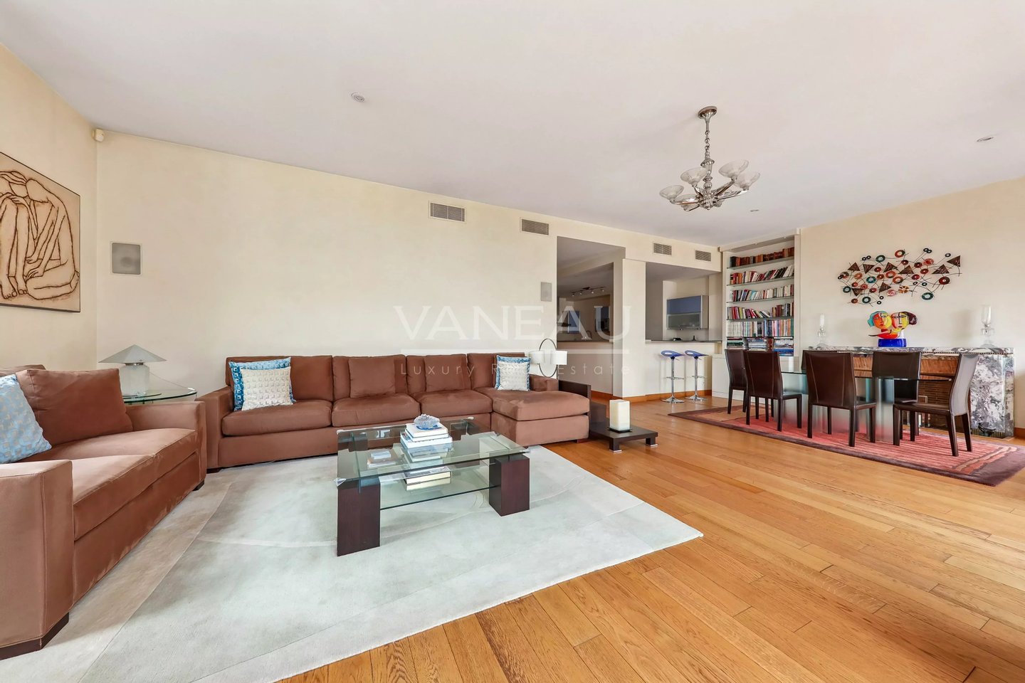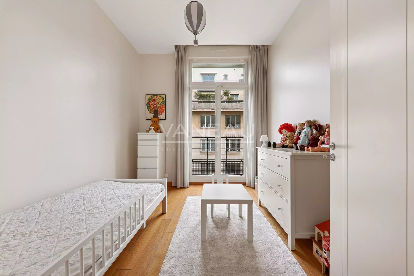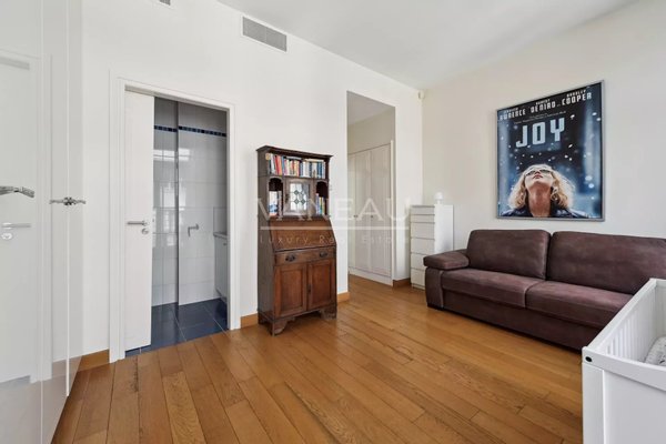 It comprises an entrance hall leading to a vast reception room bordered by west-facing balconies overlooking the Bois de Boulogne and La Défense, an open-plan fitted kitchen, a large master suite with dressing room, a second bedroom and shower room, numerous cupboards, a laundry room and a guest toilet. Harmonious, well-balanced volumes, fine appointments, unobstructed view unobstructed from overlooked areas.