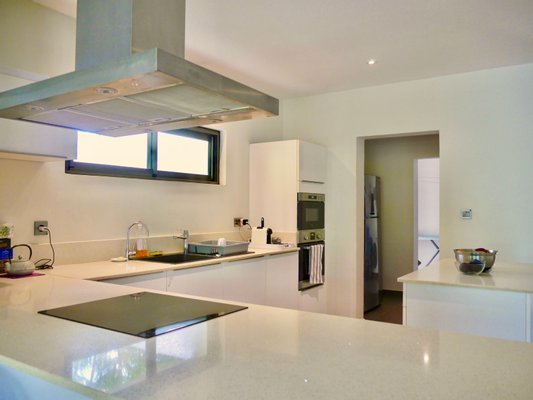 Beim Betreten des Grundstücks zieht der offene Wohnraum sofort den Blick auf den Außenbereich und das Schwimmbad. Die Architektur schafft eine natürliche Verbindung zwischen Innen- und Außenräumen und lässt reichlich natürliches Licht durch die großzügig gestalteten Räume strömen. Hohe Decken verstärken das Gefühl von Offenheit, während die isolierte Bauweise das ganze Jahr über ein angenehmes Raumklima gewährleistet.