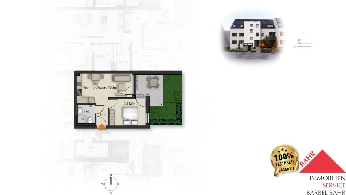 eine gefragte Wohnform im Neubau – Erdgeschoss, Südausrichtung und Gartenanteil erhöhen die Attraktivität am Vermietungsmarkt deutlich.