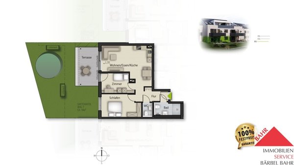 - Terrasse (ca. 15 m²) mit Gartenanteil (ca. 64 m²)