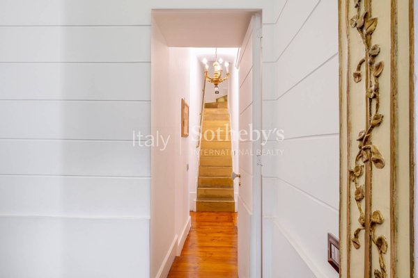 Die Räume sind rational und harmonisch gegliedert: Der großzügige Eingangsbereich führt in den Repräsentationsbereich und bildet zugleich den Übergang zur Küche sowie zum Servicebereich, der über ein großes Zimmer mit Bad, eine praktische Waschküche und einen Abstellraum verfügt. Die Salons sind weitläufig und monumental und zeichnen sich durch die für herrschaftliche Palazzi typischen Raumhöhen und ihre elegante Ausstrahlung aus. Das separate Esszimmer ist strategisch sowohl in der Nähe des Repräsentationsbereichs als auch der Küche gelegen und grenzt an das Gästebad.