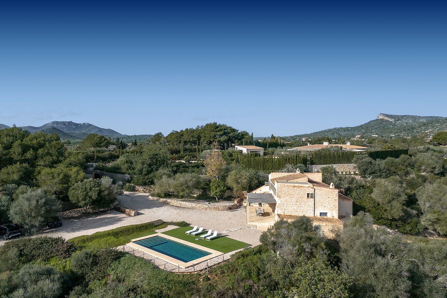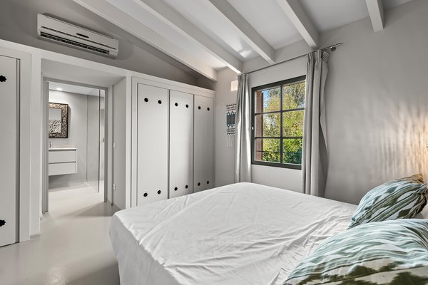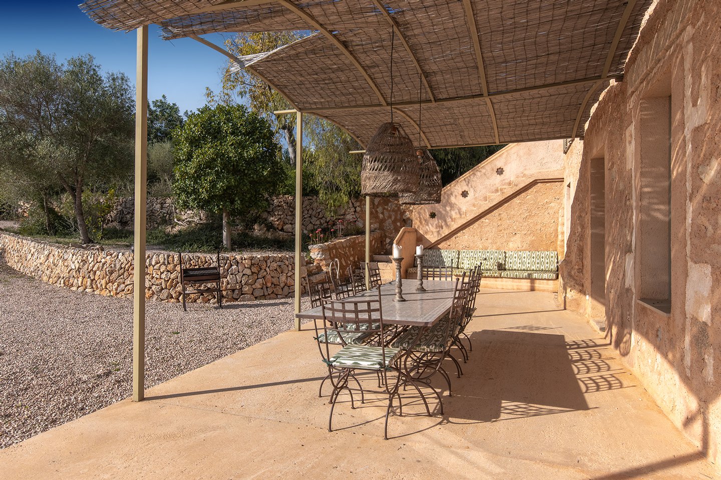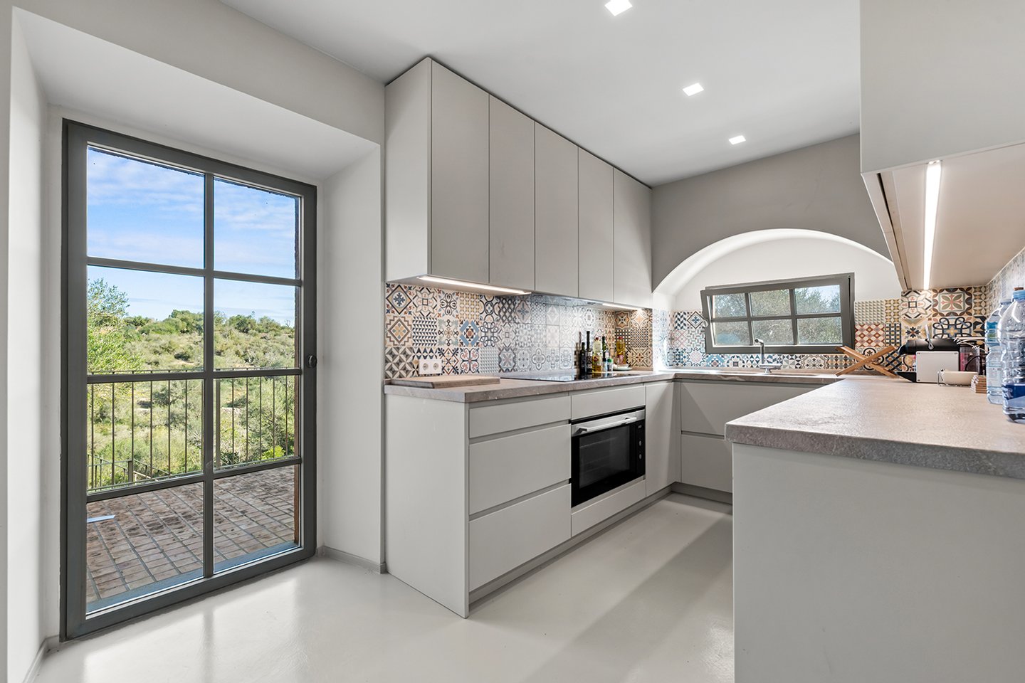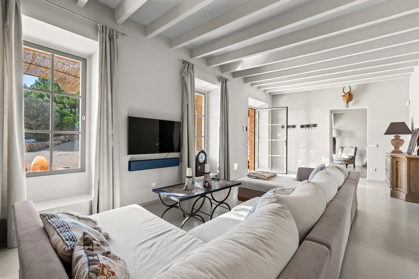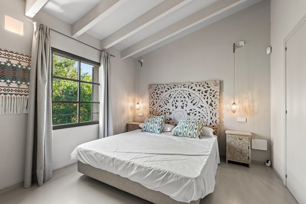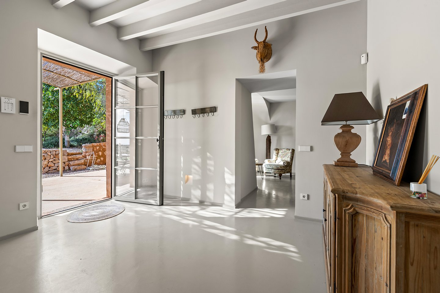 Im Inneren begeistert das Anwesen mit edlen Mikrozementböden, hellen Holzbalken und einer warmen, stilvollen Atmosphäre. Der gemütliche Wohnbereich bildet das Herzstück des Hauses und geht fließend in den Essbereich über, der sich harmonisch in das Gesamtbild einfügt. Die moderne Küche ist vollständig ausgestattet und bietet direkten Zugang auf eine separate Terrasse. Die Finca verfügt über 4 Schlafzimmer mit jeweils Badezimmer en Suite.