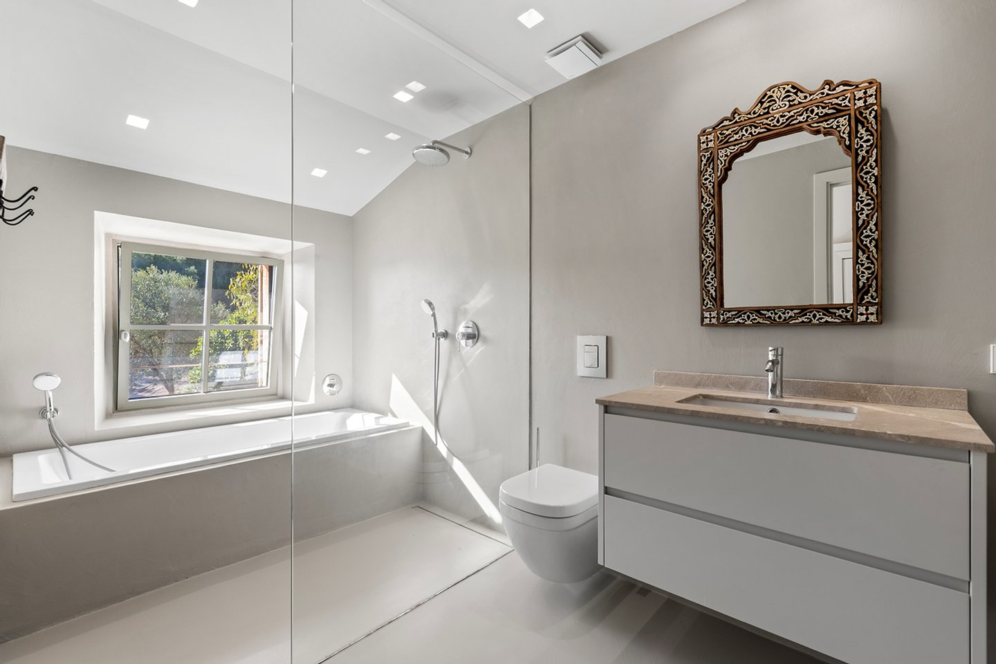Der liebevoll gestaltete Außenbereich lädt mit einer großen Terrasse und einem beheizbaren Pool zum Entspannen ein. Von hier aus können Sie einen traumhaften Blick auf das Meer genießen. Abgerundet wird dieses besondere Anwesen durch Klimaanlage, Fußbodenheizung und eine Alarmanlage, die höchsten Wohnkomfort gewährleisten.