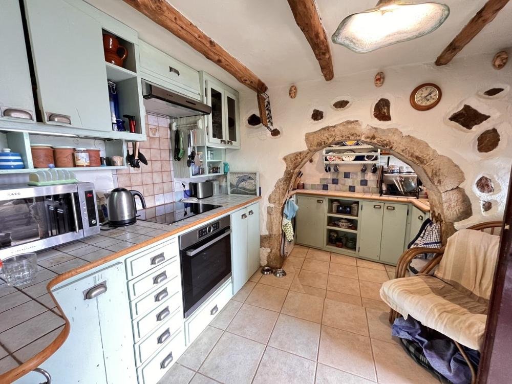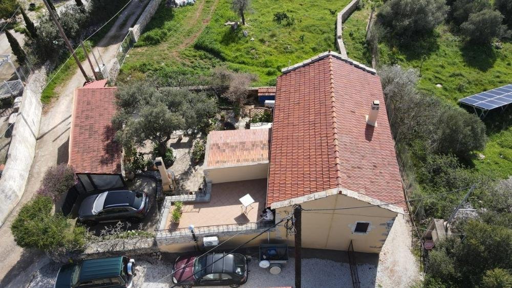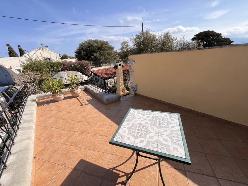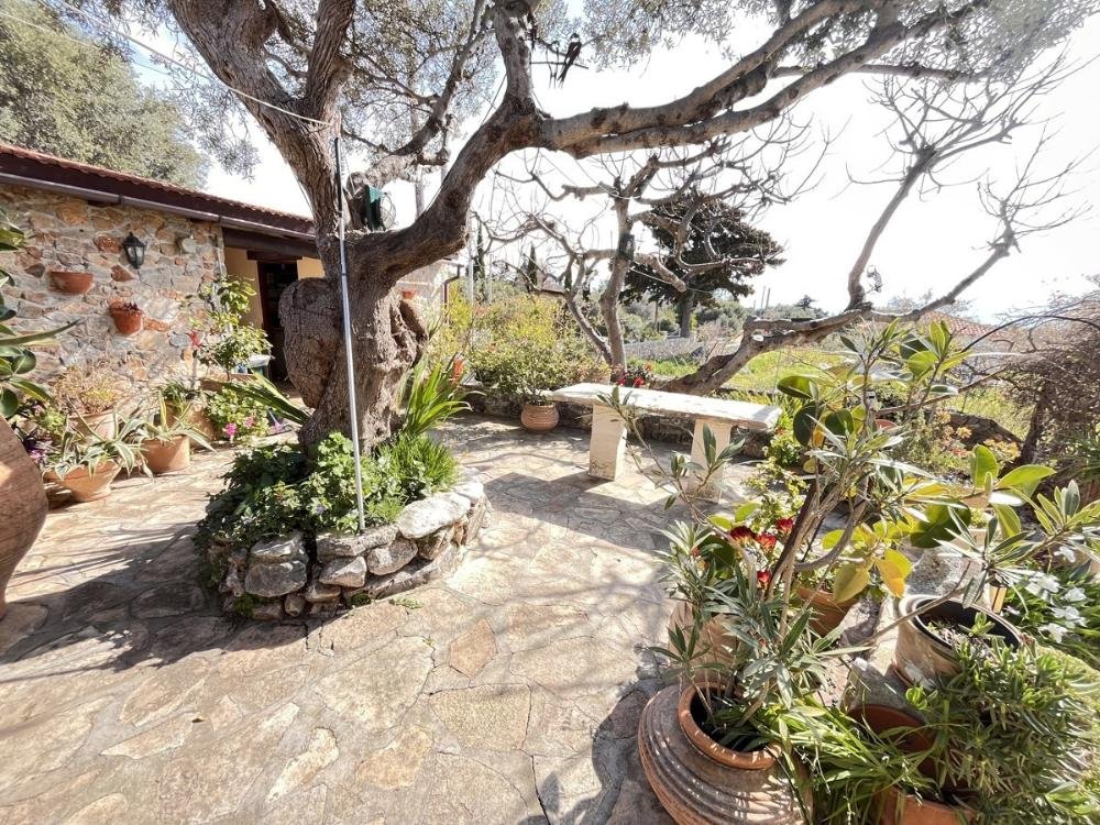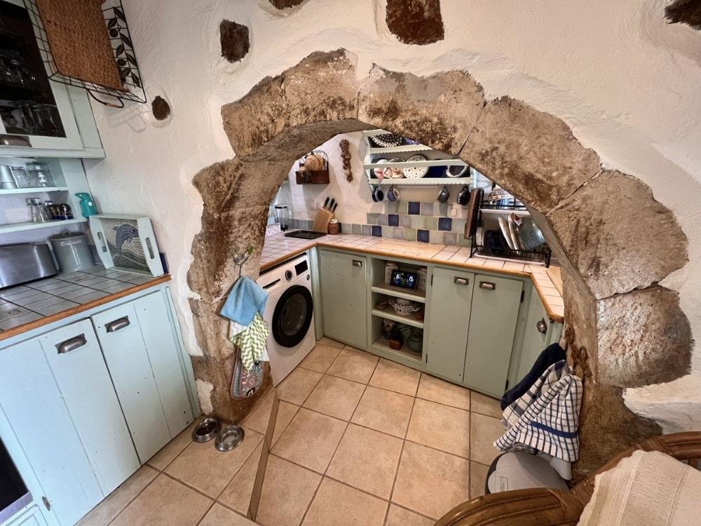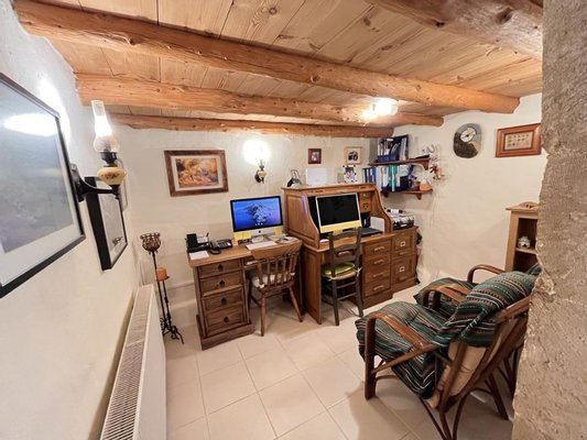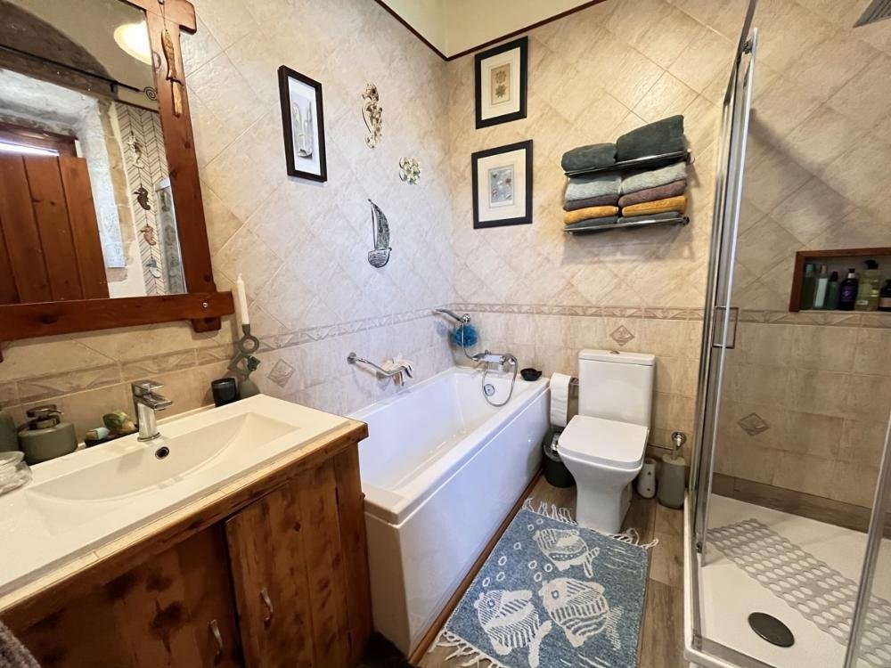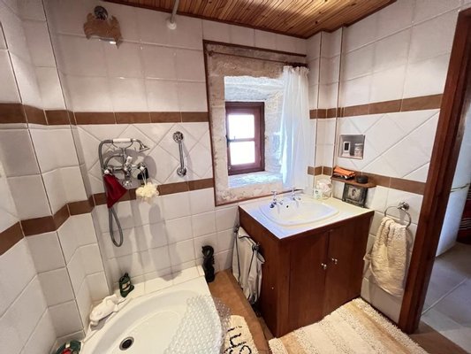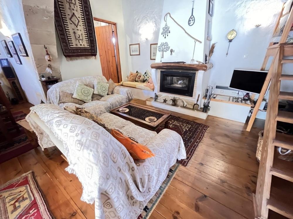 Im Inneren spiegelt die Raumaufteilung klassisches kretisches Design wider: Die Zimmer gehen fließend ineinander über und öffnen sich zum Innenhof. Der Hauptwohnbereich besticht durch Holzböden, eine hohe Holzdecke, einen Kamin und einen markanten Steinbogen. Das Hauptschlafzimmer auf der Galerieebene bietet Zugang zur Dachterrasse und kann bei Bedarf in einen zusätzlichen, geschlossenen Schlafbereich umgewandelt werden. Ein weiterer Raum, der derzeit als Büro genutzt wird, kann problemlos als drittes Schlafzimmer dienen.