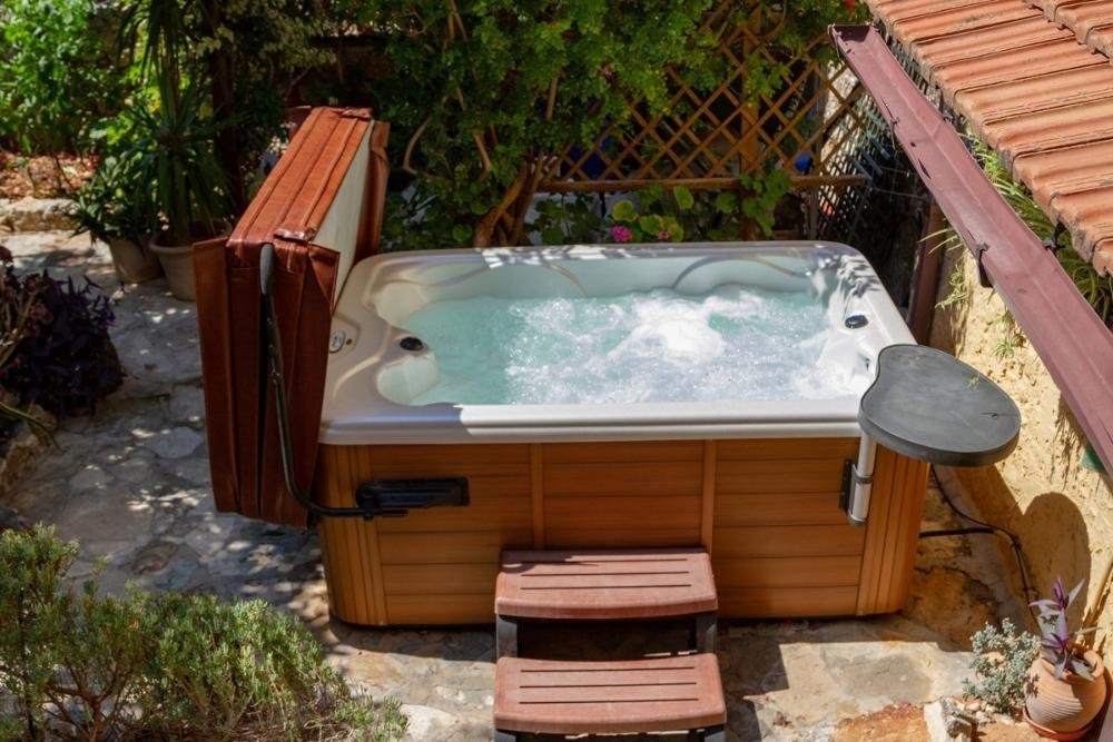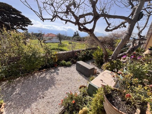 Das Haus ist L-förmig angelegt und nach Süden ausgerichtet, wodurch ein freier Blick auf die Weißen Berge ermöglicht wird. Die Außenbereiche sind liebevoll gestaltet mit gepflasterten Innenhöfen, einem eingebauten Grill, üppiger Bepflanzung und einem zentralen Olivenbaum, der im Sommer natürlichen Schatten spendet. Eine private Dachterrasse über Küche und Heizraum bietet einen weiten Blick auf die Berge, während ein Whirlpool neben dem separaten Studio für zusätzlichen Komfort sorgt.