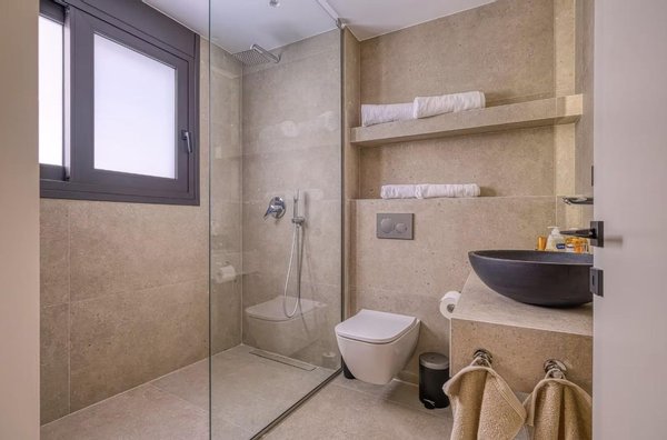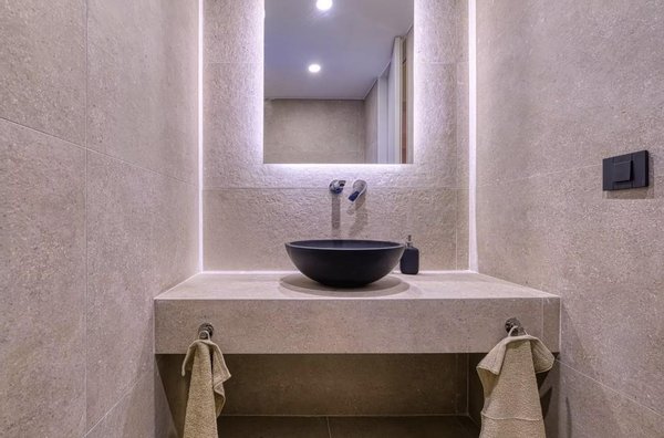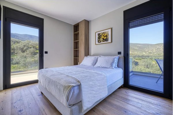 Das Haus besticht durch seinen zeitgenössischen Architekturstil, der Naturstein, Zement und Glas zu einer hellen und eleganten Wohnumgebung vereint. Große Öffnungen erlauben reichlich Tageslicht und verstärken die Verbindung zwischen Innen- und Außenräumen.