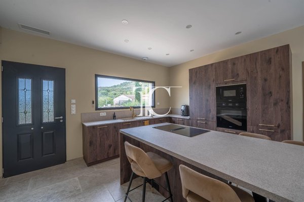 In einer ruhigen Wohngegend gelegen, in unmittelbarer Nähe zum Zentrum von Les Vans und aller Annehmlichkeiten, bietet diese 2025 fertiggestellte, neuwertige Villa eine Wohnfläche von 130 m² auf einem Grundstück von 875 m².