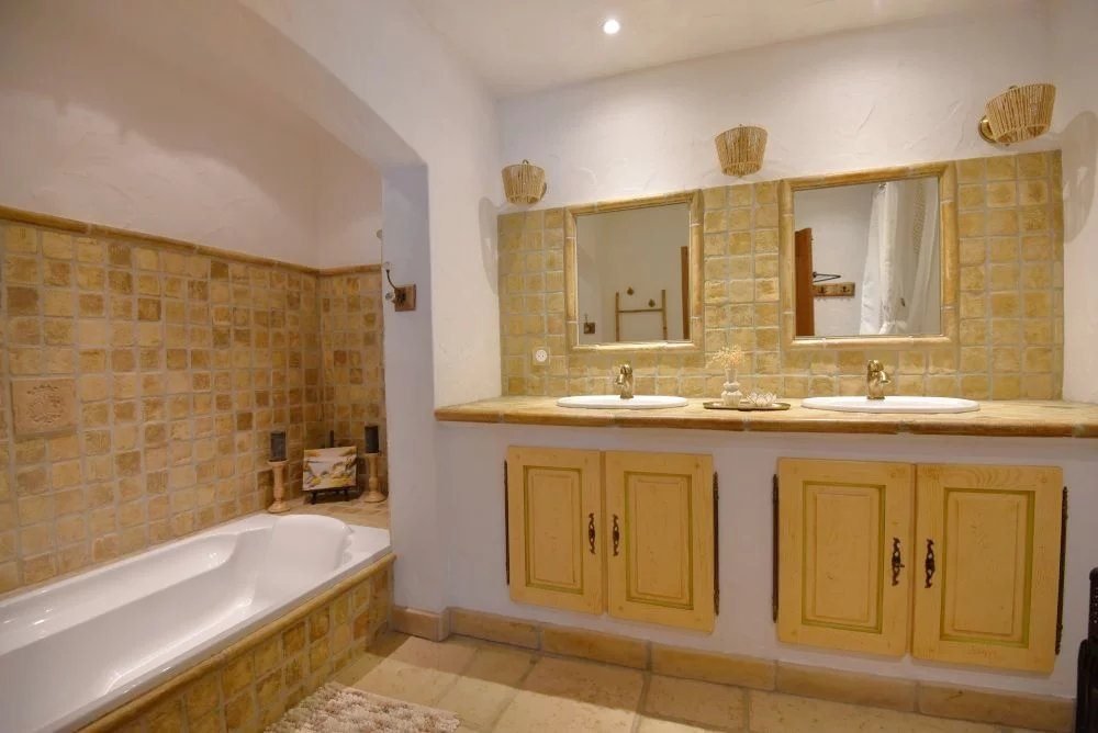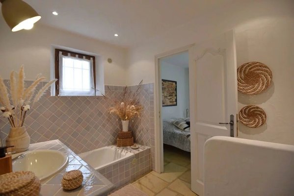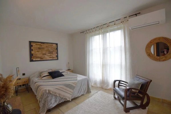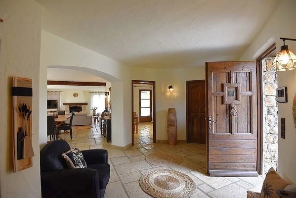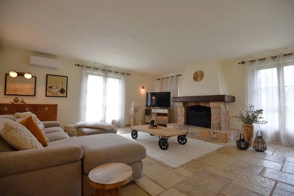 Beim Betreten offenbart das Haus eine warme und authentische Atmosphäre. Das Wohnzimmer, lichtdurchflutet und mit einem schönen Steinkamin ausgestattet, lädt zu gemütlichen Abenden im Familien- oder Freundeskreis ein. Die zahlreichen Öffnungen schaffen eine echte Kontinuität zwischen Innen- und Außenraum.