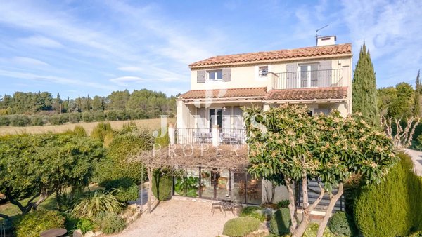 Außen erstreckt sich das gepflegte Gelände um einen Chlorpool 8 × 4 m, gesichert, ein Poolhaus, eine geschlossene Garage von 30 m² sowie ein Bouleplatz.