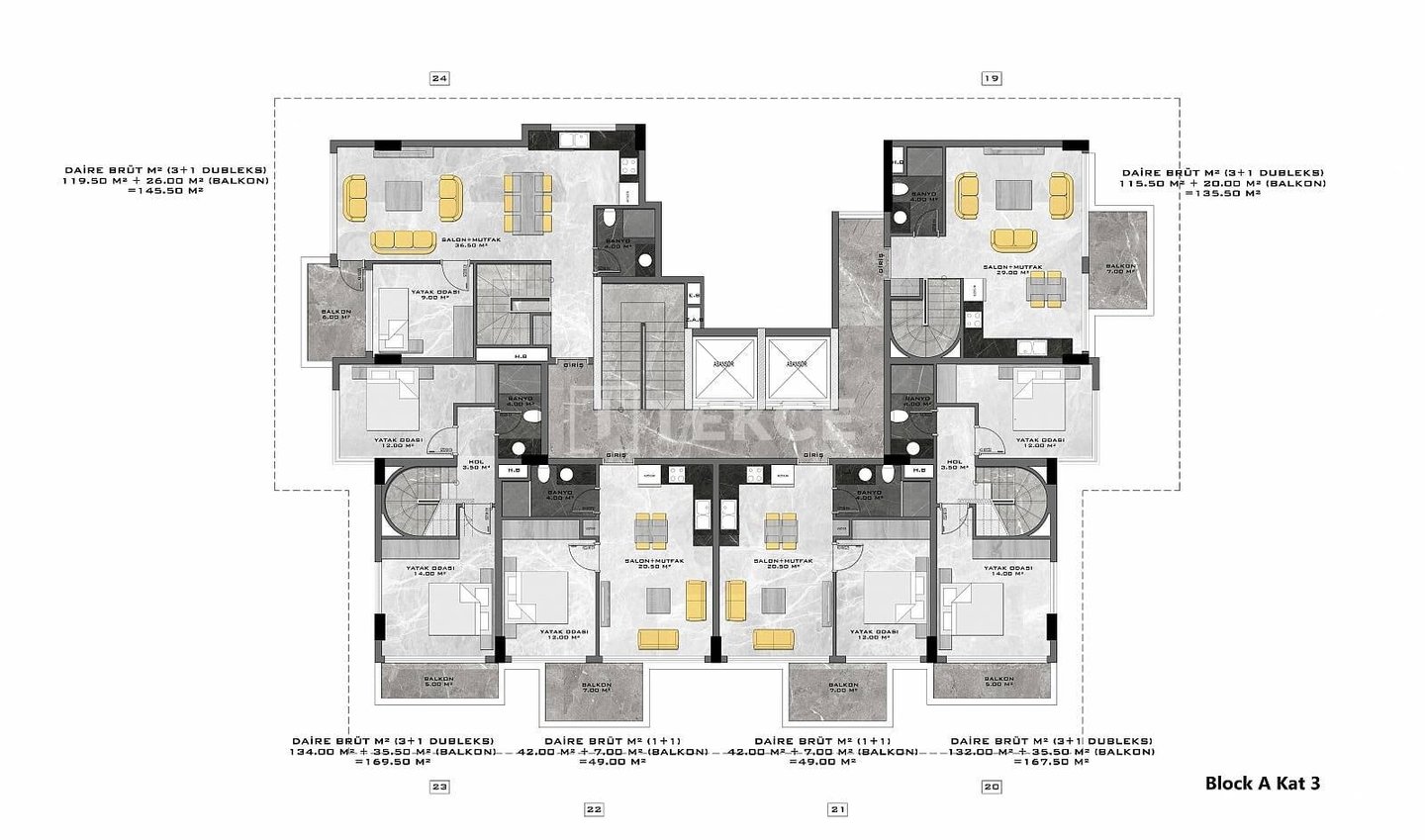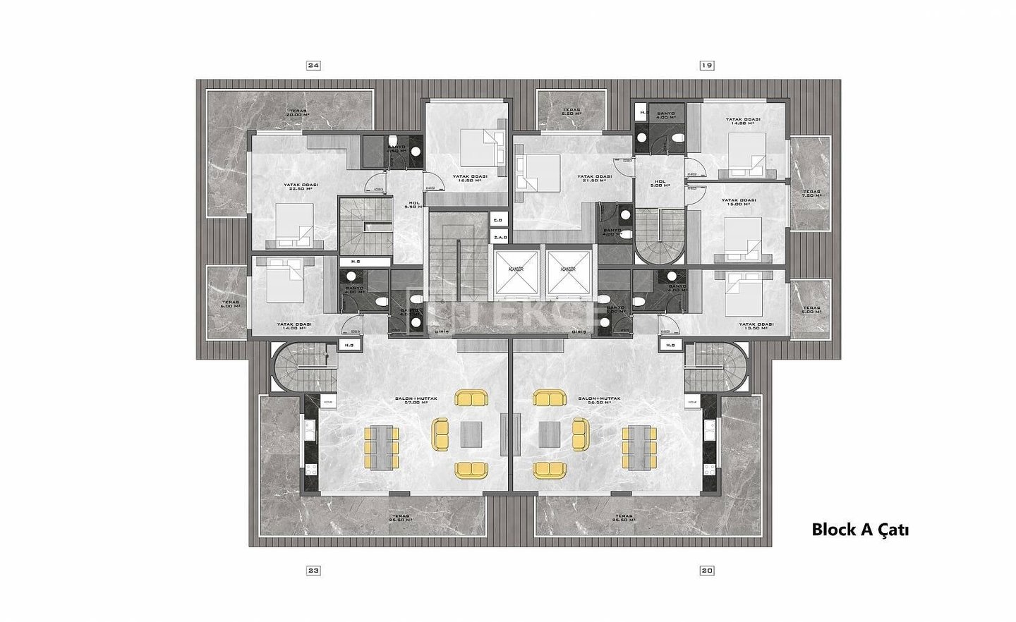 Wohnungen in einem Premium-Komplex mit schickem Design in Alanya Kargıcak & 13 Alanya ist einer der idealsten Orte für Investitionen und Urlaub im Mittelmeerraum. Alanya bietet ein sonniges Klima, natürliche und historische Schönheiten, soziale Annehmlichkeiten und lange Strände. Kargıcak ist eine Küstenstadt in Alanya, die eine breite Palette von täglichen und sozialen Annehmlichkeiten bietet. & 13 Die Wohnungen zum Verkauf in Alanya befinden sich 1,8 km vom Strand, 15 km vom Zentrum von Alanya, 25 km vom Flughafen Gazipaşa und 130 km vom Flughafen Antalya entfernt. & 13 Der Komplex mit 3 Blöcken und 6 Etagen verfügt über einen beheizten Außen- und Innenpool, einen Außen- und Innenparkplatz, ein türkisches Bad, eine Sauna, einen Massageraum und ein Dampfbad. Das Projekt umfasst außerdem ein zentrales Satellitensystem, Aufzüge, doppelt verglaste PVC-Fenster, Stahltüren, spezielle Design-Innentüren, Granit-Keramikböden, Isolierung, thermische Außenverkleidungen und einen Scheinwerfer. & 13 Das Projekt bietet verschiedene Wohnungstypen, darunter Gartengeschosse und Dachgeschosse. Die Wohnungen werden mit Küchenschränken, Granitarbeitsplatten, Keramikböden in den Badezimmern, Warmwasserbereitern und Duschkabinen geliefert. & 13 Ayt-03090