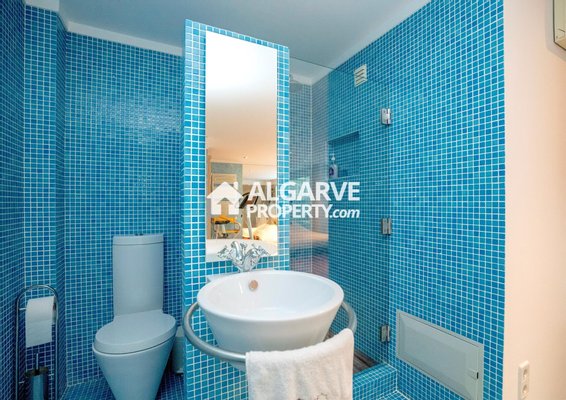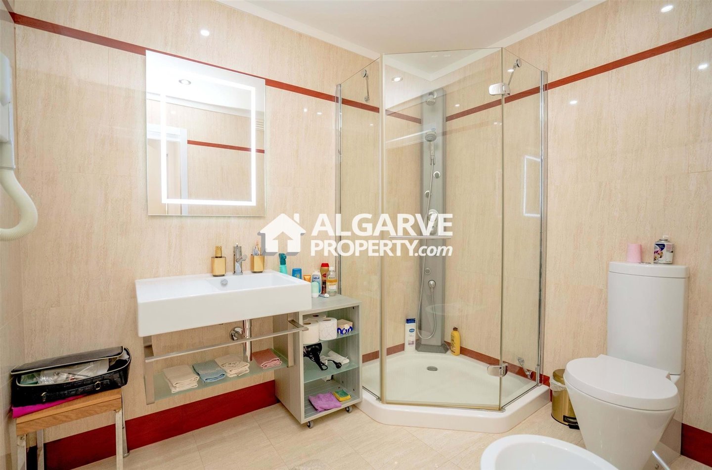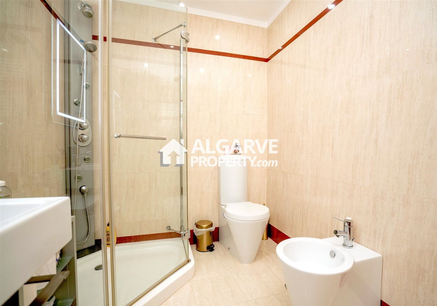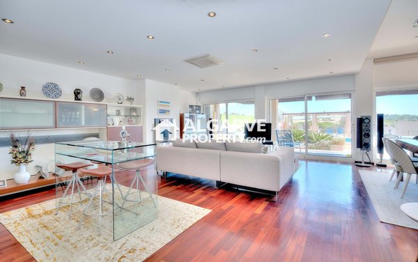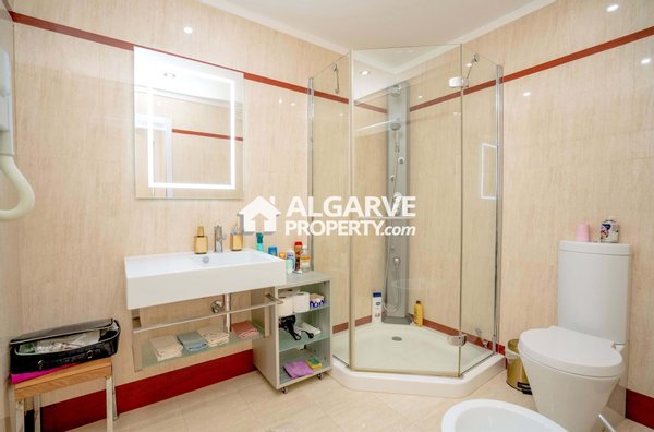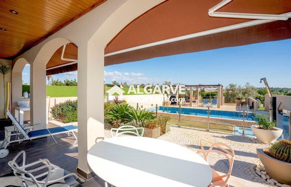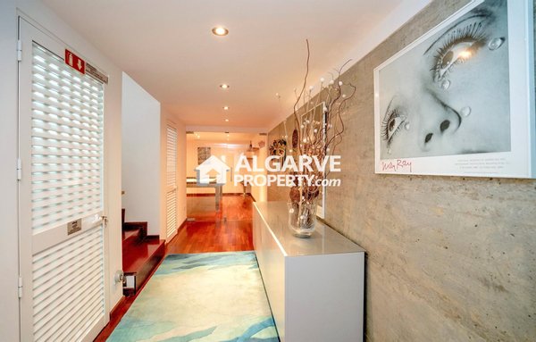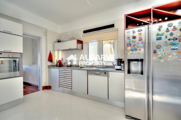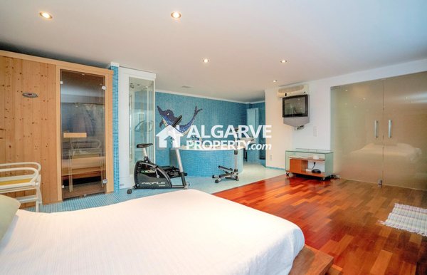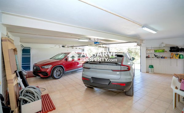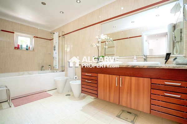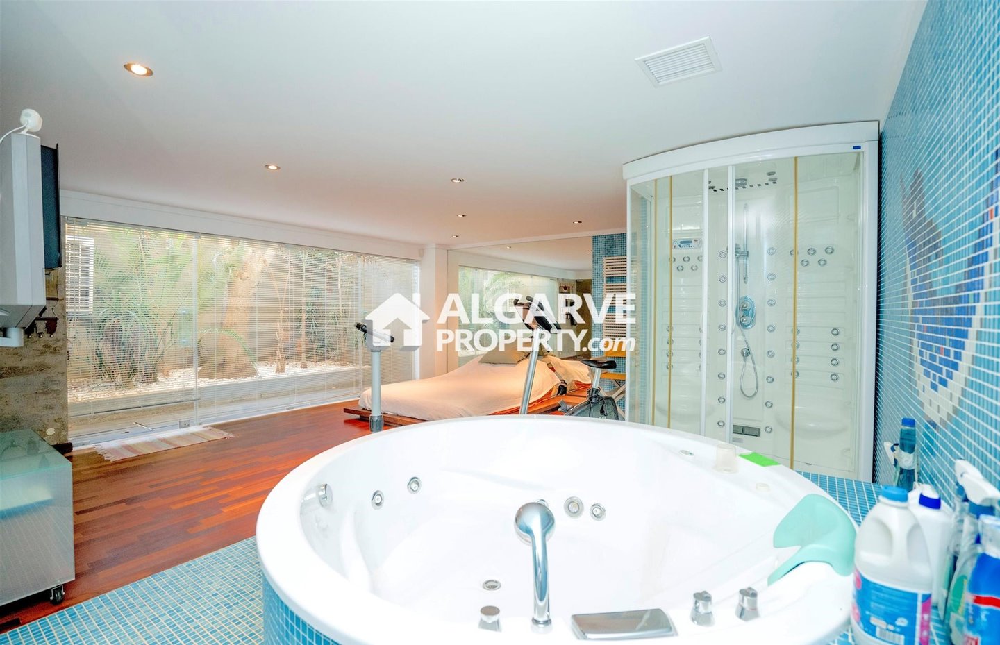Fabelhaftes Doppelhaushälfte-V3+1, exzellent gelegen in einer ruhigen Wohngegend in Vilamoura. In der Nähe aller Annehmlichkeiten und mehrerer Golfplätze. 4,5 km vom Yachthafen und Strand entfernt. Grundstücksgröße 475 m2 mit 394 m2 Baufläche. Innen besteht das Haus aus einem großzügigen Wohnzimmer mit Kamin und viel natürlichem Licht, einer vollständig ausgestatteten dänischen Küche „Hth“, zwei en-suite Schlafzimmern, wobei das Hauptschlafzimmer über einen großen Ankleidebereich verfügt, einem weiteren Schlafzimmer/Büro und einem Badezimmer. Außerdem gibt es einen großen Keller mit automatischer Belüftung, einen Spielsaal/Kinozimmer oder möglichen zusätzlichen Raum, eine Wäscherei, ein Badezimmer und ein Fitnessraum mit Jacuzzi, Sauna und Dampfbad mit natürlichem Licht und Wintergarten. Große Terrassen mit motorisierten Markisen und einer optimalen Sonnenausrichtung. Schöne moderne Oberflächen (Decks und Jatobá-Holz, Edelstahl-Außentüren, draußen verlegte Holzverkleidungen, LED-interne/extern regulierbare Beleuchtung). Privater hydraulischer Aufzug vom Keller. Das Haus ist ausgestattet mit Klimaanlage in allen Räumen, Doppelglas mit Aluminiumlamellen, farbiger Gegensprechanlage, Außen-Soundsystem „Bang & Olufsen“ auf den Terrassen, Video- und Tonanlage in allen Räumen, sowie Einbruch-/Brand-/Gasalarm mit Anbindung an eine Zentrale. Privater Garten mit Pool und BBQ-Bereich. Der Pool ist mit dem Soundsystem des Hauses verbunden und verfügt über einen integrierten Unterwasserlautsprecher. Garage für 3 Autos. Panoramablick über Felder und Meer. Gutes Investitionsangebot. Einen Besuch wert. - Ami: 2196 - T.