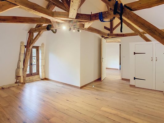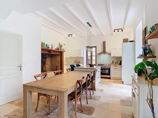 Authentische Elemente, wie sichtbare Balken und der Cantou (traditioneller Kamin) in der Küche, sind erhalten geblieben und sorgen für eine harmonische Balance zwischen historischem Charme und modernem Komfort.