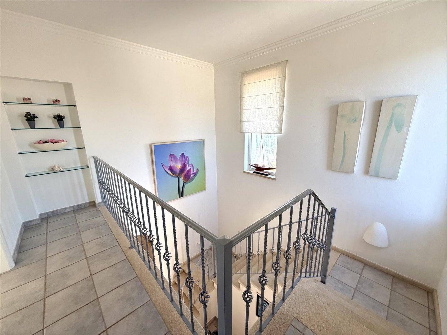 Eleganter Treppenaufgang zum sehr großen Hauptschlafzimmer mit begehbarem Kleiderschrank, riesigem Badezimmer und Terrassentüren, die zu einem Balkon mit Blick auf den Garten führen