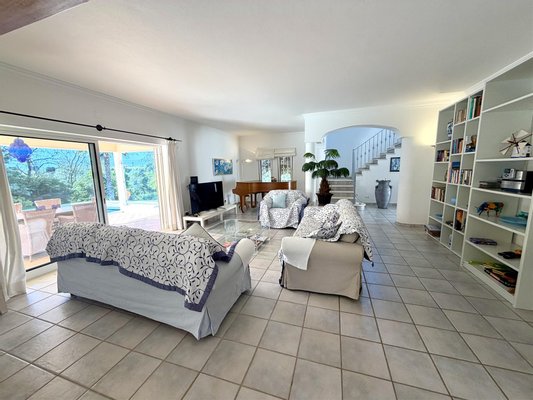 Wohnzimmer mit Patio, das zu überdachten Terrassen führt und herrliche Aussicht auf den Garten und den Swimmingpool bietet