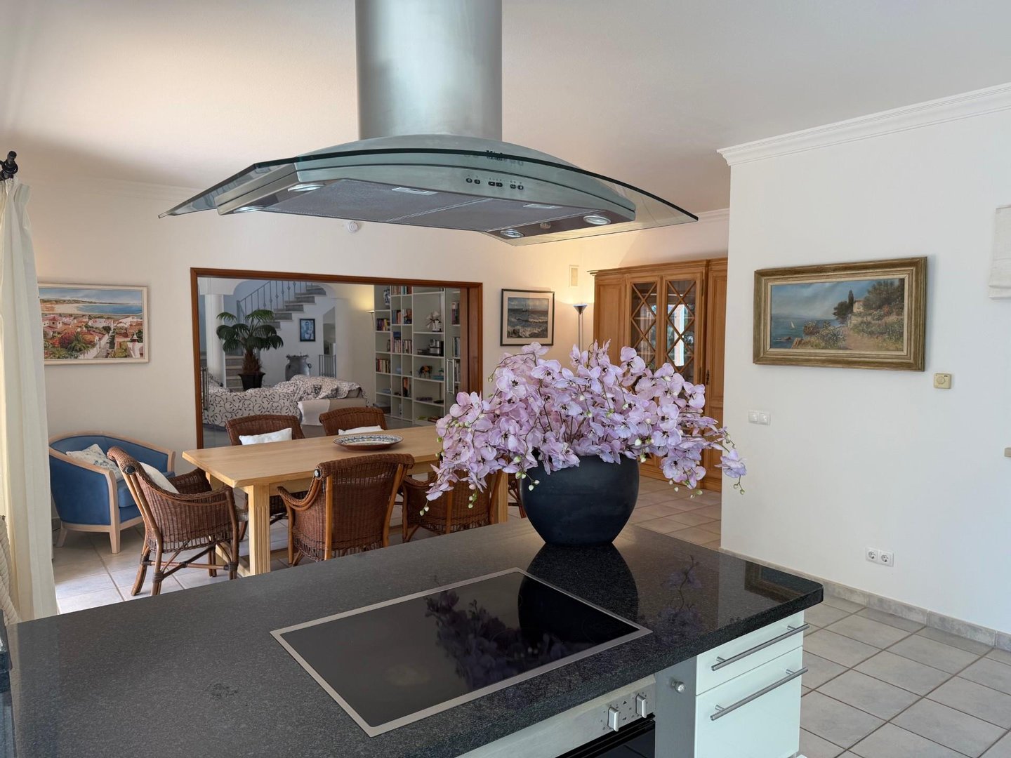 Das Wohnzimmer öffnet sich durch Glasschiebetüren zu einem separaten Essbereich mit Terrassentüren, die zu Terrassen führen, sowie zu einer geräumigen Einbauküche, die ebenfalls Zugang zu einer Außenterrasse hat