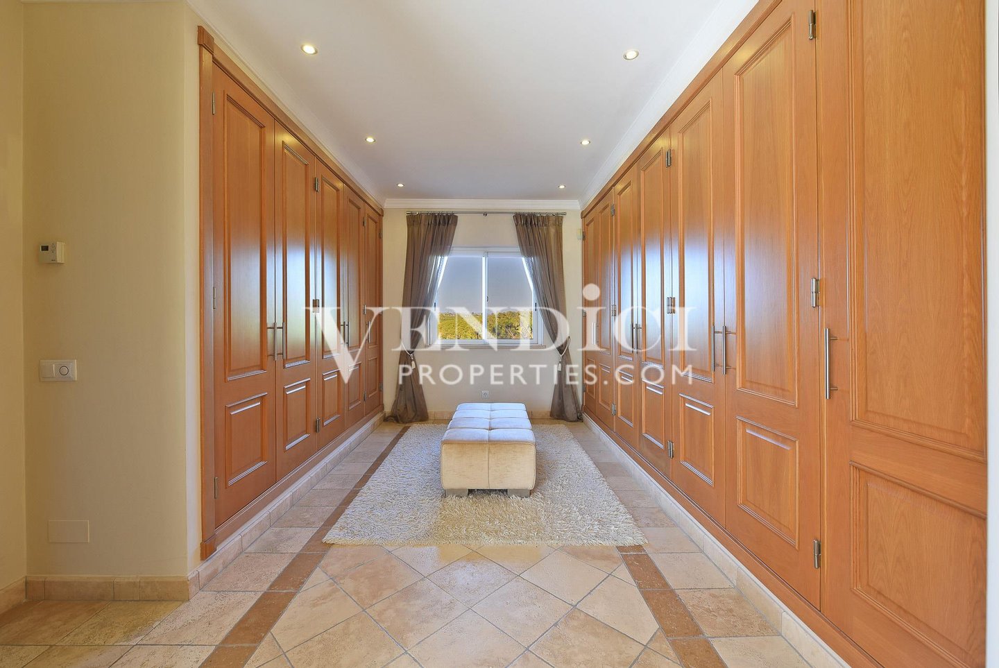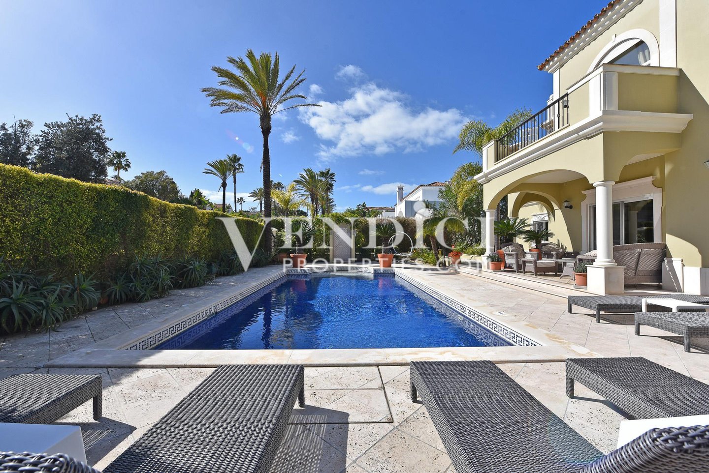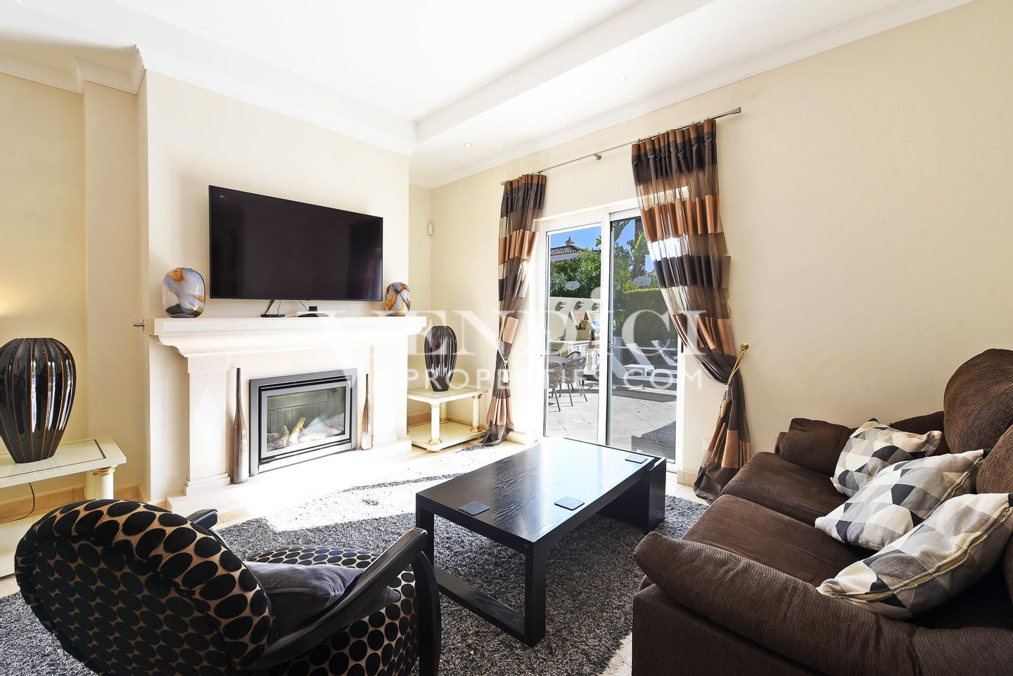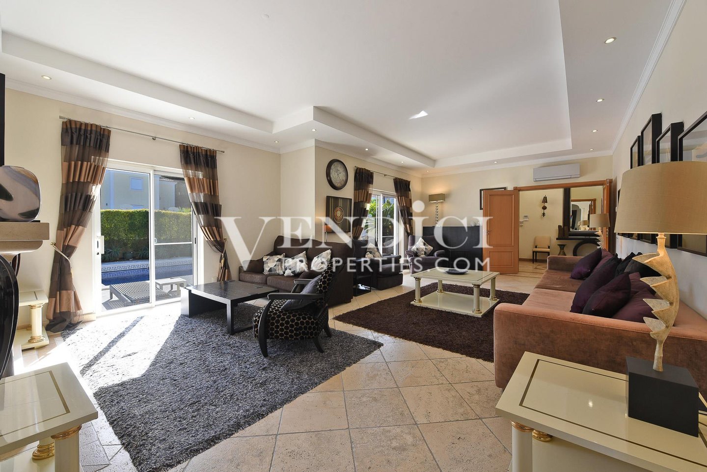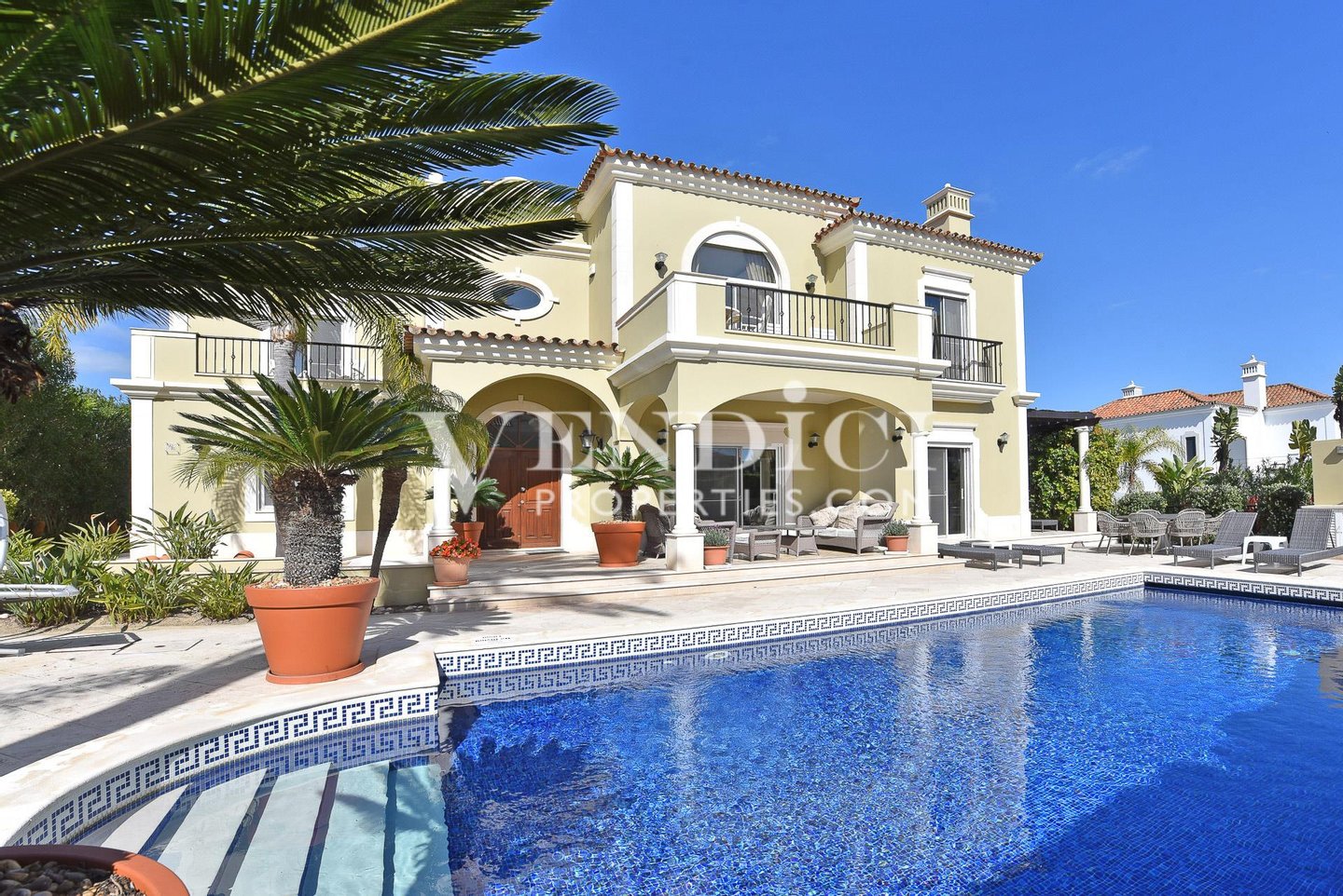 Eine dramtische zweigeschossige Eingangshalle mit traditionellen portugiesischen Fliesen führt zum großzügigen Wohnbereich, der mit einem Gas-Kamin ausgestattet ist und sich direkt auf die sonnenverwöhnte Poolterrasse öffnet – eine nahtlose Verbindung von Innen- und Außenwohnen.