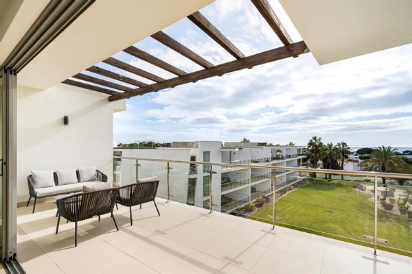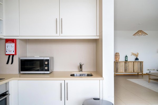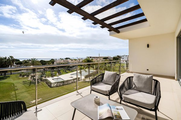 Modernes Apartment mit Meerblick in einer Touristenanlage mit privilegierter Lage, nur 600 Meter vom Strand entfernt. Die Wohnung besteht aus einer voll ausgestatteten offenen Küche/Kochnische, einem großzügigen und hellen Wohn- und Essbereich, einem
