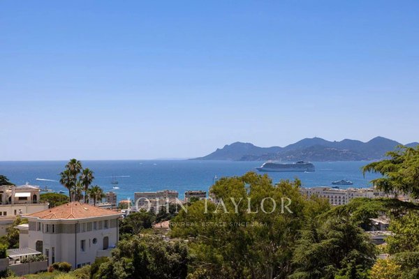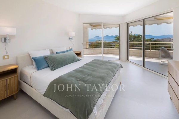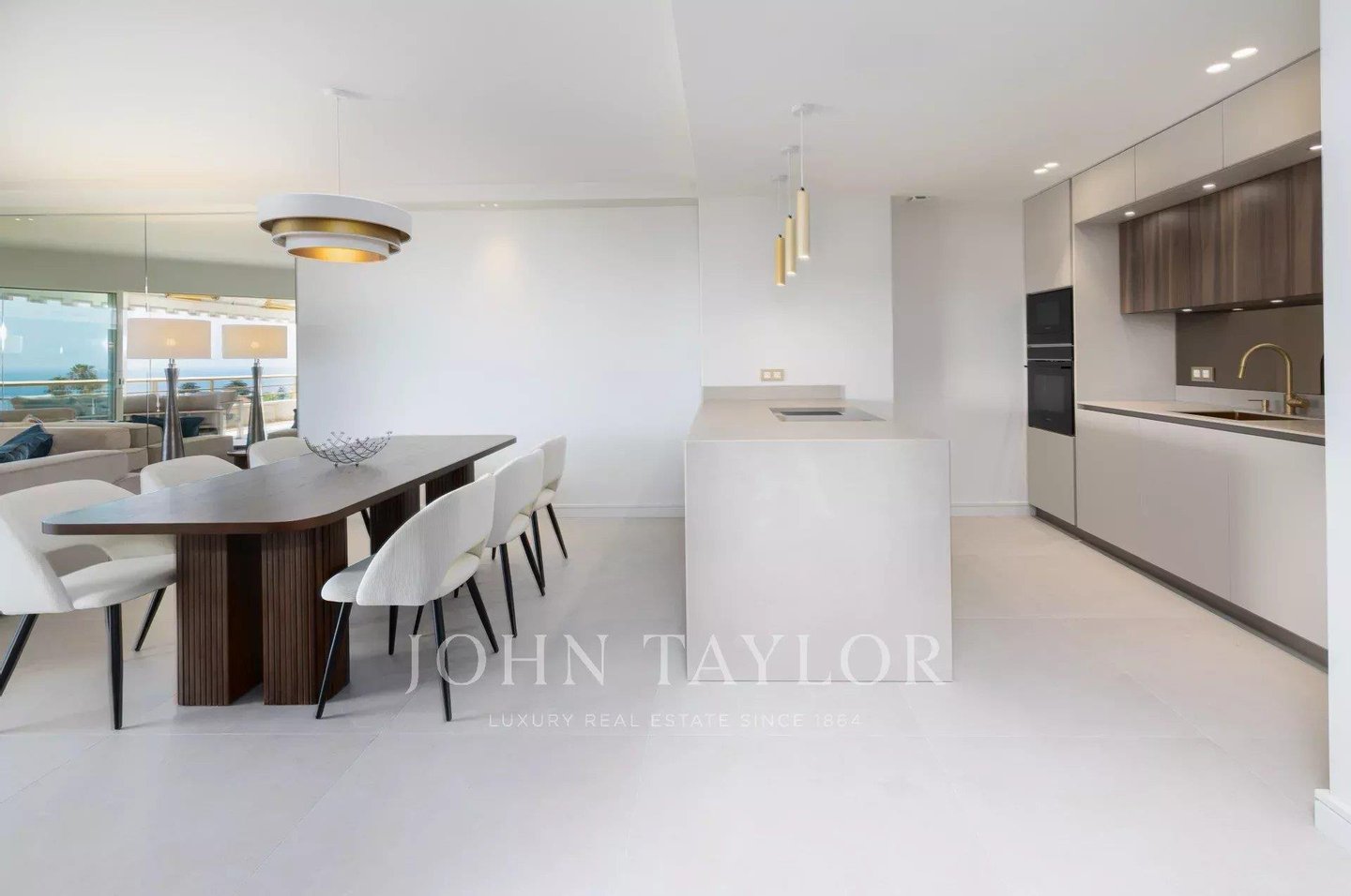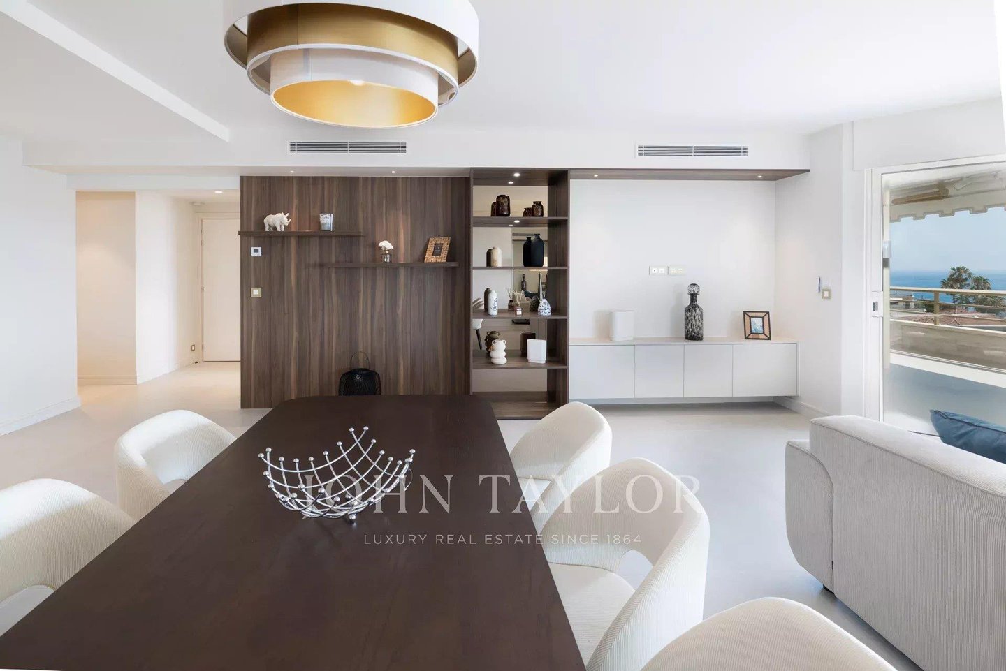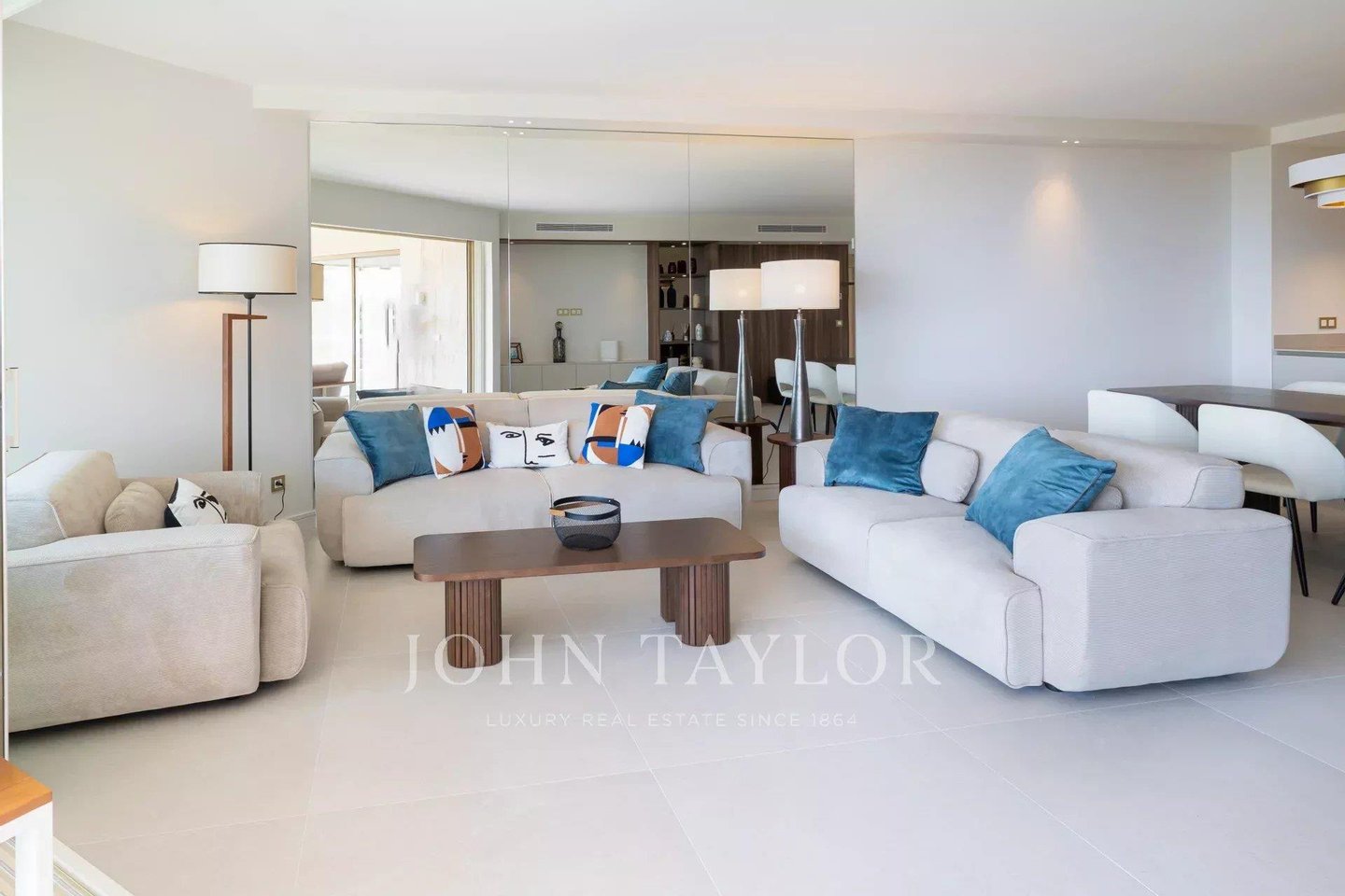 In einer exklusiven Wohnanlage mit Pool und Garten bietet diese ausgesprochen schöne ca. 130 m² große, durchgehend belichtete Wohnung in erhöhter Etage panoramischen Meerblick bis zur Pointe Palm Beach und zum Esterel. Die Immobilie umfasst einen