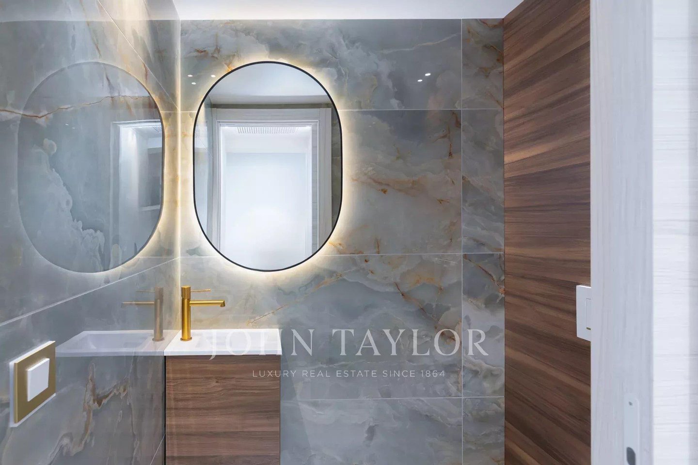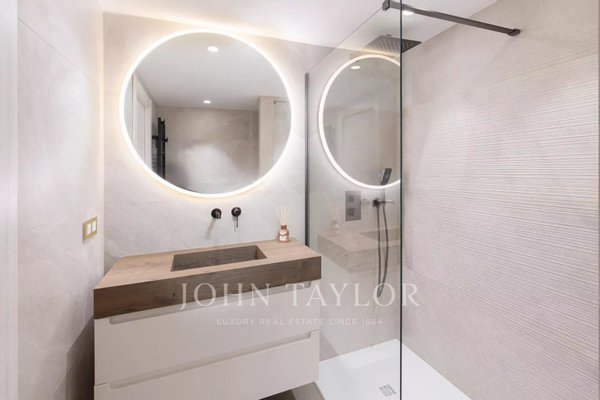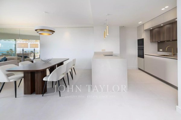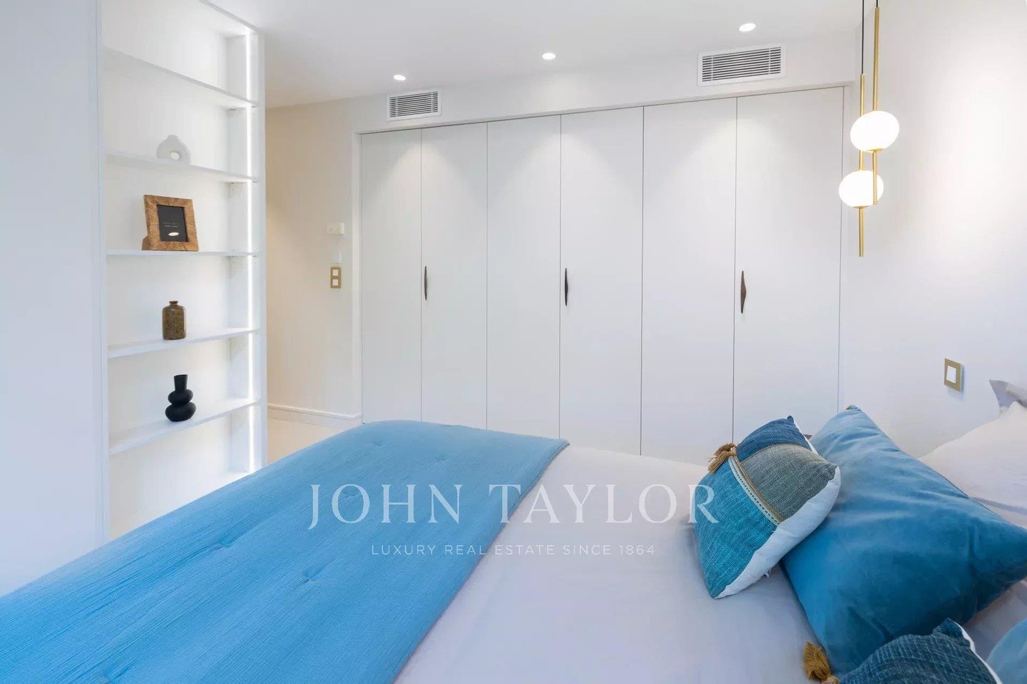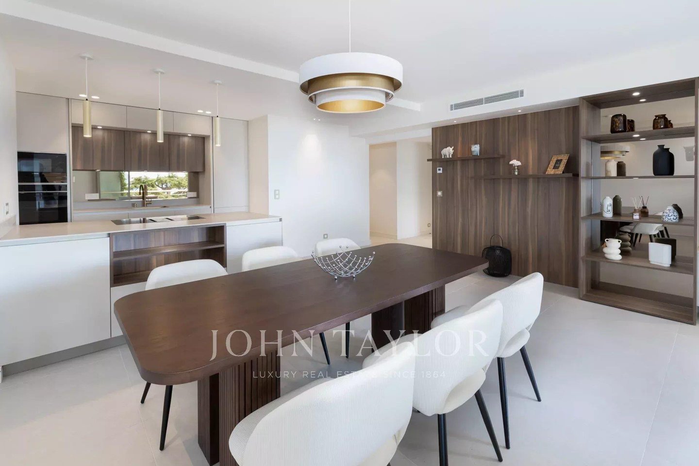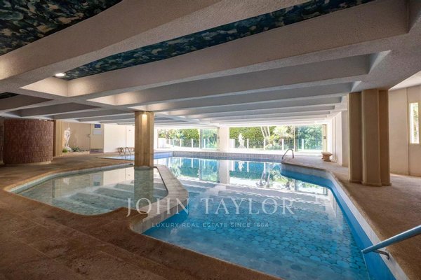 In einer exklusiven Wohnanlage mit Pool und Garten bietet diese ausgesprochen schöne ca. 130 m² große, durchgehend belichtete Wohnung in erhöhter Etage panoramischen Meerblick bis zur Pointe Palm Beach und zum Esterel. Die Immobilie umfasst einen Flur mit Zugang zu einem großen Wohnraum, eine 22 m² Eckterrasse, eine vollständig ausgestattete offene Küche, 3 schöne en-suite Schlafzimmer, Arbeitsbereich und Hauswirtschaftsraum, WC, Ankleidezimmer. Geräumig und hell, profitiert diese Wohnung von den Annehmlichkeiten einer gehobenen Residenz mit Überwachungskameras. Tiefgaragenplatz im Untergeschoss.
