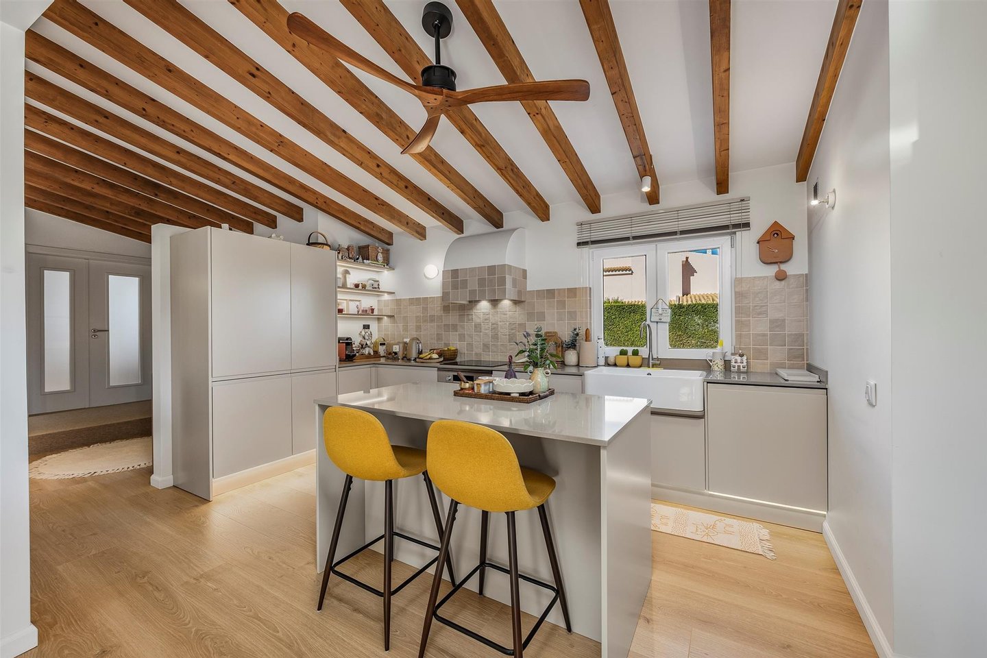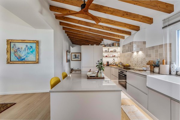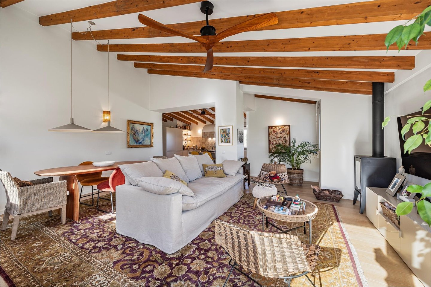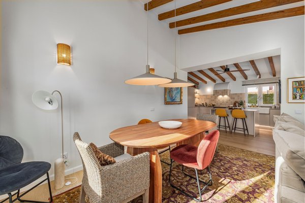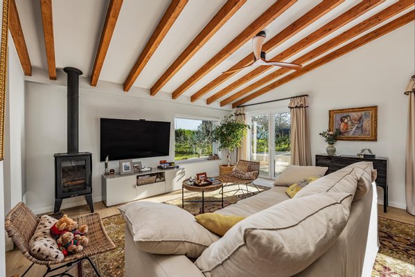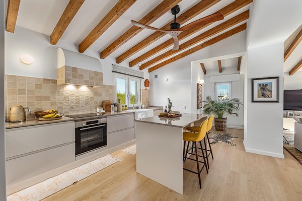 Der einladende Eingang führt in einen hellen, großzügigen offenen Wohn- und Essbereich, in dem natürliches Licht und Wärme im Mittelpunkt stehen. Ein charmantes Holzofen, Klimaanlage und Deckenventilatoren sorgen ganzjährig für Komfort und schaffen eine einladende Atmosphäre zum Entspannen und Geselligkeit. Die elegante, vollständig ausgestattete Küche mit zentraler Insel ist ideal zum Kochen, Gästeempfangen und gemeinsamen Erinnerungen schaffen.
