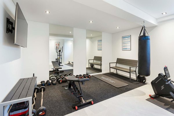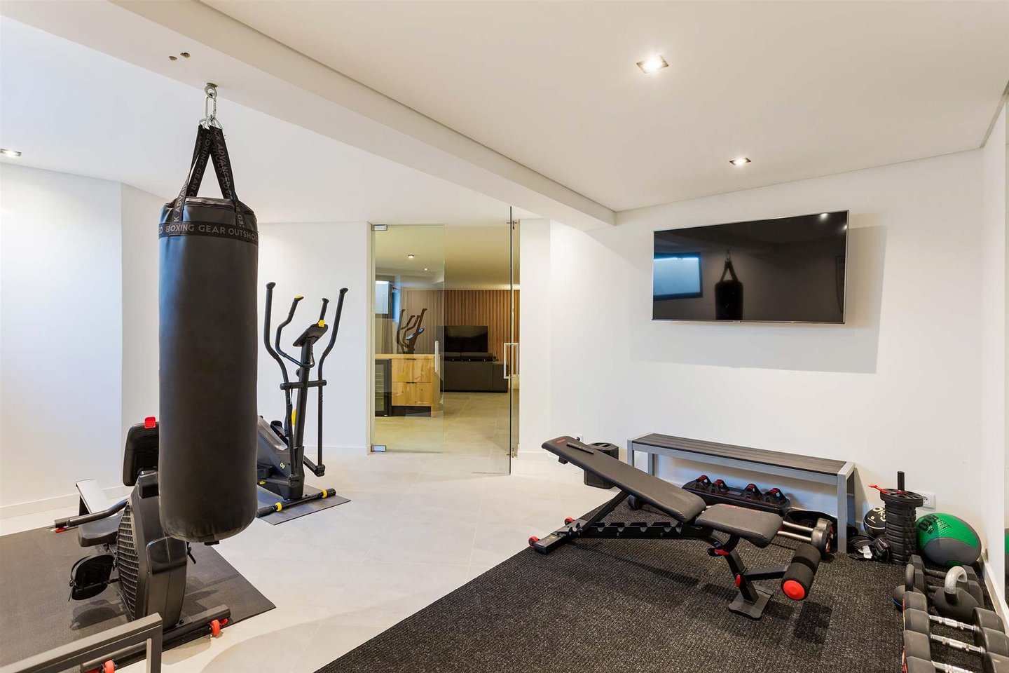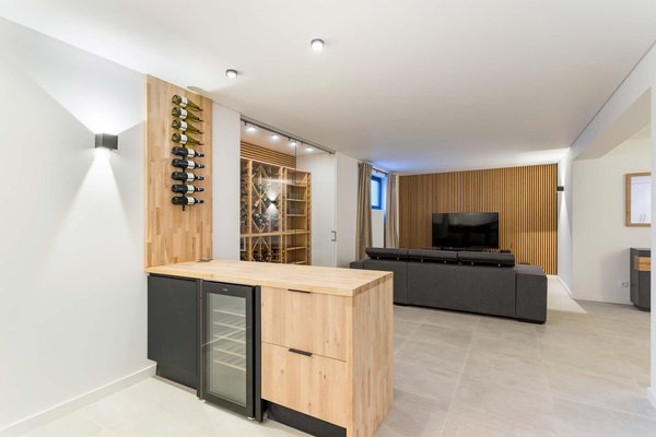 Schließlich wurde der Keller ausgebaut und umfasst ein Büro, einen Abstellraum, ein zweites Wohnzimmer mit elegantem Weinkeller und einen ausgestatteten Fitnessraum.