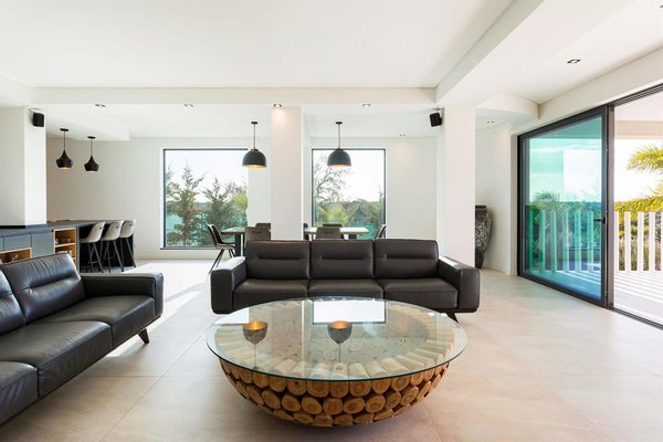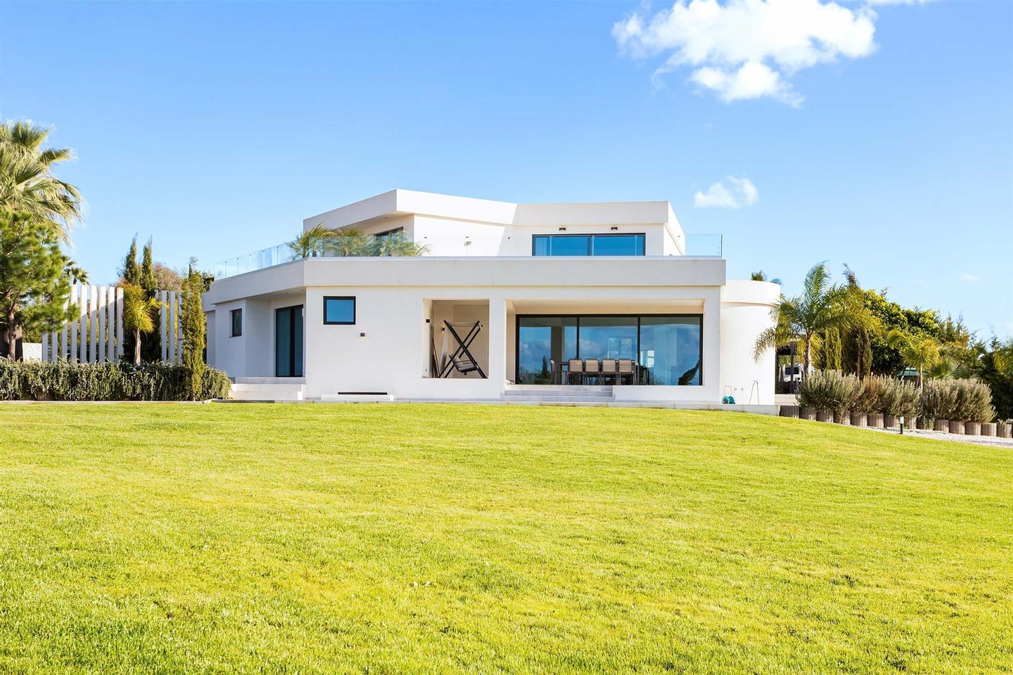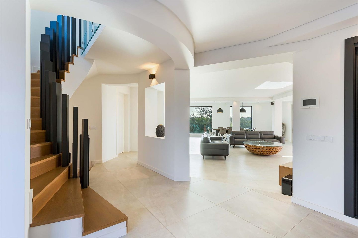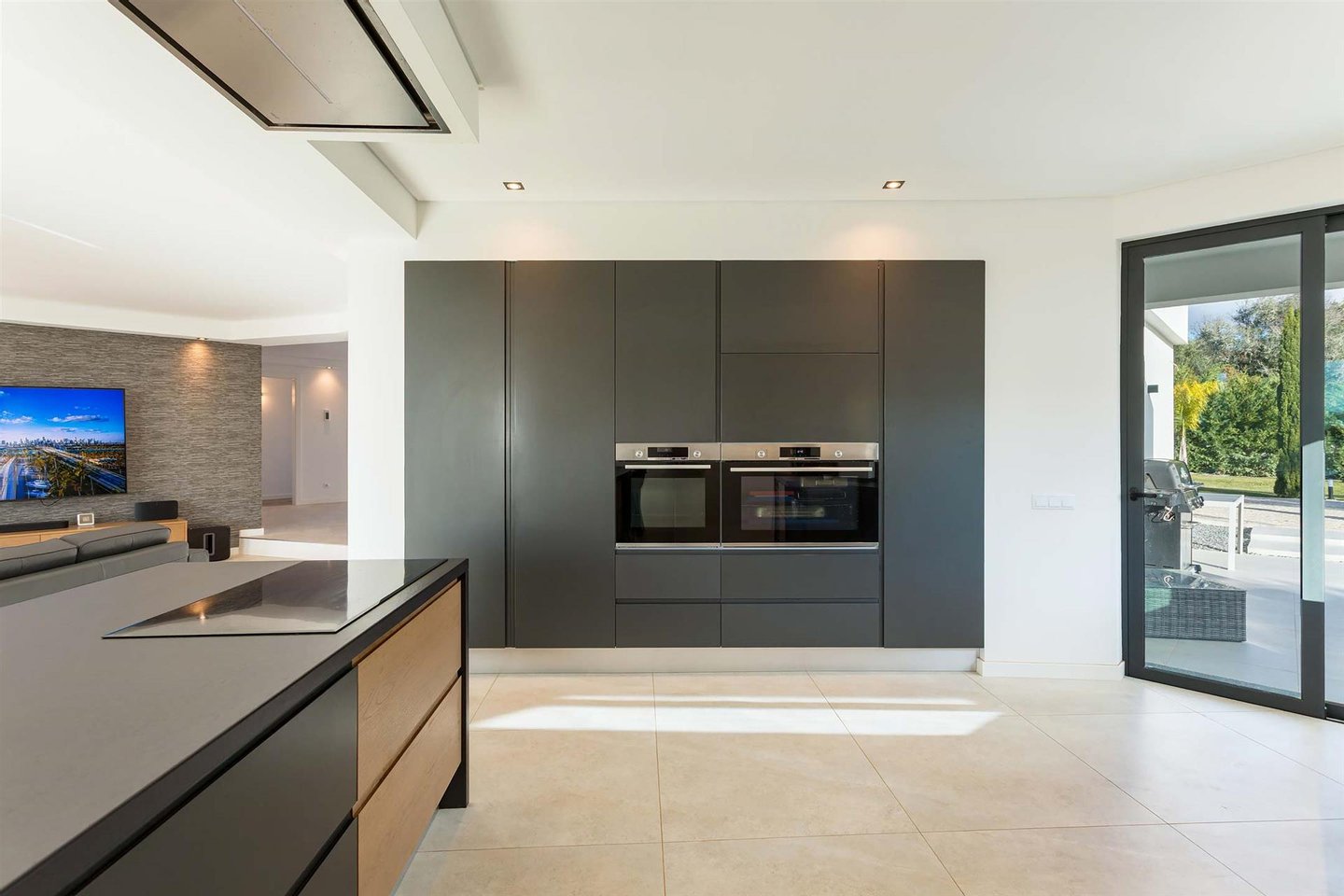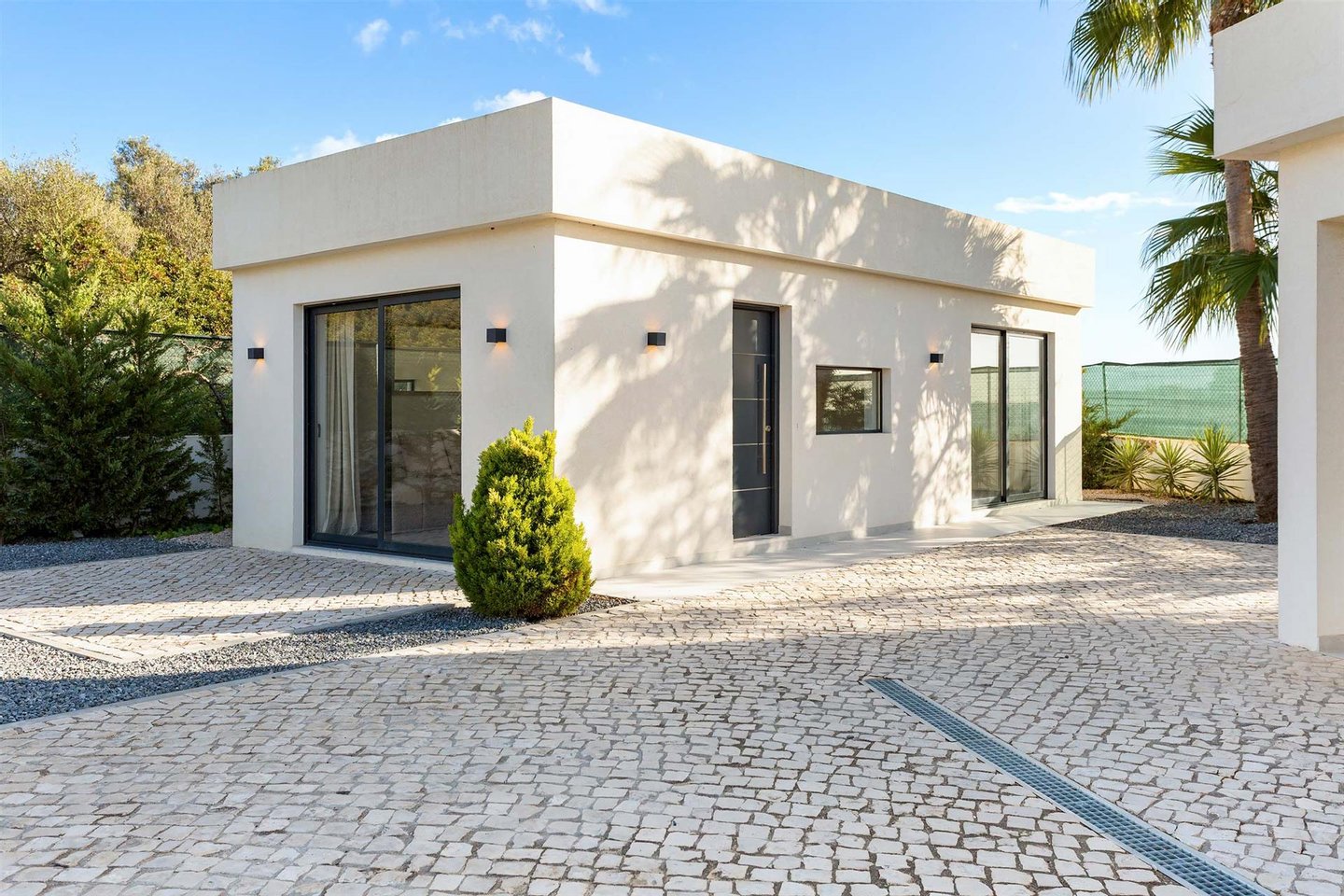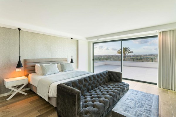 Die Haupvilla hat eine Gesamtfläche von 563 m² und erstreckt sich über drei Etagen, die durch eine elegante zentrale Treppe verbunden sind. Im Erdgeschoss führt der helle Flur zu zwei Schlafzimmern mit en-suite-Bädern (eins davon mit Ankleidezimmer) und zu einem großen offenen Raum, der Wohnzimmer, Essbereich und eine vollständig ausgestattete Küche umfasst, gefertigt von einem Meisterhandwerker mit einer Zentralinsel von über 5 Metern Länge, sowie ein Gäste-WC. Dieser Bereich bietet außerdem Zugang zu einer überdachten Terrasse, ideal, um den Sonnenuntergang zu bewundern, sowie direkten Zugang nach draußen.
