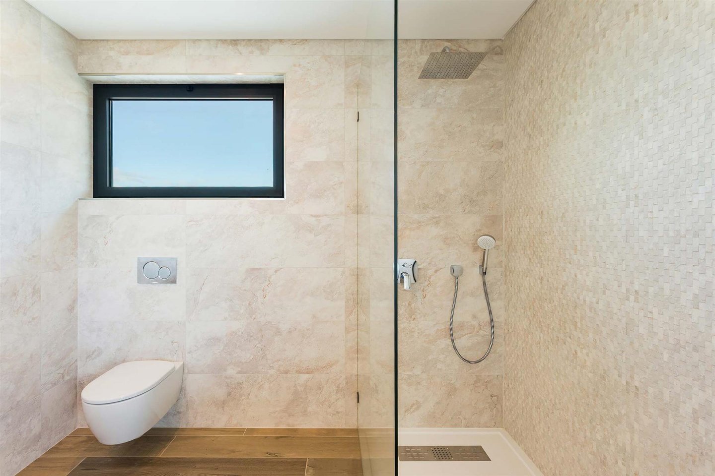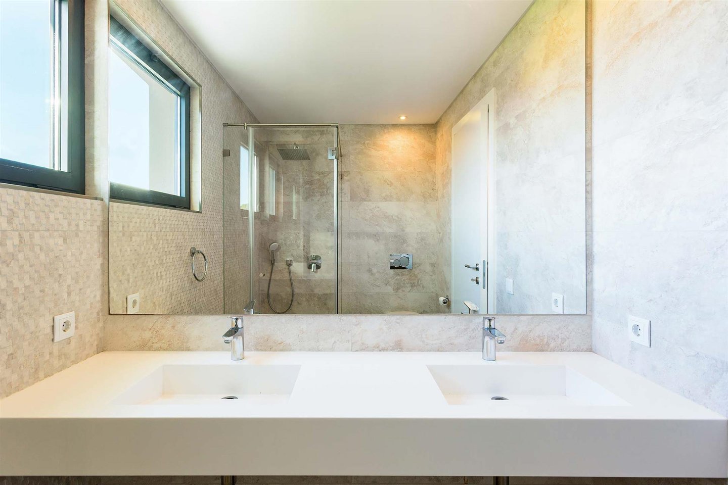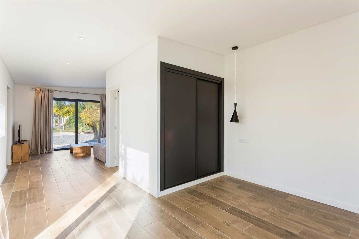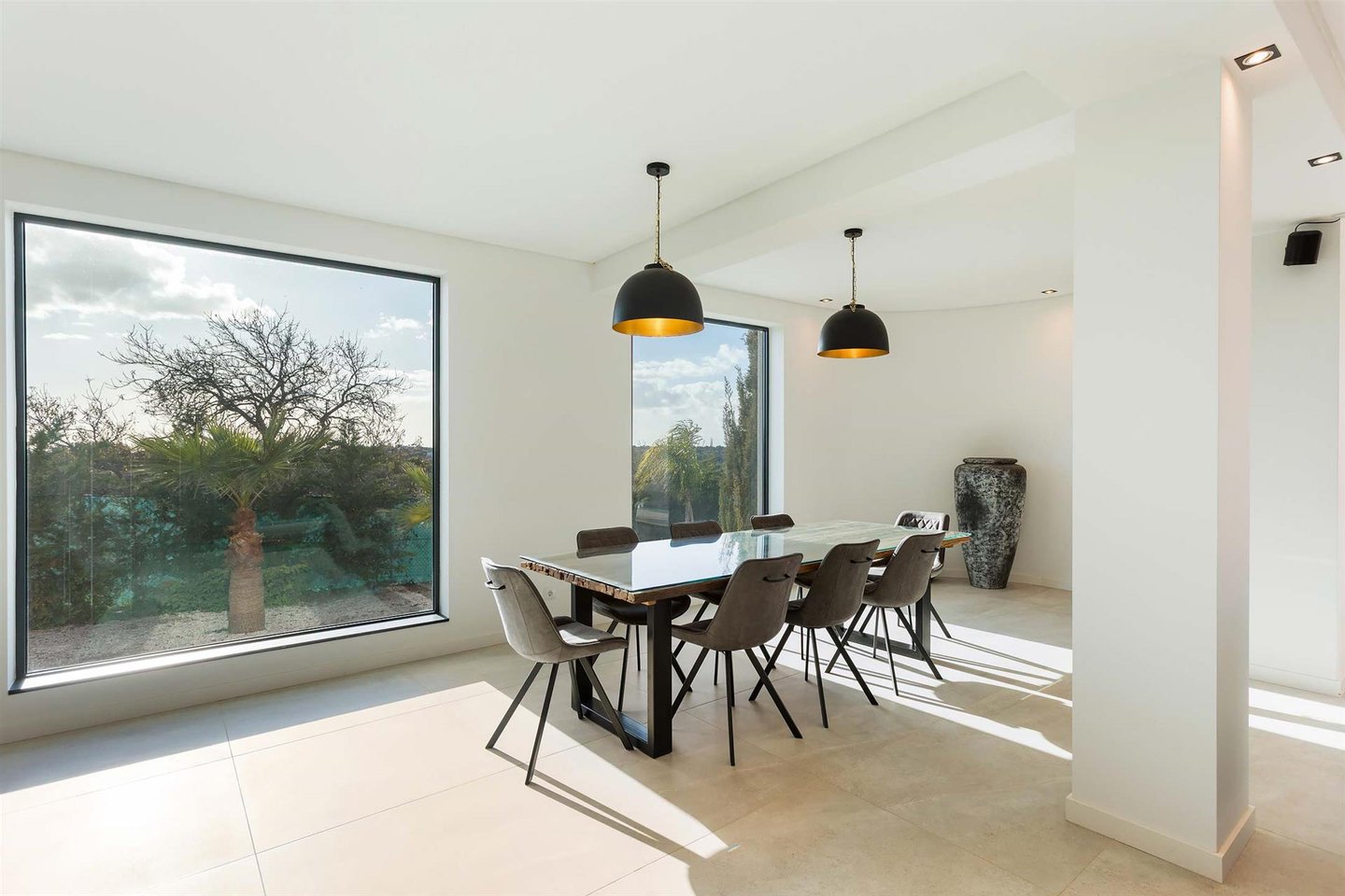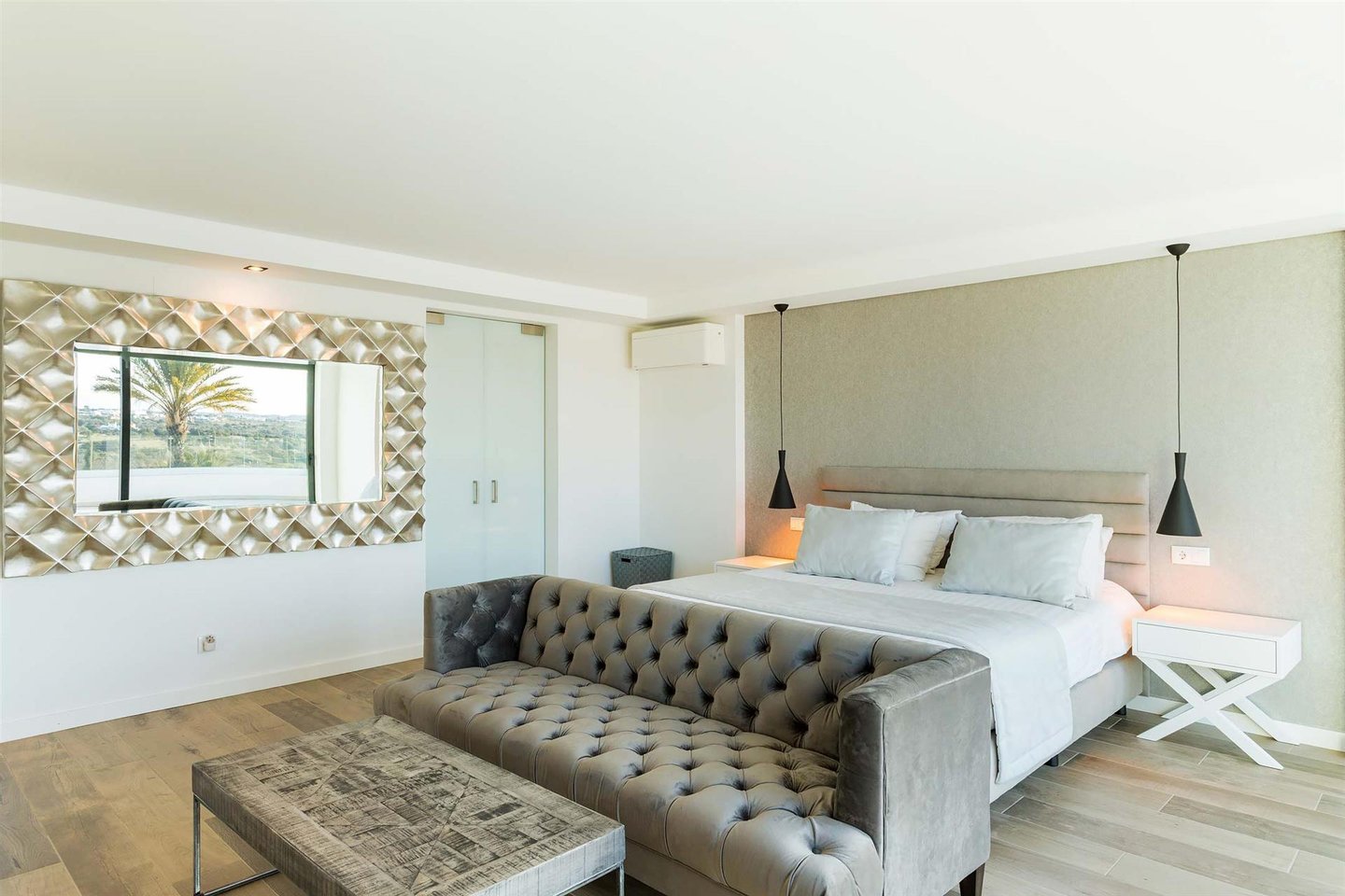 Die Haupvilla hat eine Gesamtfläche von 563 m² und erstreckt sich über drei Etagen, die durch eine elegante zentrale Treppe verbunden sind. Im Erdgeschoss führt der helle Flur zu zwei Schlafzimmern mit en-suite-Bädern (eins davon mit Ankleidezimmer) und zu einem großen offenen Raum, der Wohnzimmer, Essbereich und eine vollständig ausgestattete Küche umfasst, gefertigt von einem Meisterhandwerker mit einer Zentralinsel von über 5 Metern Länge, sowie ein Gäste-WC. Dieser Bereich bietet außerdem Zugang zu einer überdachten Terrasse, ideal, um den Sonnenuntergang zu bewundern, sowie direkten Zugang nach draußen.