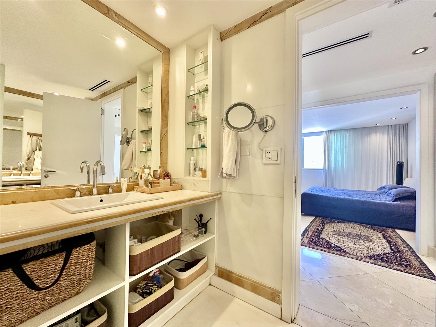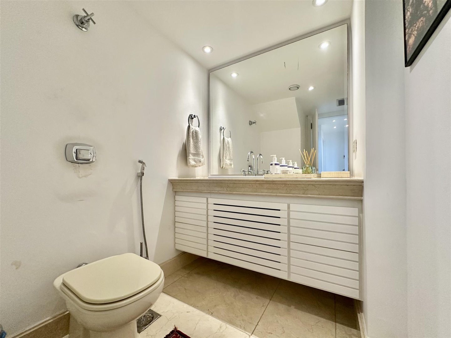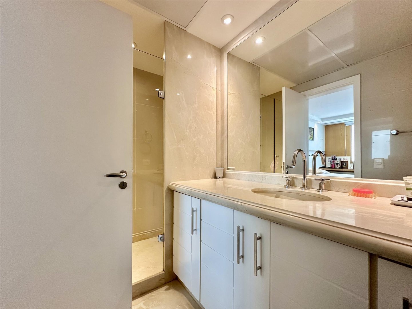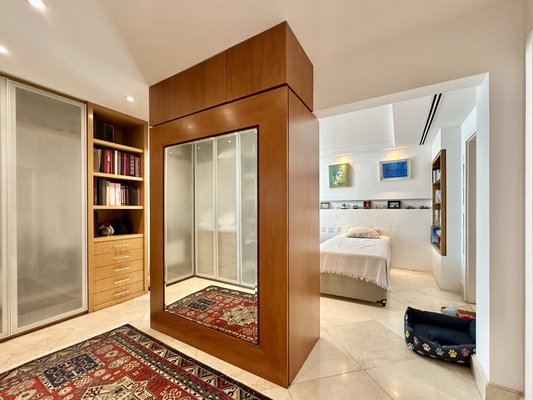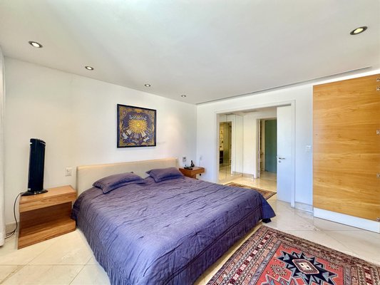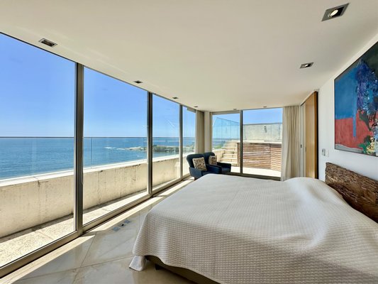 Im ersten Stock befindet sich der intime Bereich mit einer reservierten Master-Suite, einem Bad im Stil „Mr. und Mrs.“, sowie einem dritten Schlafzimmer mit Meerblick und einem vollständigen Gäste-WC, das auch die Terrasse bedient. Höhepunkt ist der Außenbereich mit einem erhöhten privaten Pool und offener Sicht auf den Horizont, ideal für Freizeit und Entertainment. Das Gebäude bietet 4 Stellplätze, Parkmöglichkeiten für Besucher, 24-Stunden-Concierge und eine exklusive Struktur mit wenigen Apartments pro Etage, was Sicherheit und Privatsphäre verstärkt.