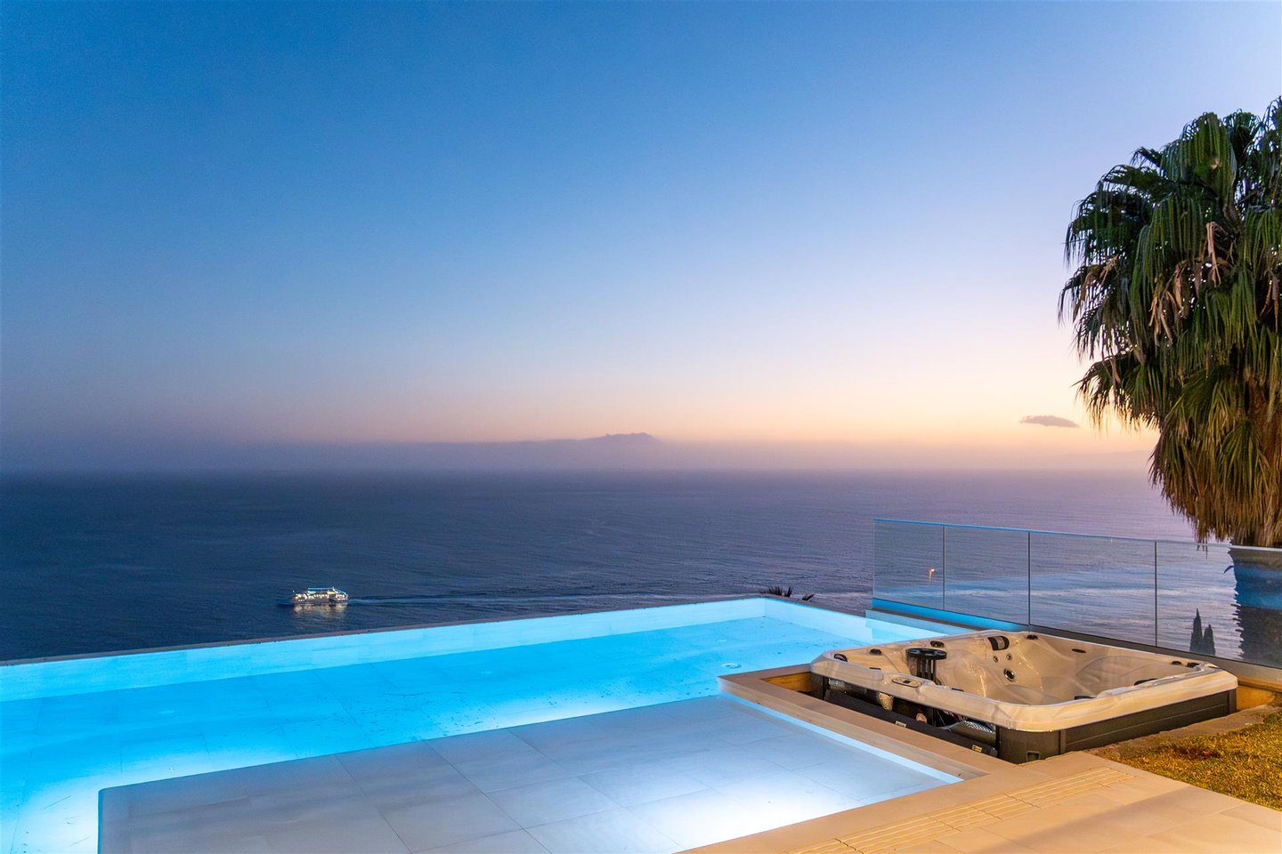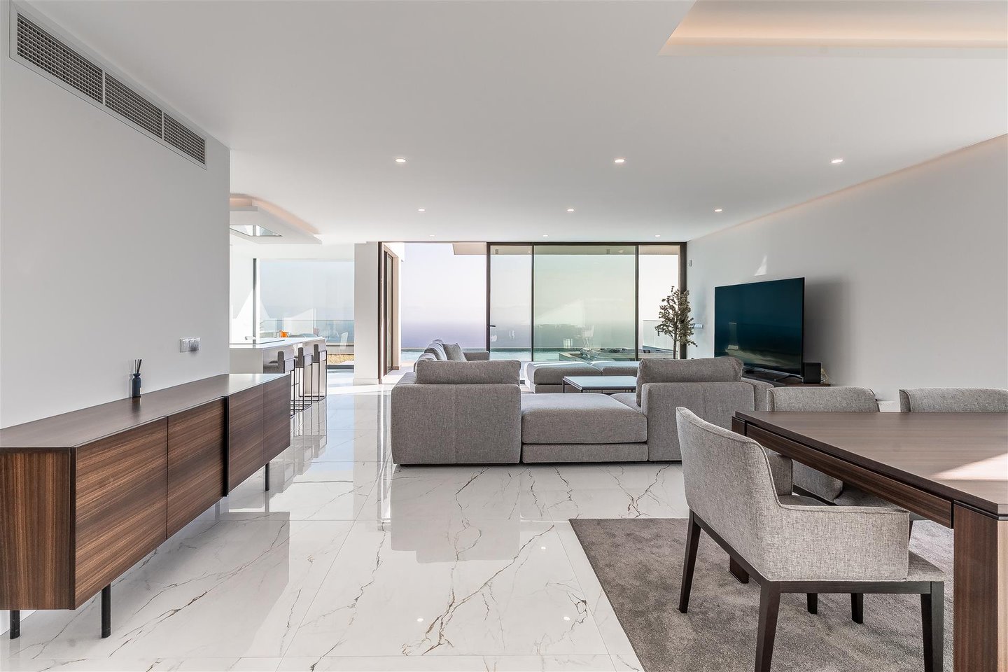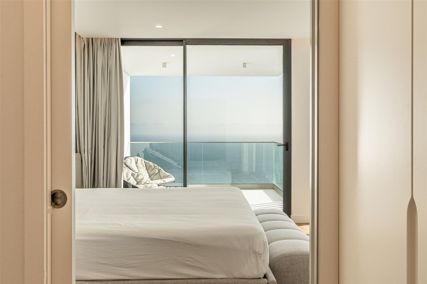 Die Hauptwohnung hat eine direkte und fließende Verbindung zum Außenbereich. Die Terrasse steht im Mittelpunkt; der Infinity-Ppool scheint sich mit dem Atlantik zu vereinen. Für die Abende sorgt der Feuerplatz für einen gemütlichen und eleganten Raum, perfekt zum Entspannen.