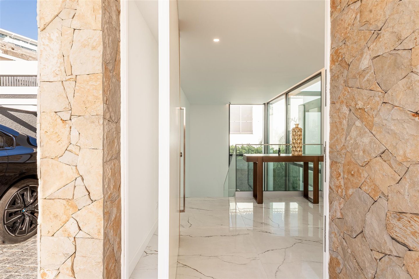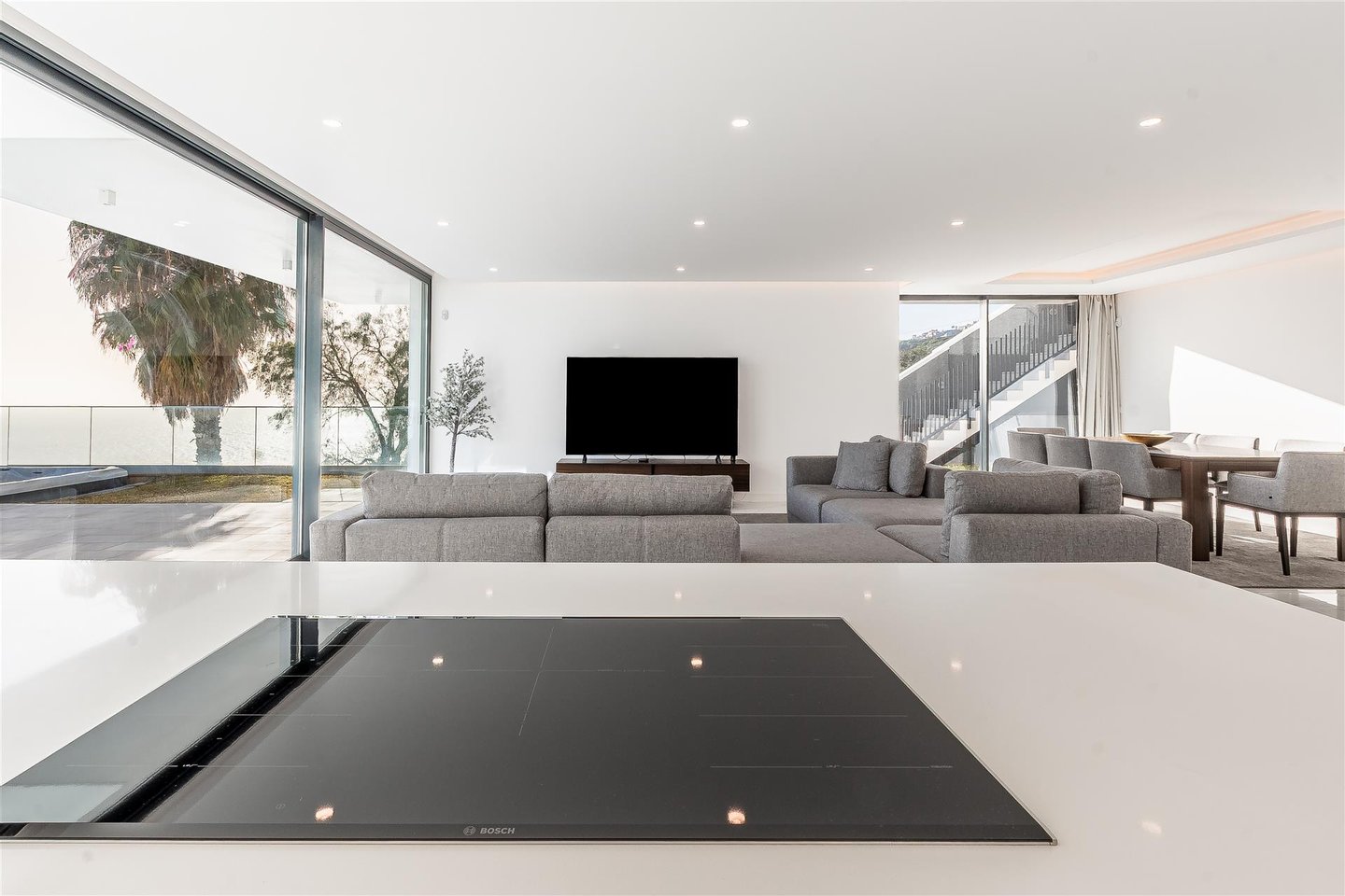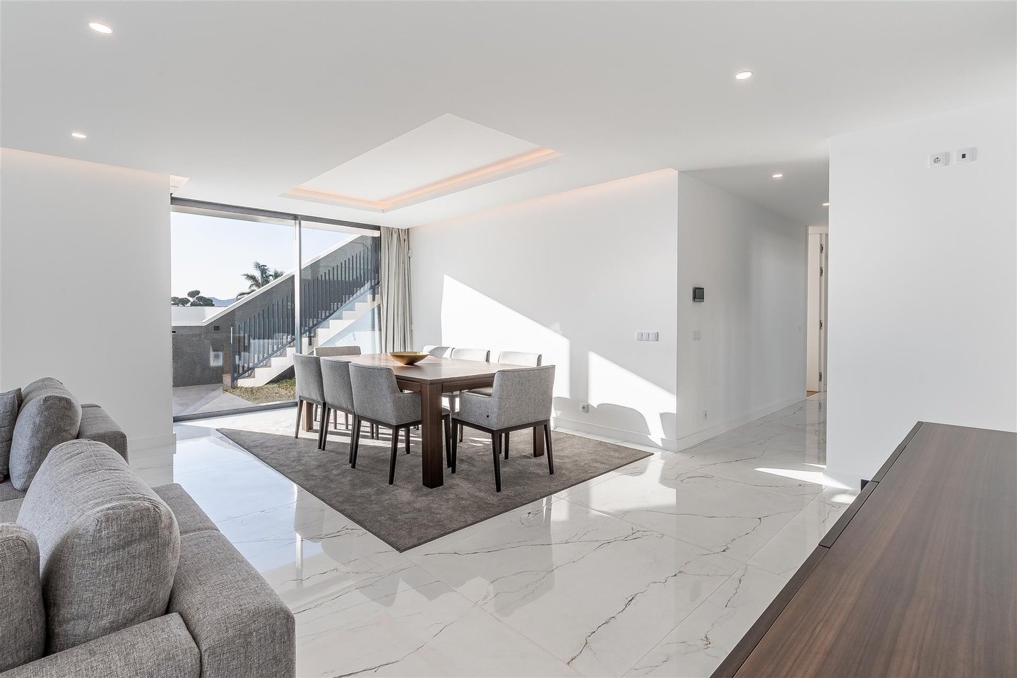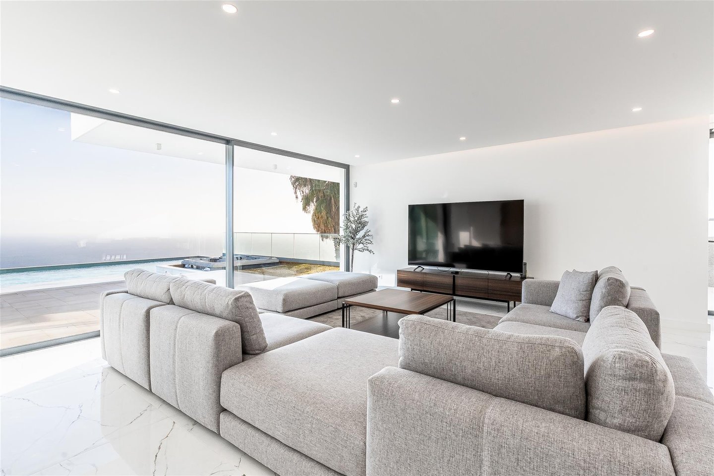 Die Hauptwohnung hat eine direkte und fließende Verbindung zum Außenbereich. Die Terrasse steht im Mittelpunkt; der Infinity-Ppool scheint sich mit dem Atlantik zu vereinen. Für die Abende sorgt der Feuerplatz für einen gemütlichen und eleganten Raum, perfekt zum Entspannen.