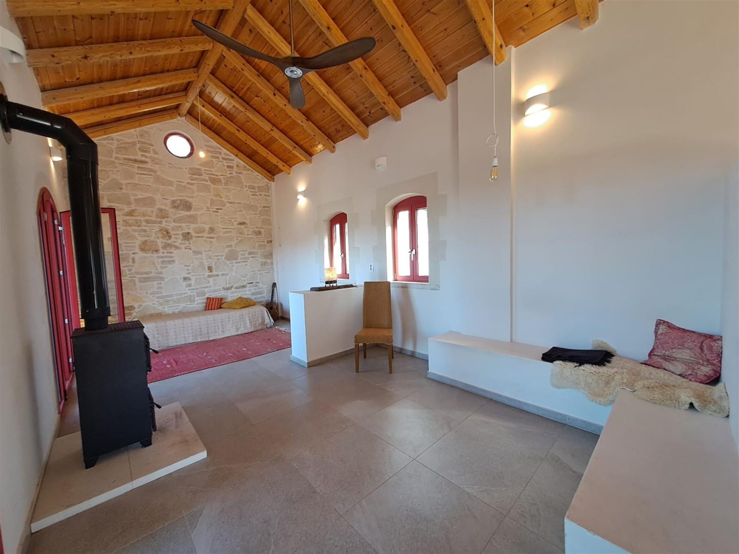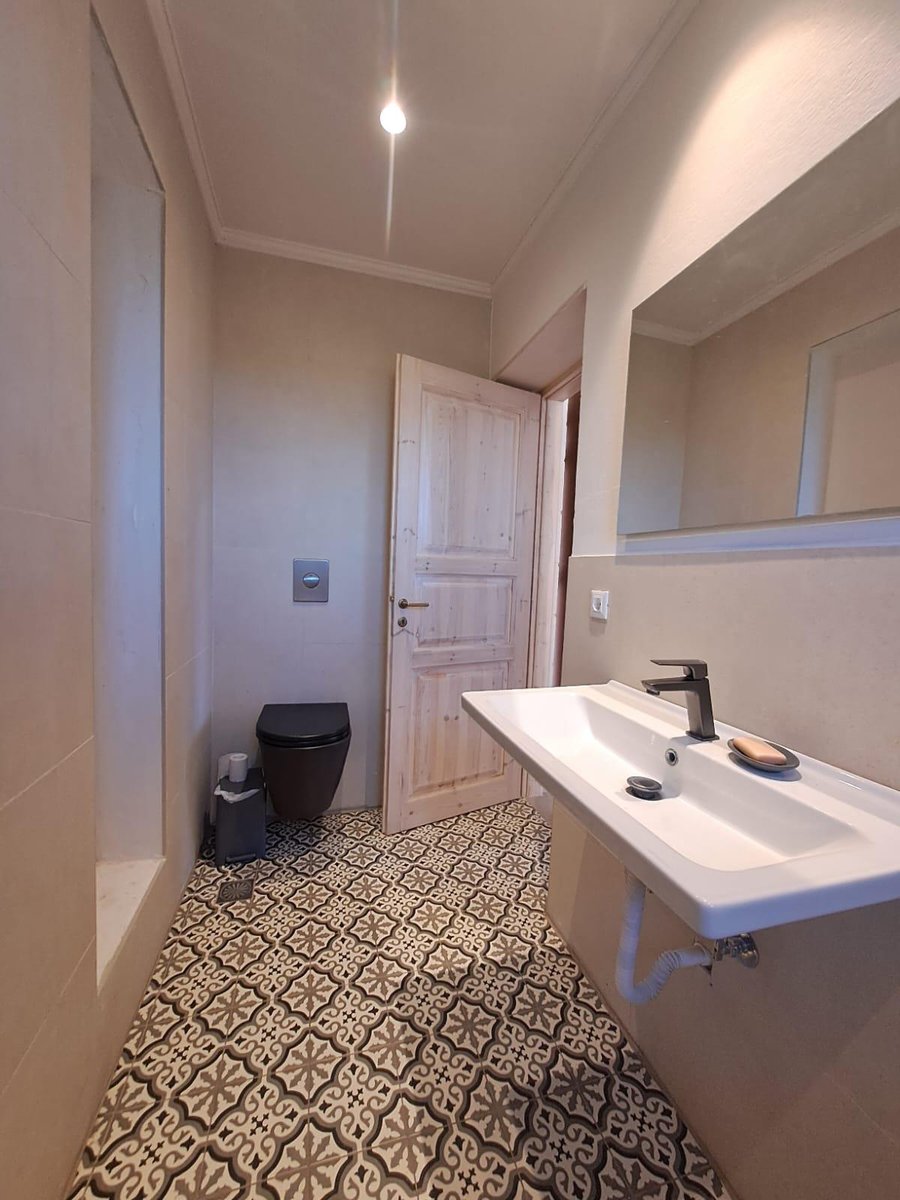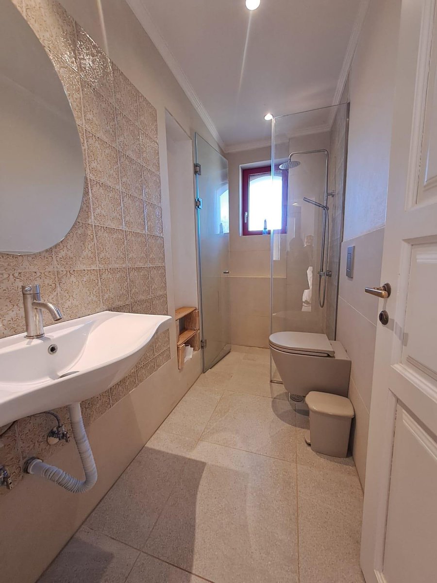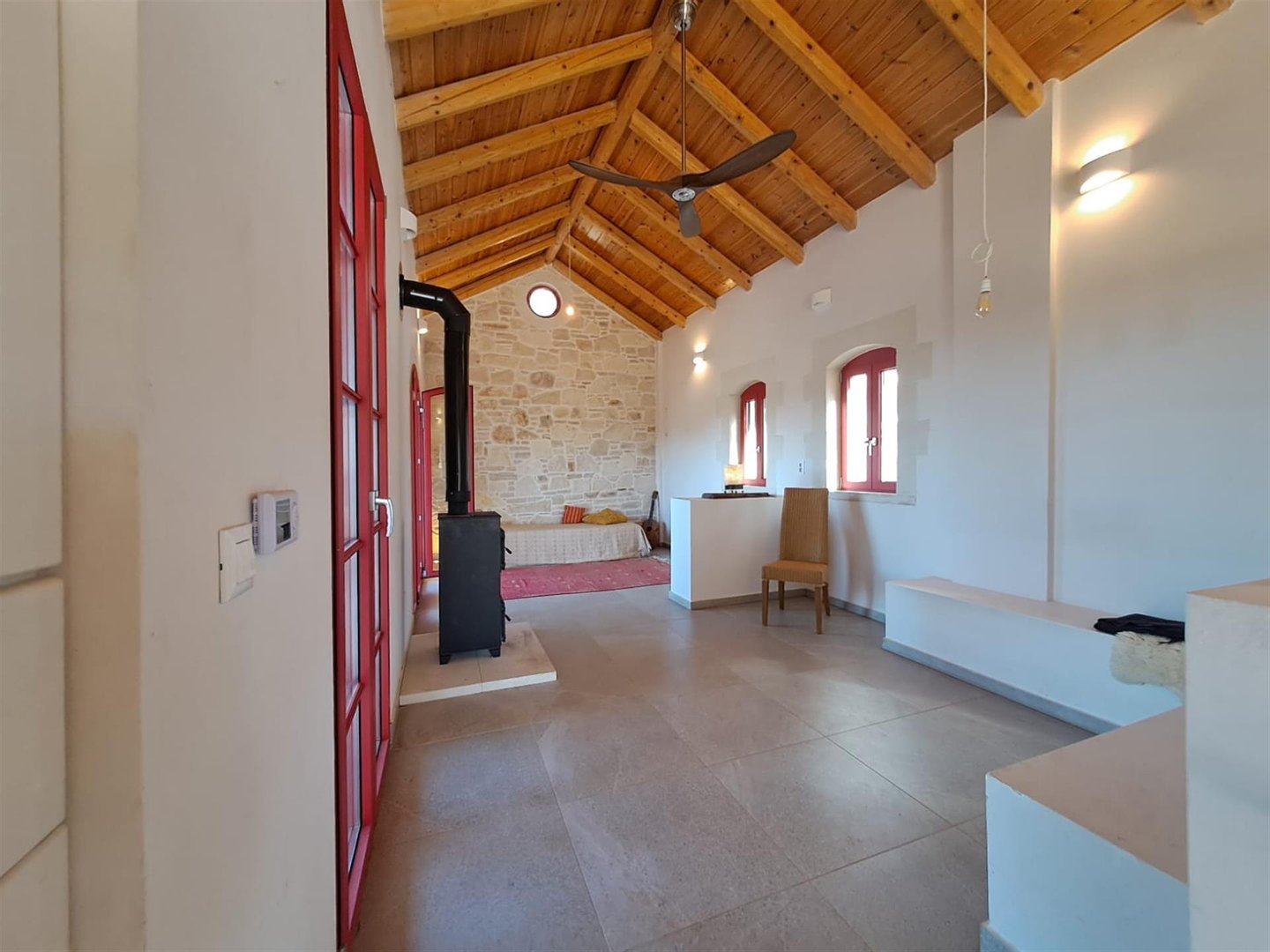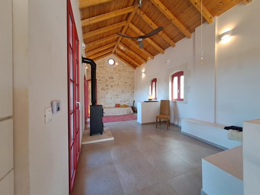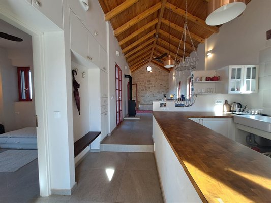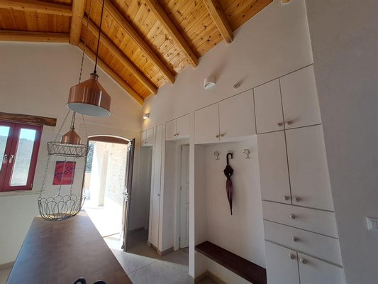 Im Inneren: Beim Betreten des Haupthauses empfängt Sie ein heller offener Wohnbereich mit zweistufigen, gotischen Holzbalkendecken, die eine geräumige und luftige Atmosphäre schaffen. Das moderne Bad mit einer begehbaren italienischen Dusche befindet sich links vom Eingang.