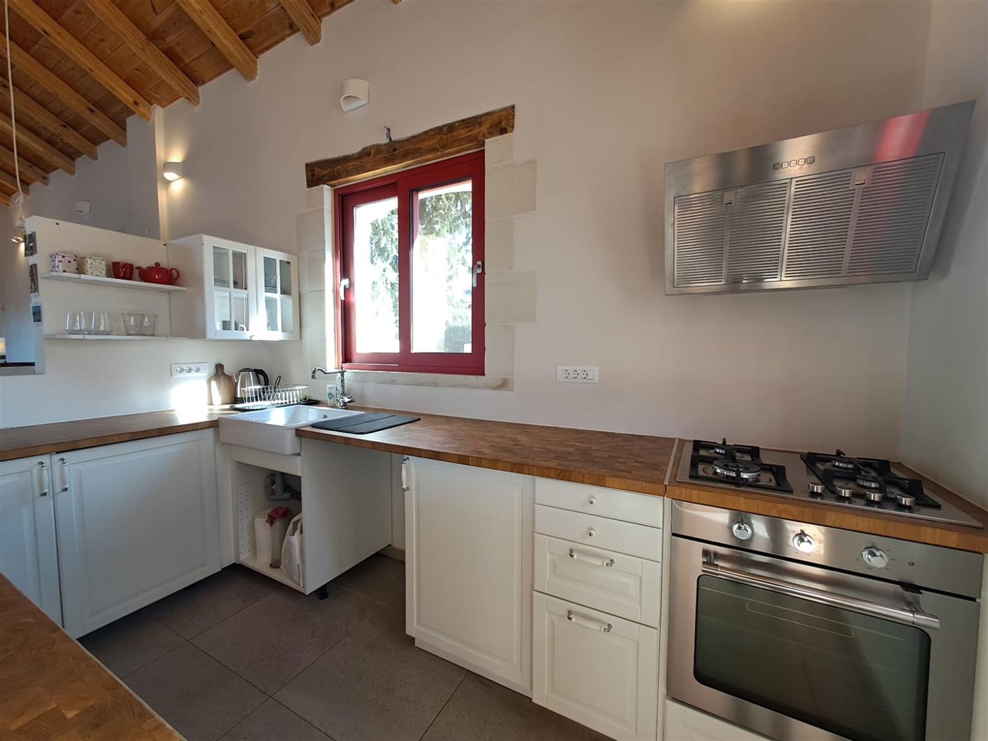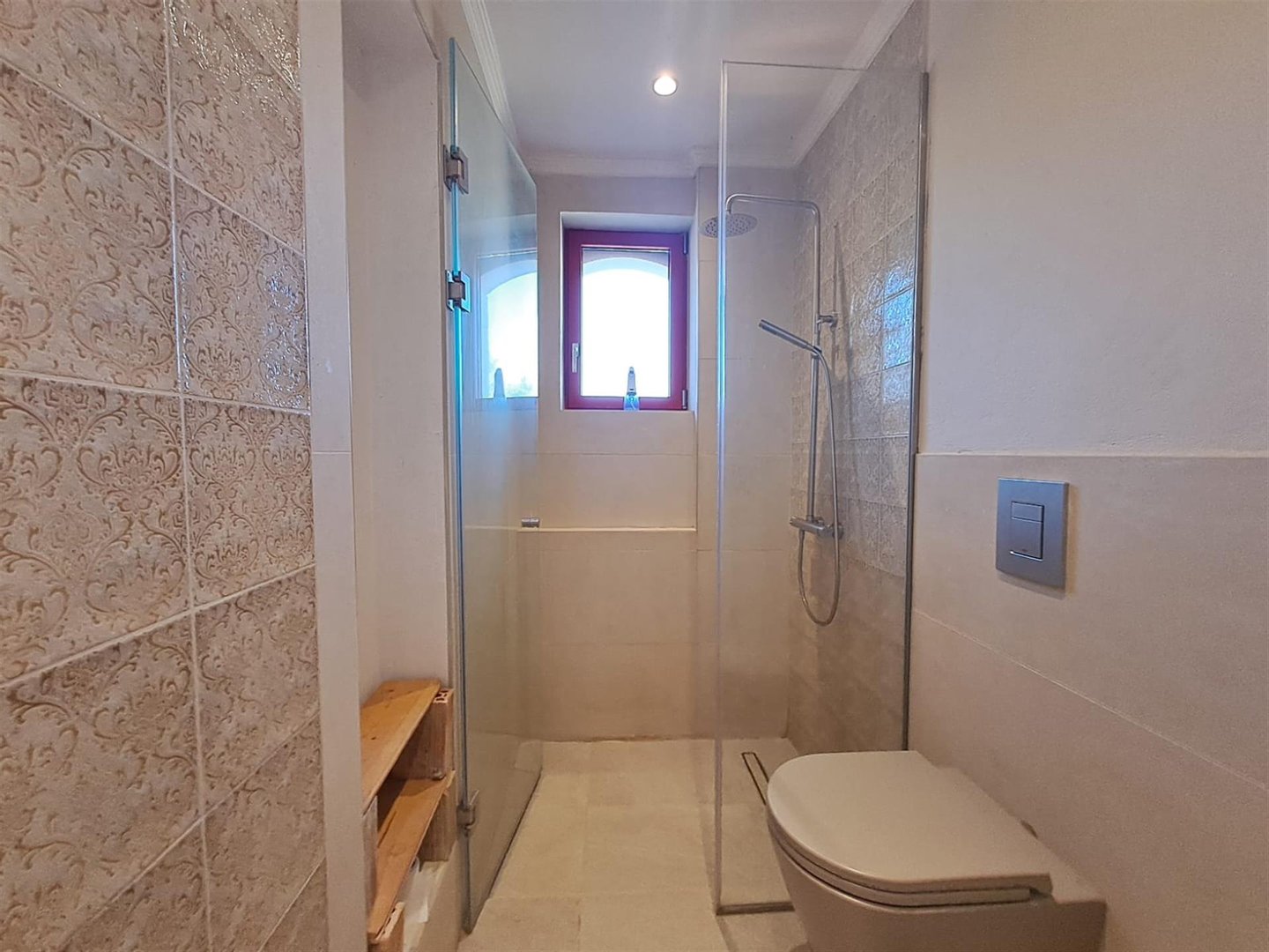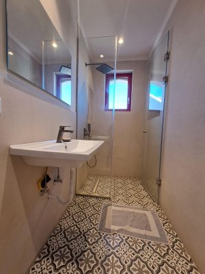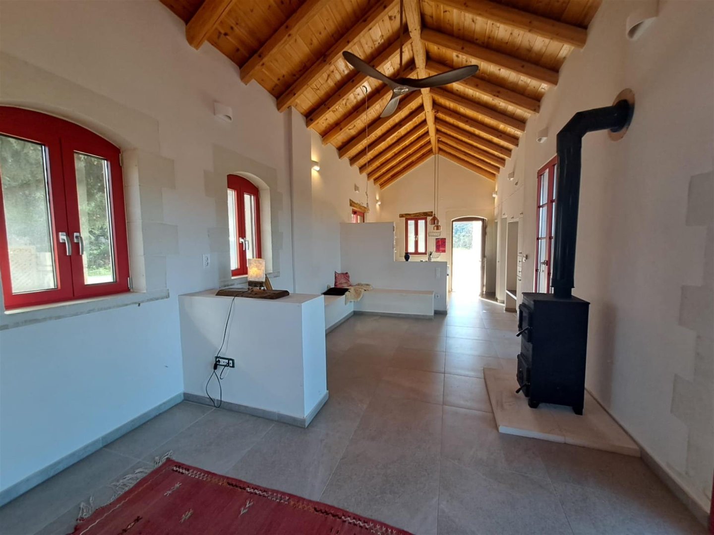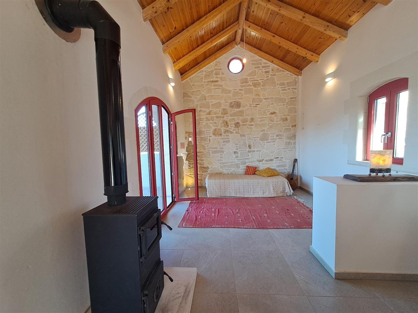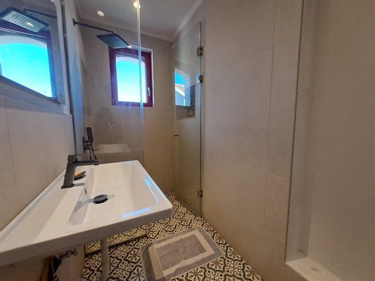 Im Inneren: Beim Betreten des Haupthauses empfängt Sie ein heller offener Wohnbereich mit zweistufigen, gotischen Holzbalkendecken, die eine geräumige und luftige Atmosphäre schaffen. Das moderne Bad mit einer begehbaren italienischen Dusche befindet sich links vom Eingang.