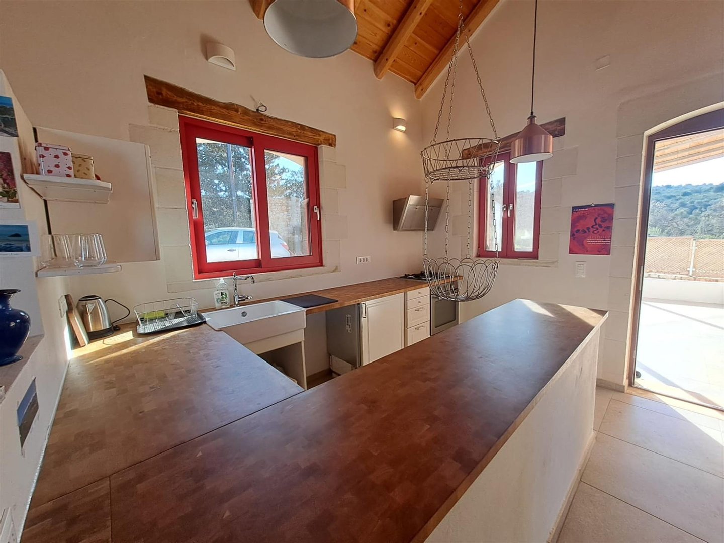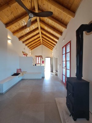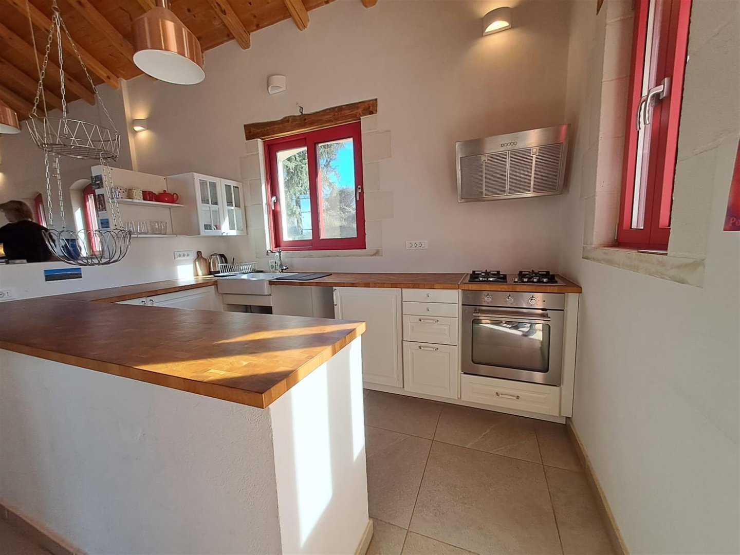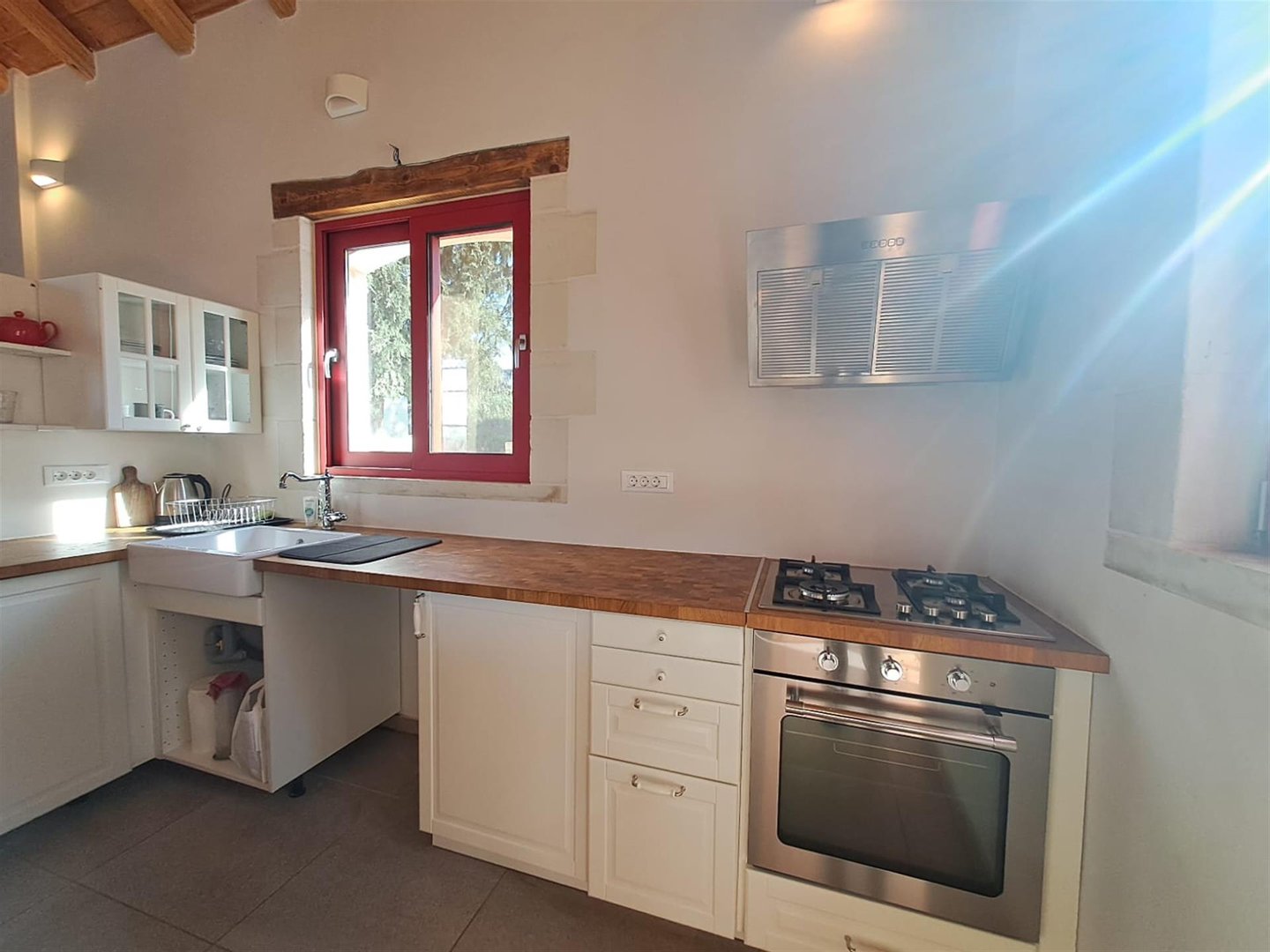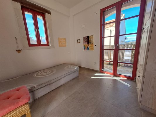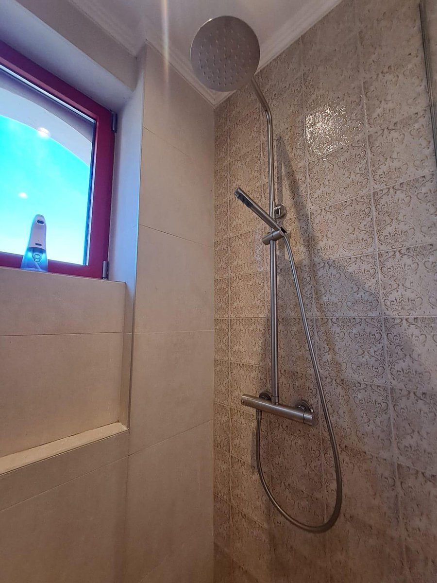 Im Inneren: Beim Betreten des Haupthauses empfängt Sie ein heller offener Wohnbereich mit zweistufigen, gotischen Holzbalkendecken, die eine geräumige und luftige Atmosphäre schaffen. Das moderne Bad mit einer begehbaren italienischen Dusche befindet sich links vom Eingang.
