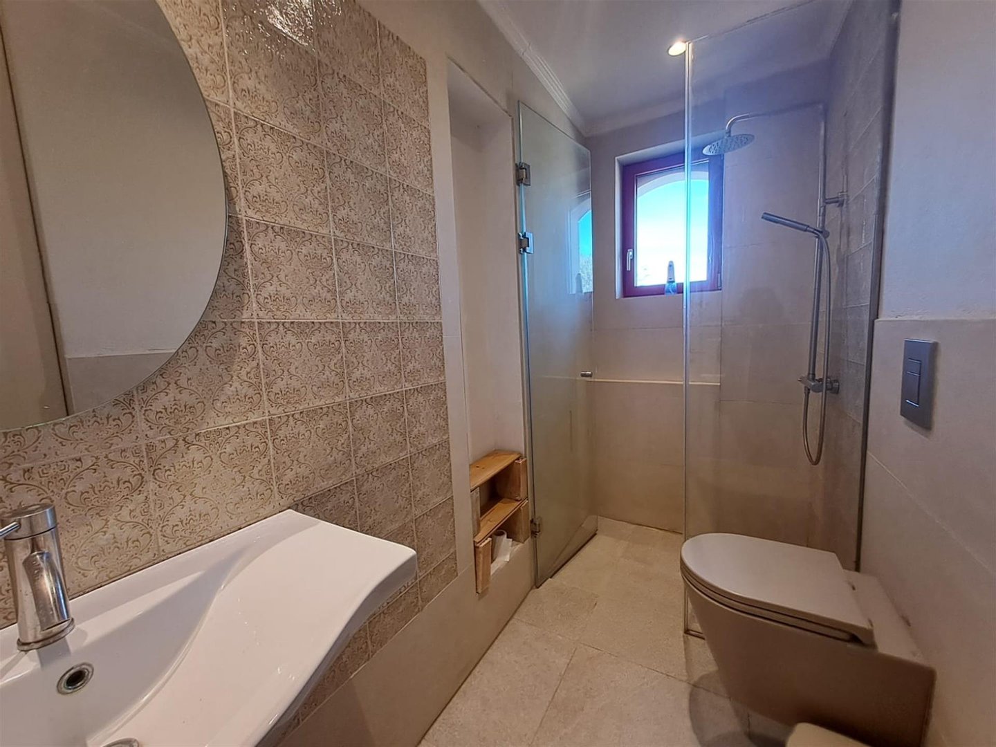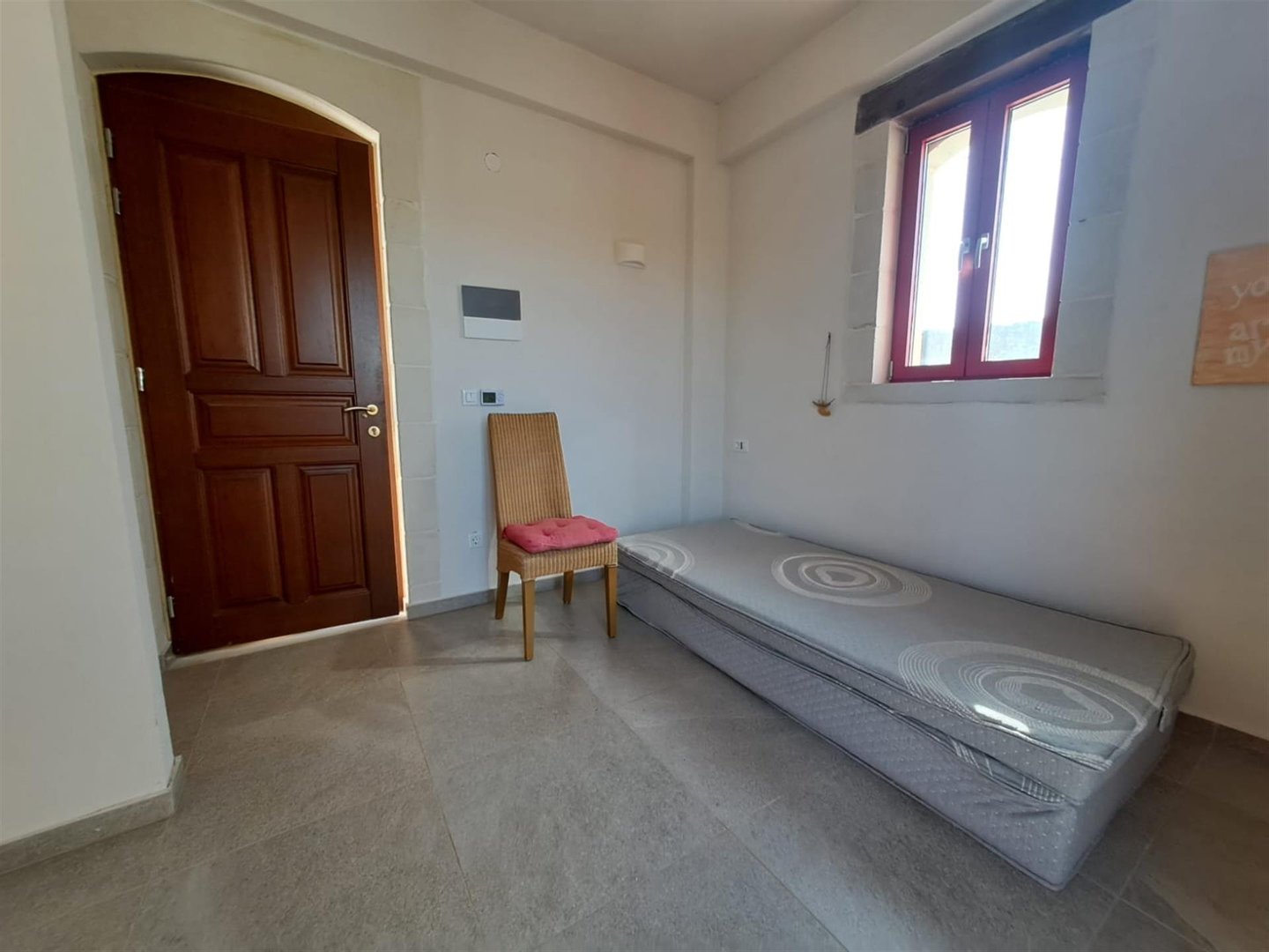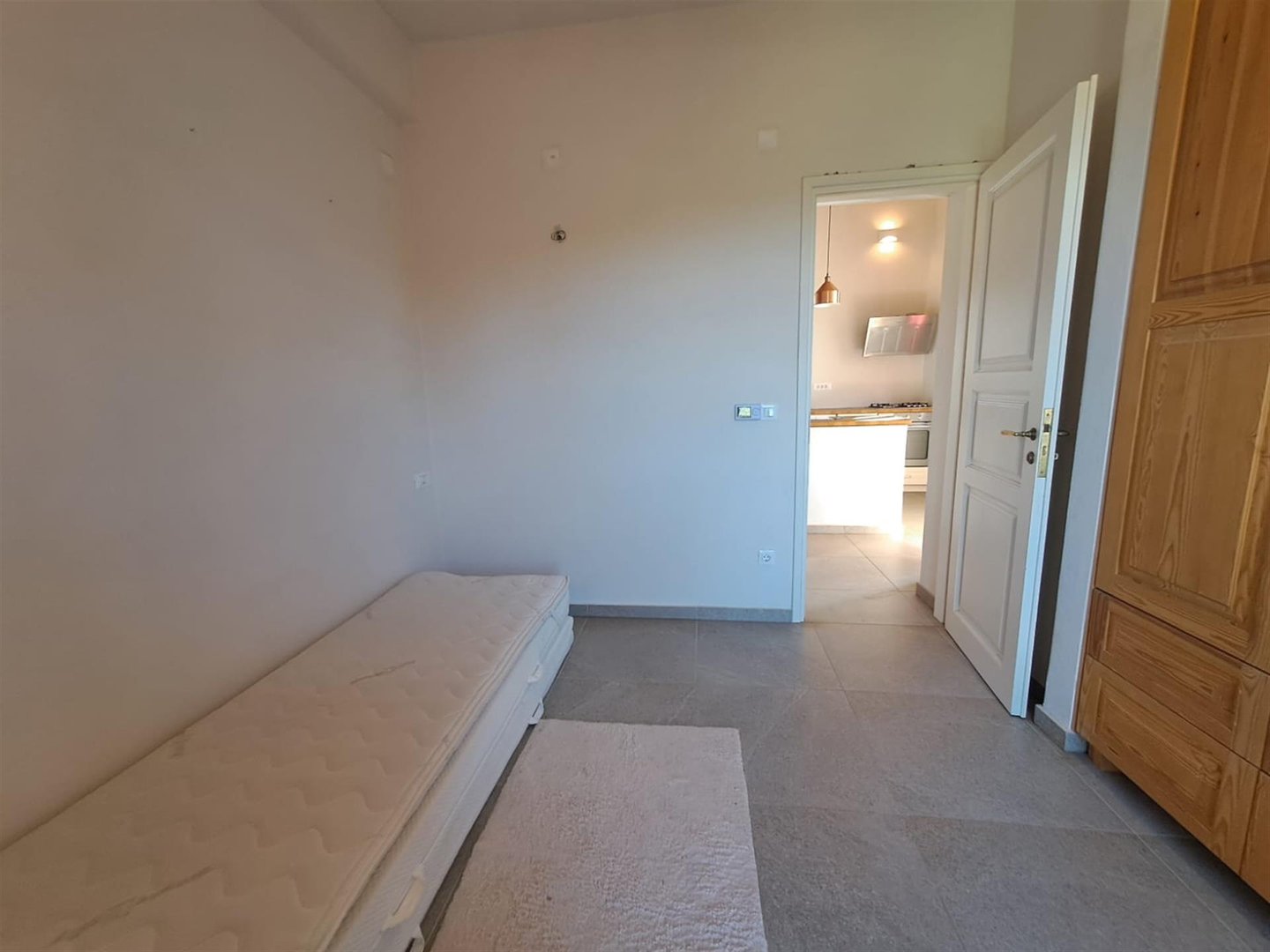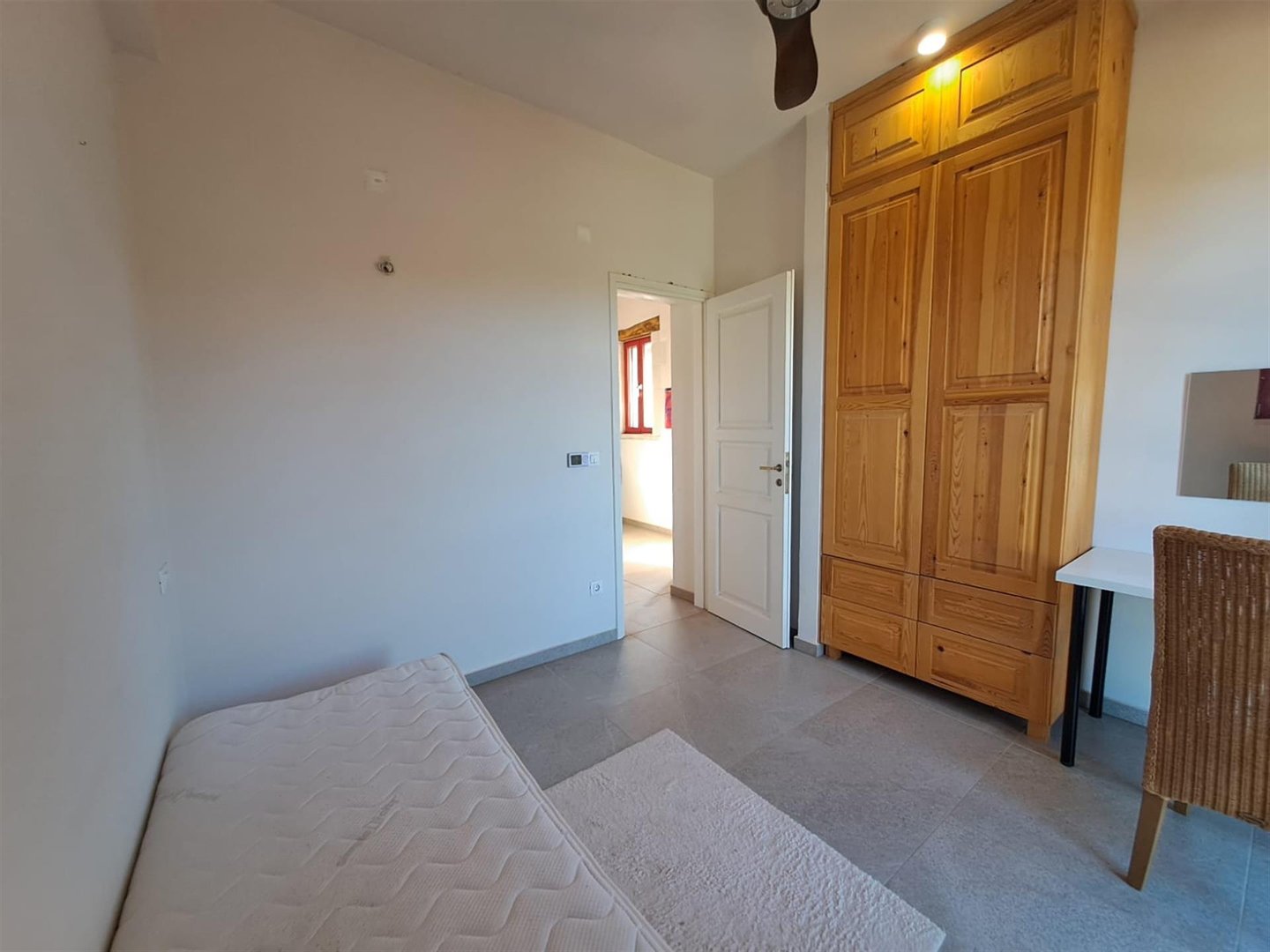Im Inneren: Beim Betreten des Haupthauses empfängt Sie ein heller offener Wohnbereich mit zweistufigen, gotischen Holzbalkendecken, die eine geräumige und luftige Atmosphäre schaffen. Das moderne Bad mit einer begehbaren italienischen Dusche befindet sich links vom Eingang.