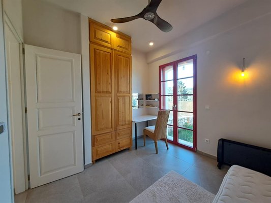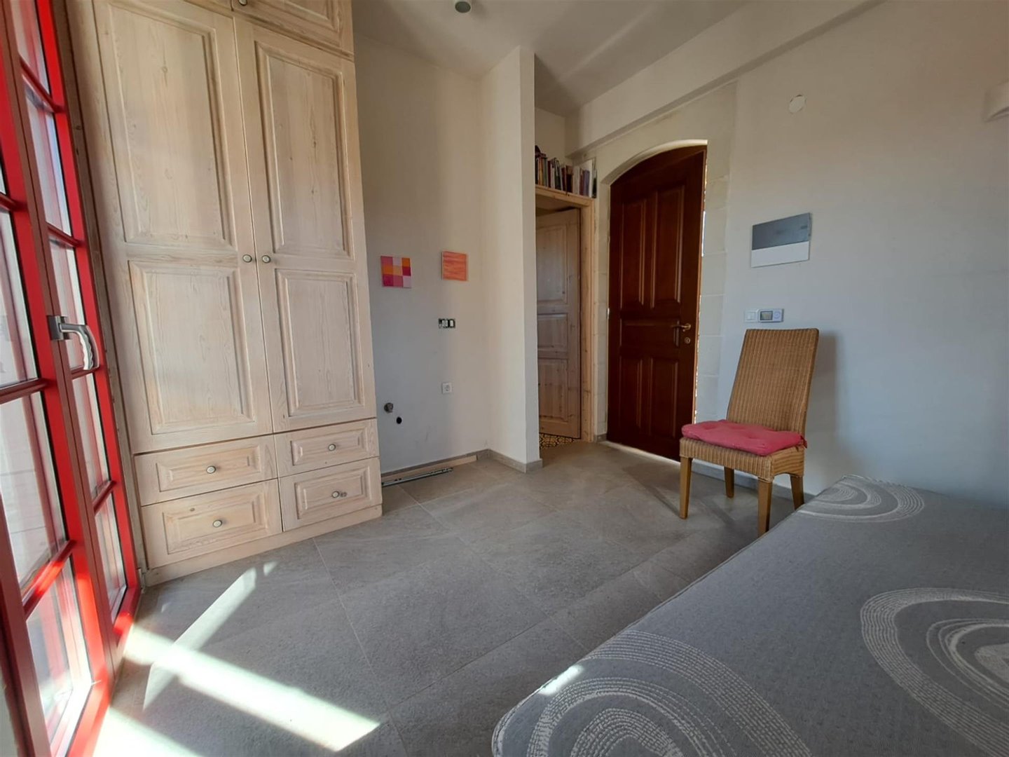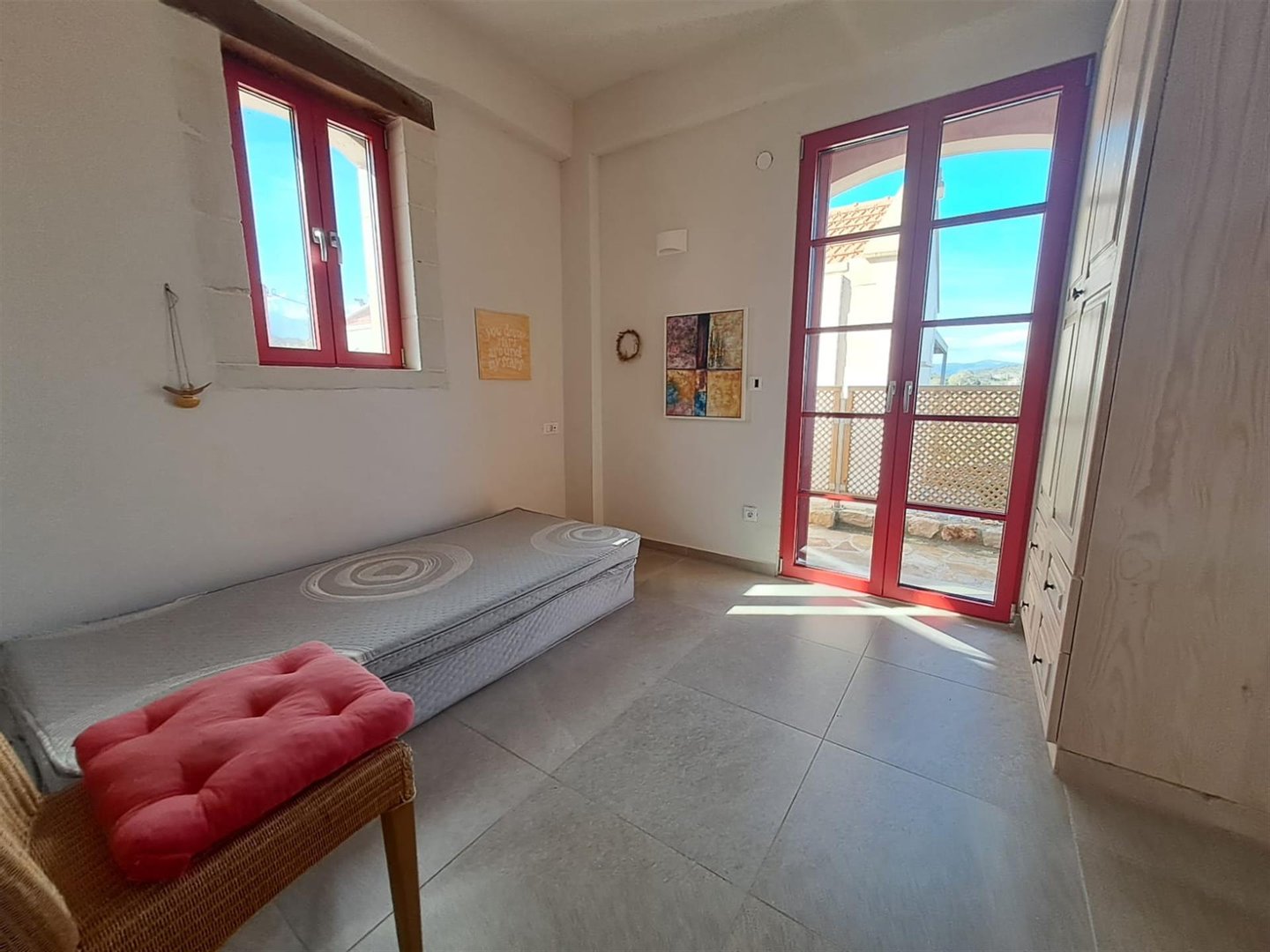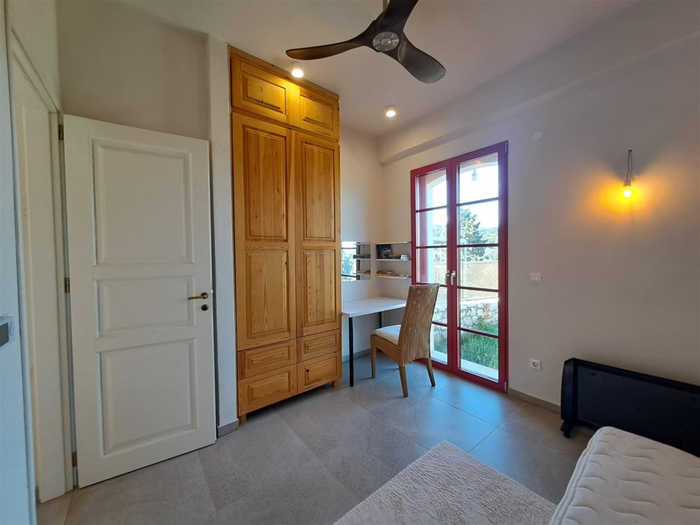 Neben dem Bad liegt das erste Schlafzimmer mit Doppelbett, ausgestattet mit eingebauten Stauraummöbeln, klug über den Terrassentüren positioniert, die direkt auf eine überdachte Terrasse führen.