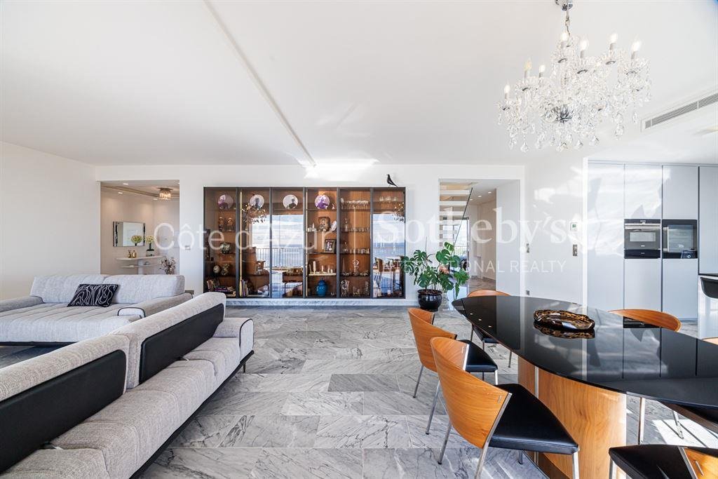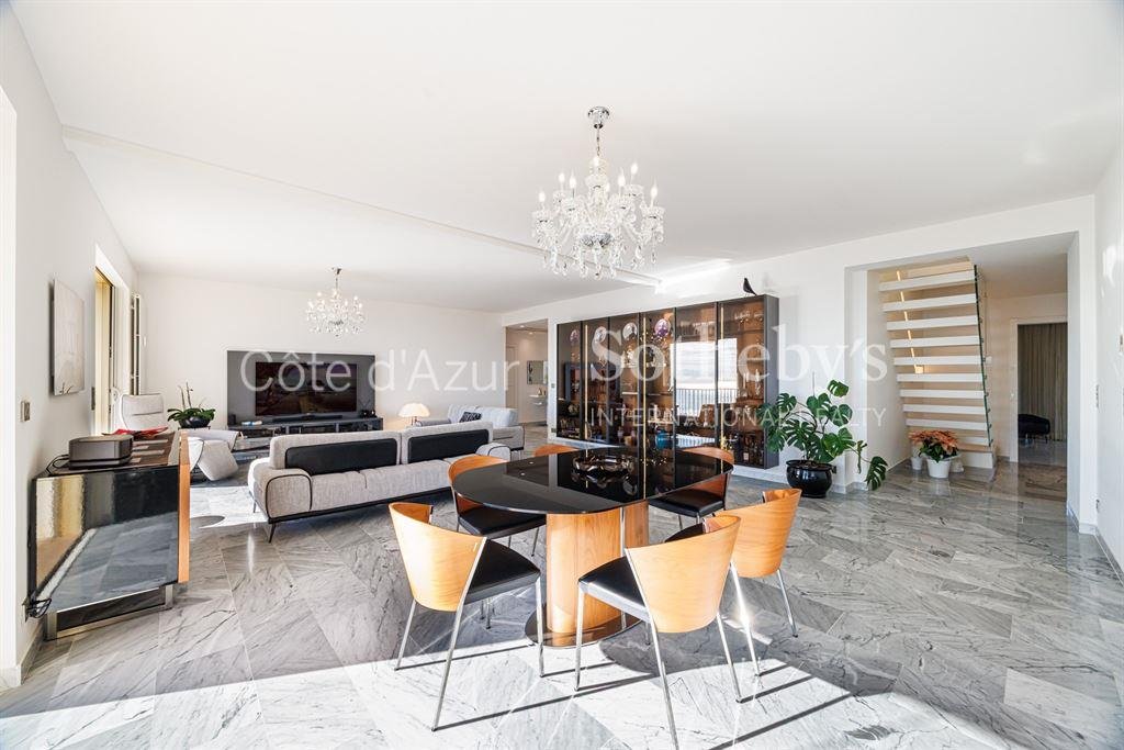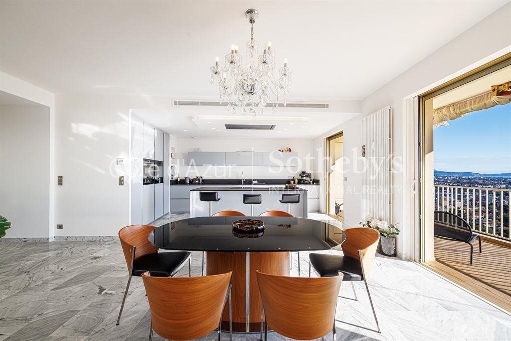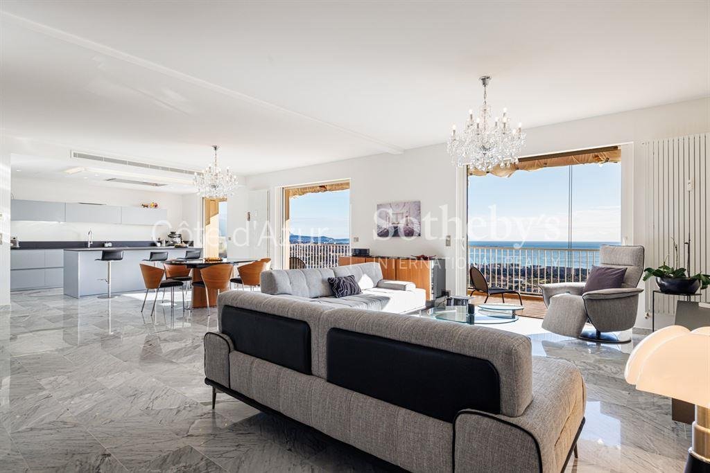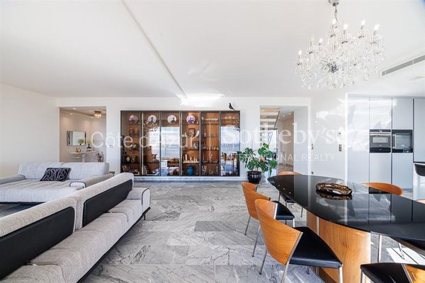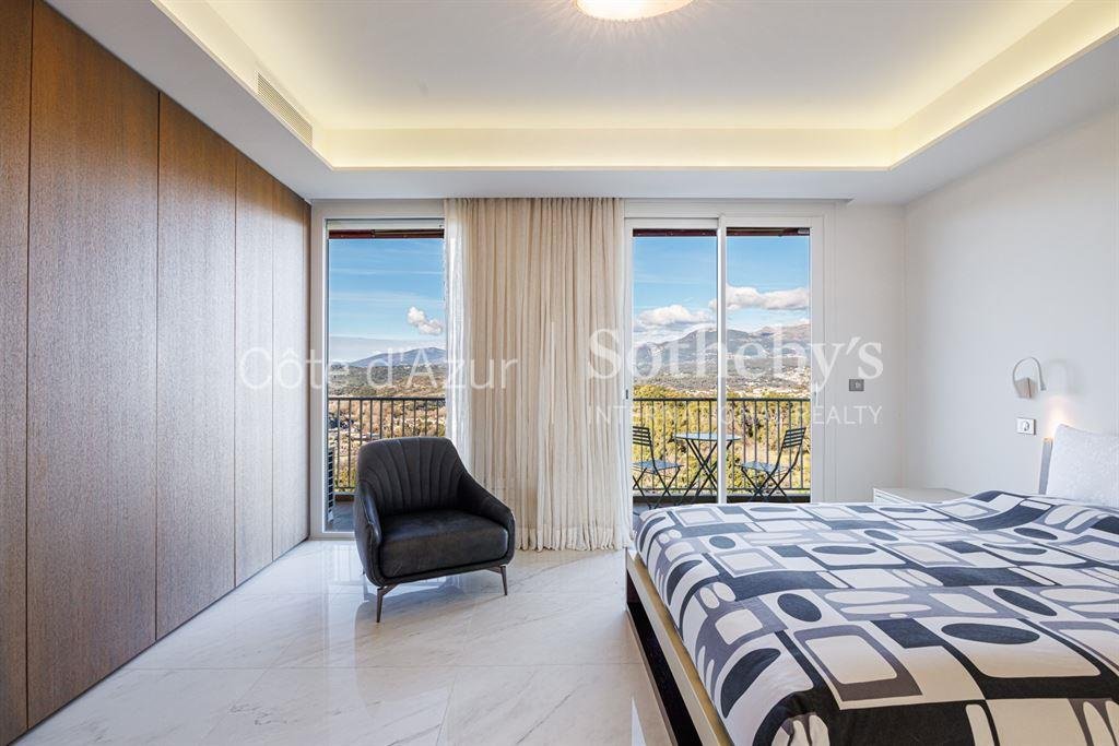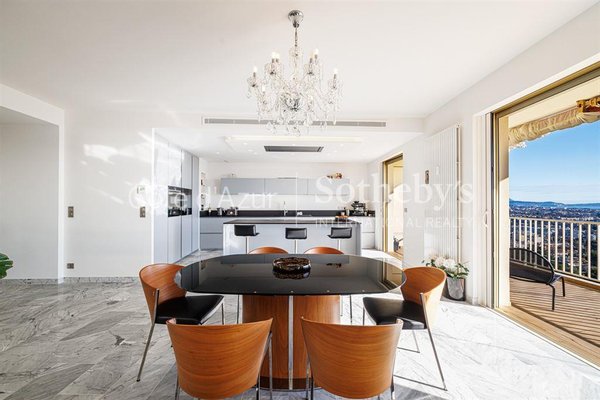 An der Spitze des Domaine du Loup bietet dieses 135 m² große Penthouse (Loi Carrez) mehr als 100 m² Außenflächen mit 180° Panoramablick auf das Mittelmeer von Cap Ferrat bis Cap d’Antibes, einschließlich des Hippodroms der Côte d’Azur.