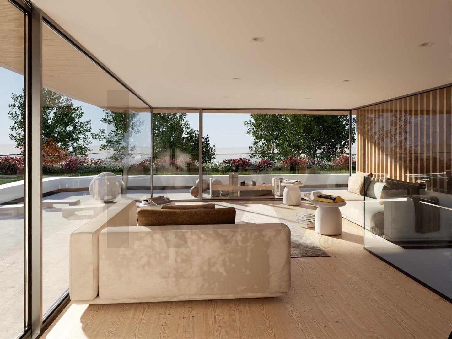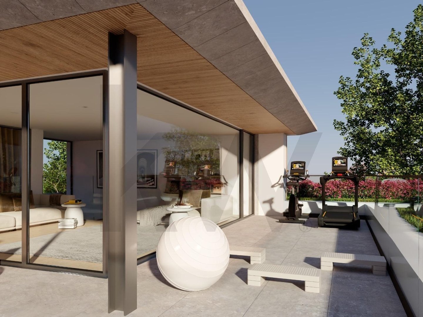 Wohnzimmer mit Zugang zu großem Balkon, der einen privateren Bereich des Hauses schafft.