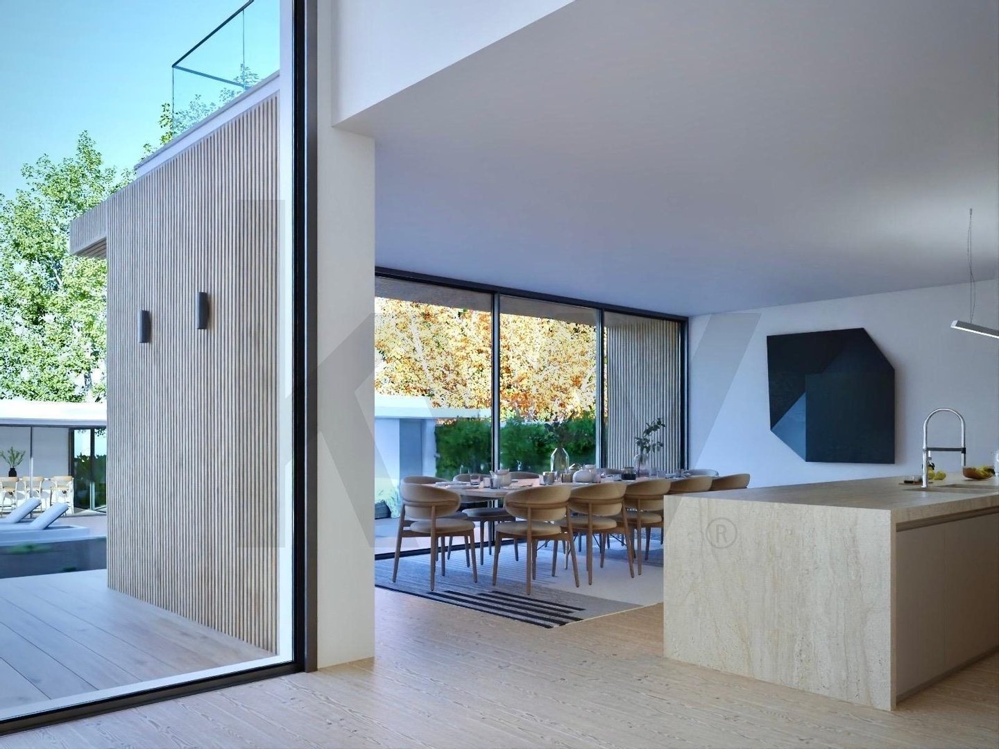 Großer Sozialbereich mit offener Küche und Wohnbereich, direkter Zugang zum Garten und zum Pool.