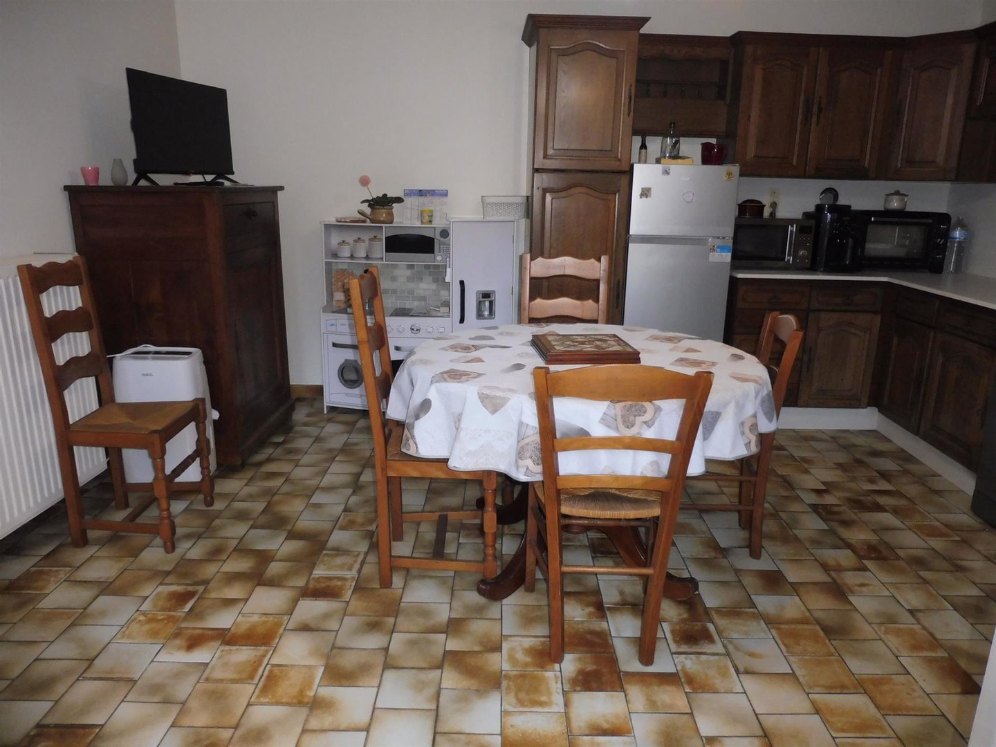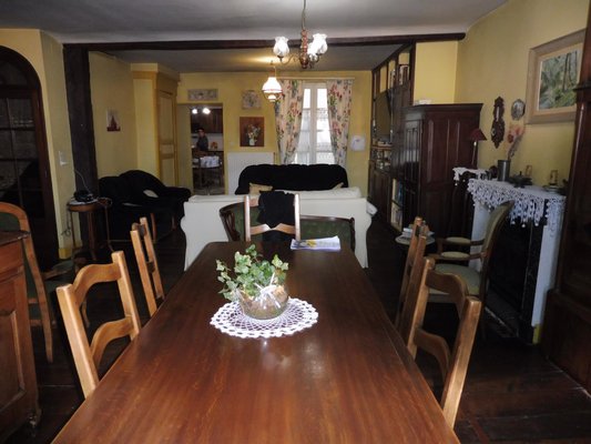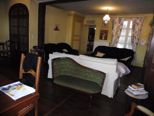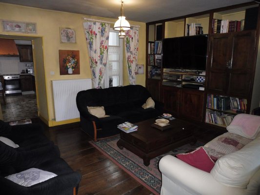 1. Obergeschoss: Großes Wohnzimmer, eingerichtete Küche und Terrasse.