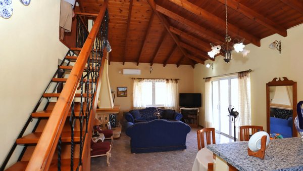 Im ersten Stock befindet sich eine eigenständige Wohnung von etwa 80 m². Dazu gehören ein Wohnzimmer mit Kamin, Essbereich, Küche, zwei Schlafzimmer und ein Bad/WC sowie ein separates WC. Zusätzlich gibt es ein kleines Dachboden-Schlafzimmer mit 12 m². Und eine großzügige Terrasse von 50 m², überdacht mit einer hölzernen Pergola und einem Ziegeldach. Der Bau wurde 1998 abgeschlossen, die letzte Renovierung erfolgte 2019 und verfügt über eine Energieklasse C.