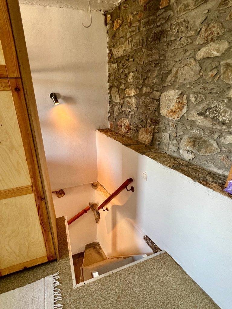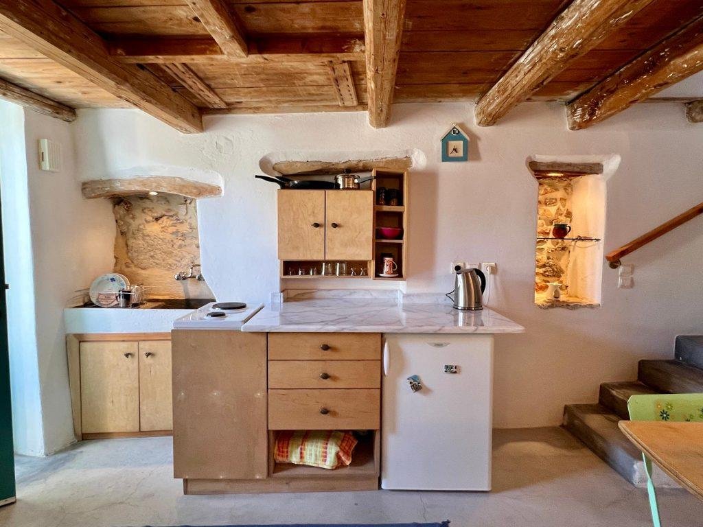 Im gesamten Haus sind charmante traditionelle Merkmale erhalten geblieben, wie alte Holzbalkendecken, bunte Holztüren, ein eingebautes Sofa und originale Steinmauerfragmente, die einen authentischen kretaischen Charakter verleihen.