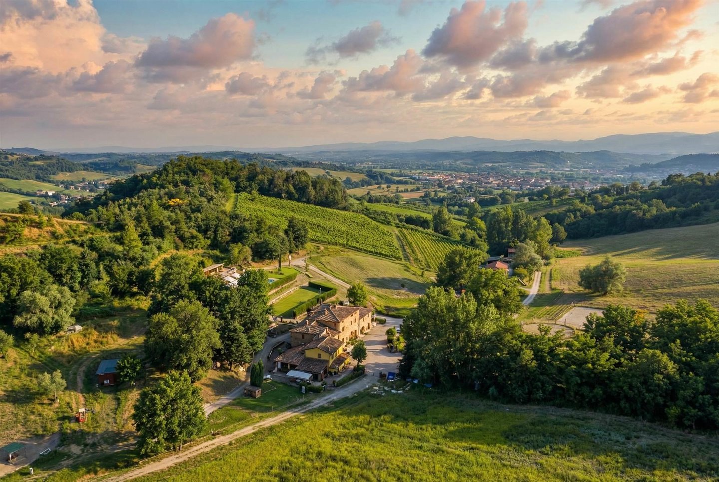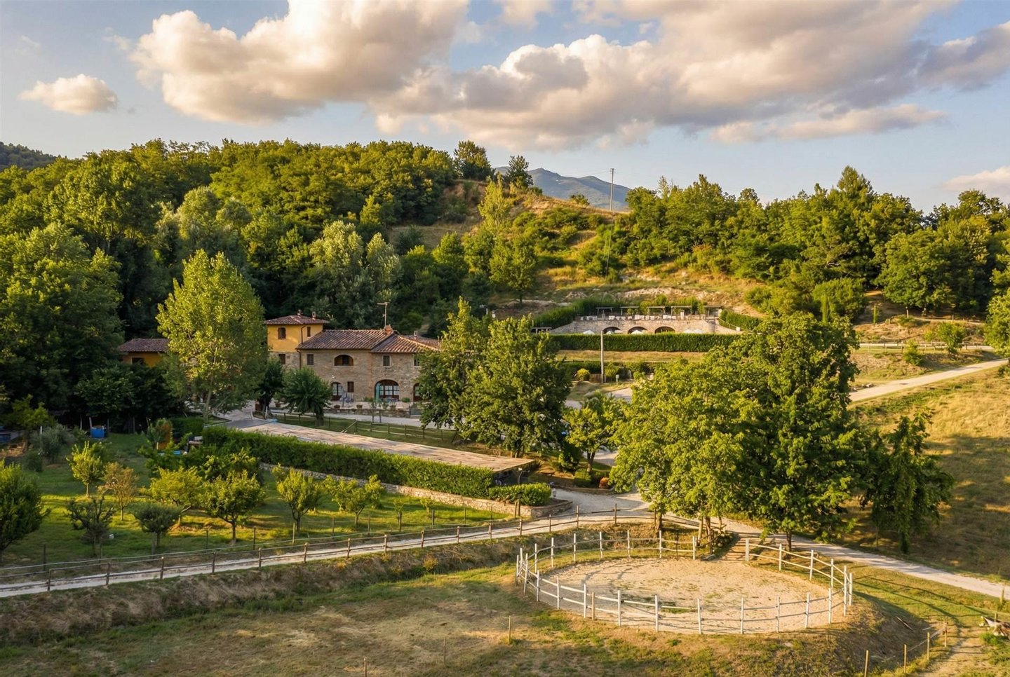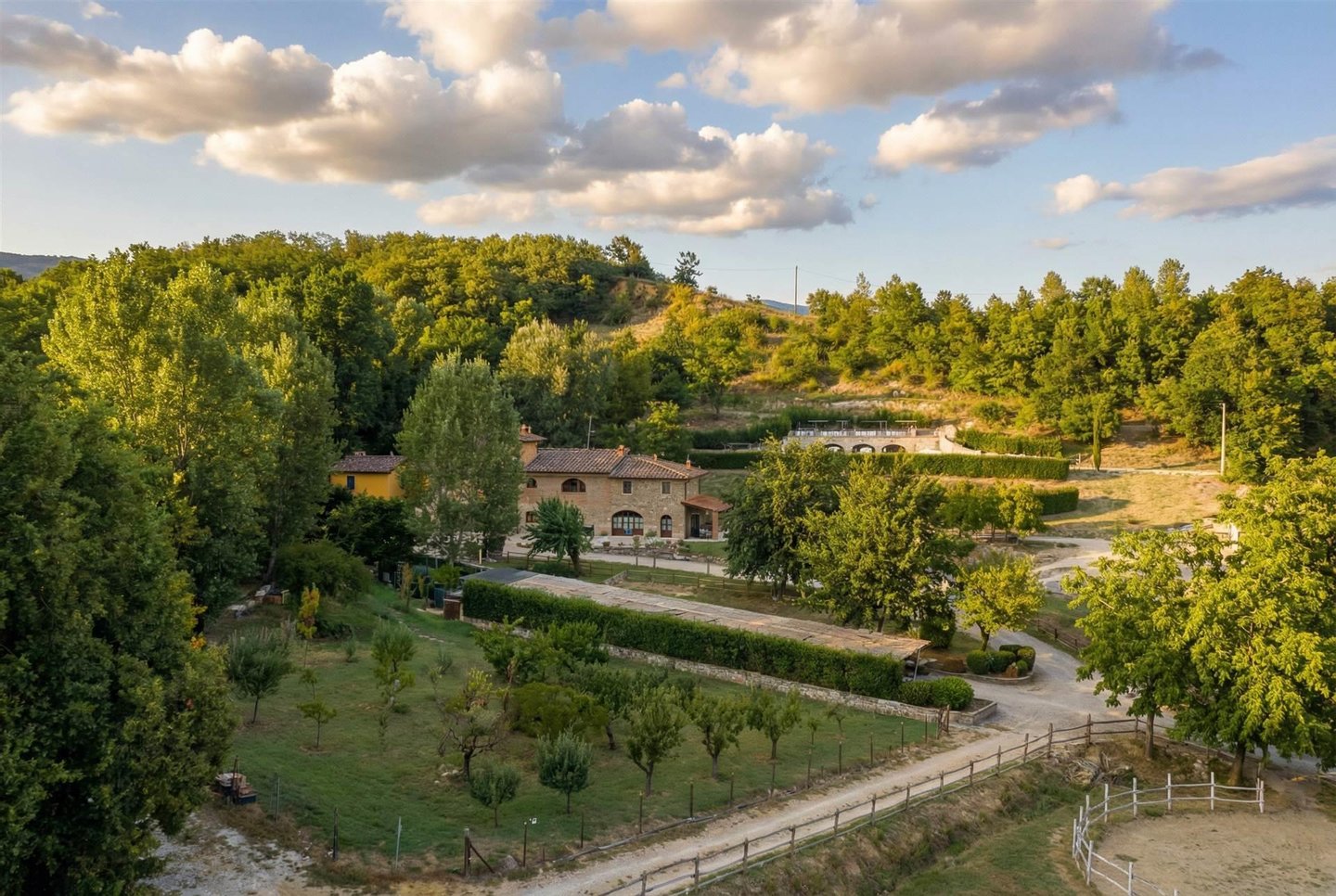 Das Anwesen umfasst etwa 20,8 Hektar innerhalb eines Naturschutzgebiets. Der landwirtschaftliche Teil ist sehr wertvoll und umfasst einen 4 Hektar großen Olivenhain (500 produktive Bäume) sowie Pflanzrechte für einen Chianti Docg-Weinberg von etwa 8.000 m². Zu den Außenbereichen gehören ein Schwimmbad mit Entspannungsbereich, eine 120 m² große "Limonaia", ideal für Fitness oder ein Spa, sowie hochmoderne Reitanlagen: kürzlich errichtete Ställe (255 m²) und zwei Pferdeweide. Das Grundstück ist über eine kurze, 800 Meter lange, unbefestigte Straße in ausgezeichnetem Zustand erreichbar, sodass absolute Privatsphäre nur 15 Minuten vom berühmten Luxus-Outlet "The Mall" und weniger als 30 Minuten von Florence entfernt gewährleistet ist.
