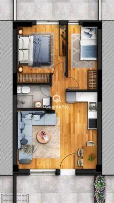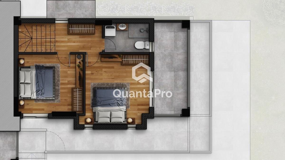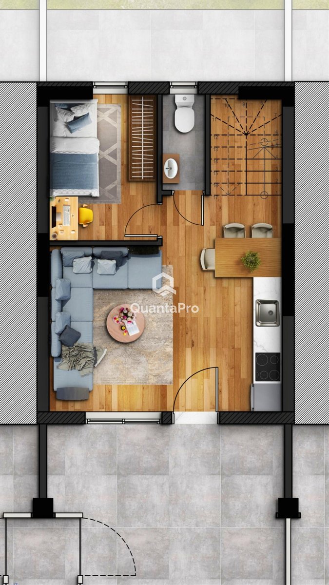 Erdgeschoss: Großes Wohnzimmer mit Küche und einem mittleren Esszimmer. Eine kleine WC mit Toilette, Waschbecken und Waschbecken. Ein kleines Schlafzimmer mit Bett, Kleiderschrank, Schreibtisch (z. B. Etagenbett). Großer Balkon.