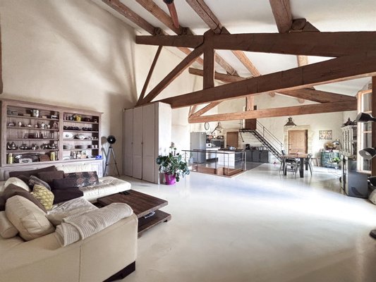 Dieses große, charaktervolle Haus befindet sich im Stadtzentrum von Sommières, nur einen Steinwurf von Geschäften und Schulen entfernt. Im ersten Stock ist es in ein Loft umgewandelt, mit einem großen, schönen 85 m² großen Hauptwohnzimmer, hell und