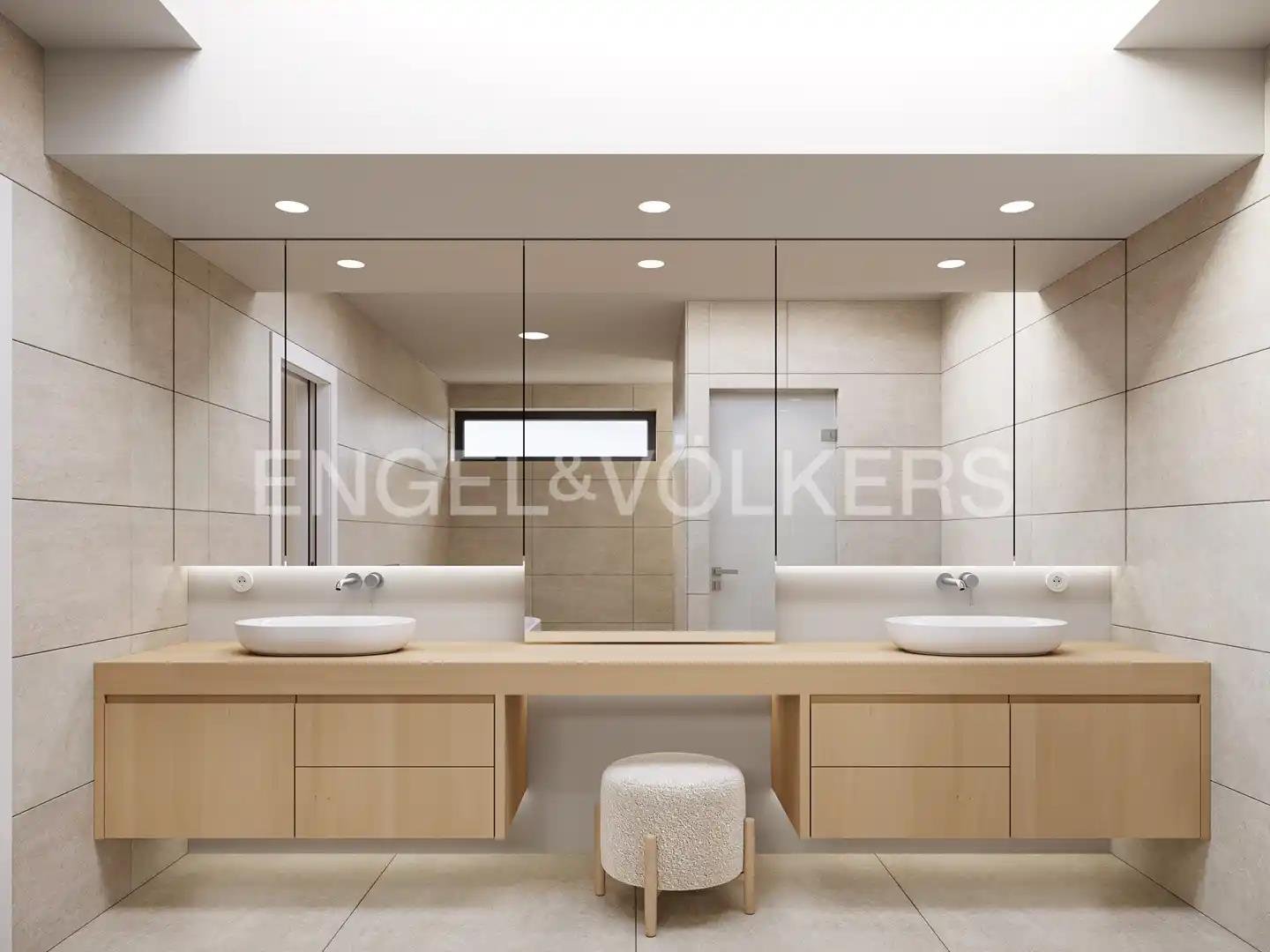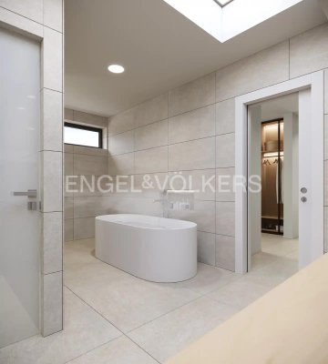 Die Villa erstreckt sich über 2 Etagen plus Keller und bietet 4 Schlafzimmer, alle mit eigenem Bad, eines davon im Erdgeschoss und die anderen drei im ersten Stock. Ein Gäste-WC, eine voll ausgestattete offene Küche mit Insel, verbunden mit dem