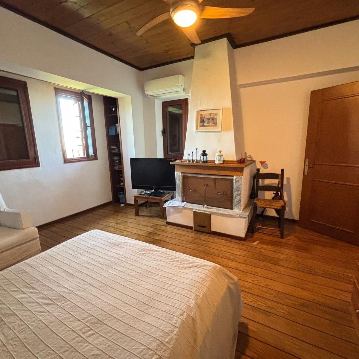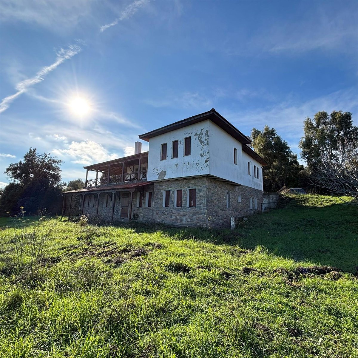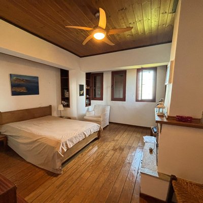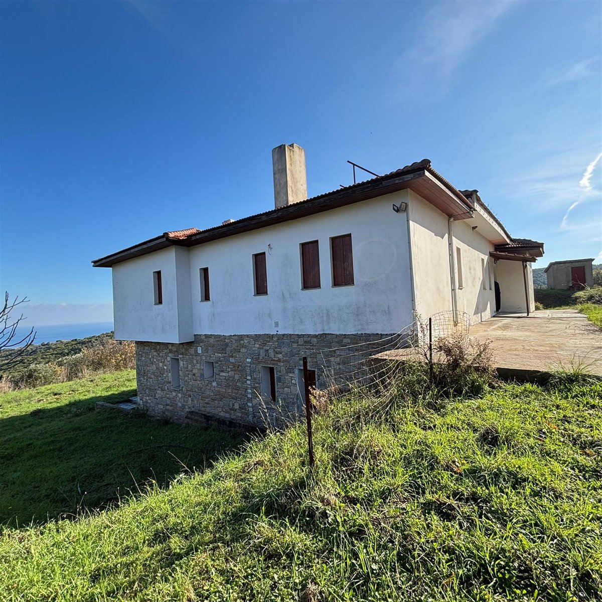 Im Erdgeschoss finden wir ein offenes Wohnzimmer mit Kamin, eine ausgestattete Küche, drei Schlafzimmer mit eigenen Badezimmern und einen zusätzlichen Raum, der nach Ihren Bedürfnissen gestaltet werden kann. Eine innere Treppe führt in den ersten Stock, der aus einem großen Wohnzimmer mit einem Energiesparkamin, einer Küche und drei Schlafzimmern mit eigenen Badezimmern besteht. Zwei dieser Schlafzimmer verfügen ebenfalls über einen eigenen Kamin. Der Ausblick vom ersten Stock ist großartig und blickt auf das Ägäische Meer hinaus. Alle Räume werden ausschließlich mit Kaminen beheizt, aber das Design und die Einrichtungen für Heizkörper und Heizungsraum sind vorhanden. Das Grundstück ist mit Steindetails dekoriert und verfügt über eine Terrasse, während der Zugang dazu über eine Asphaltstraße erfolgt.