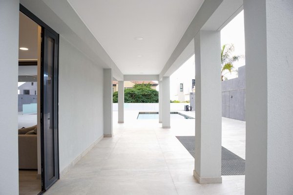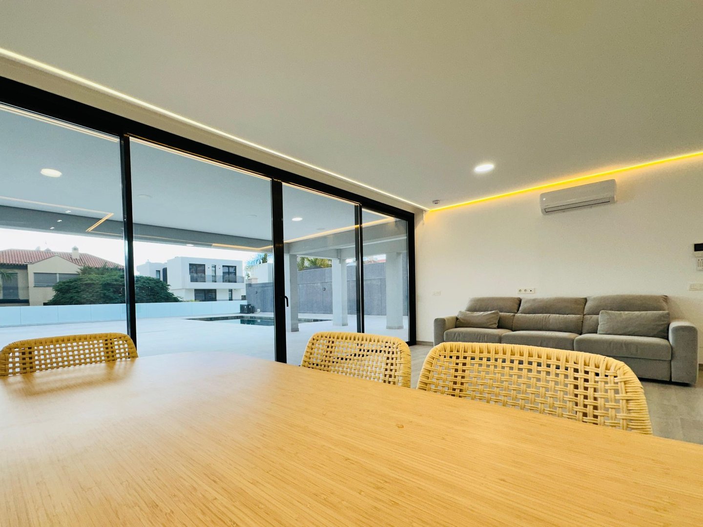 Die großen Fenster verbinden mit einer prächtigen Terrasse, die das Haus vollständig umgibt, in der sich ein großes Solarium und ein privater Pool befinden, was einen idealen Raum schafft, um das privilegierte Klima der Insel zu genießen.