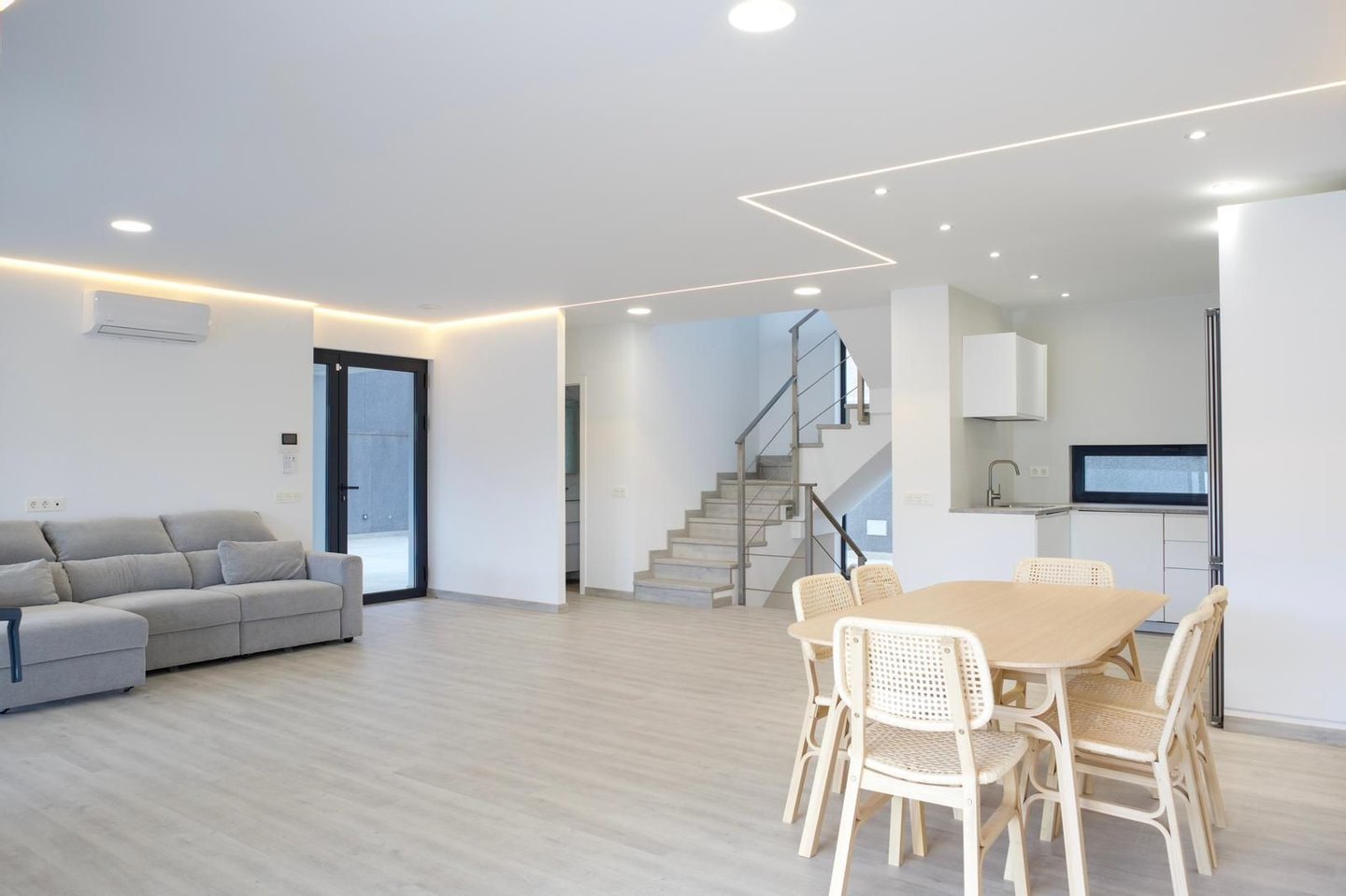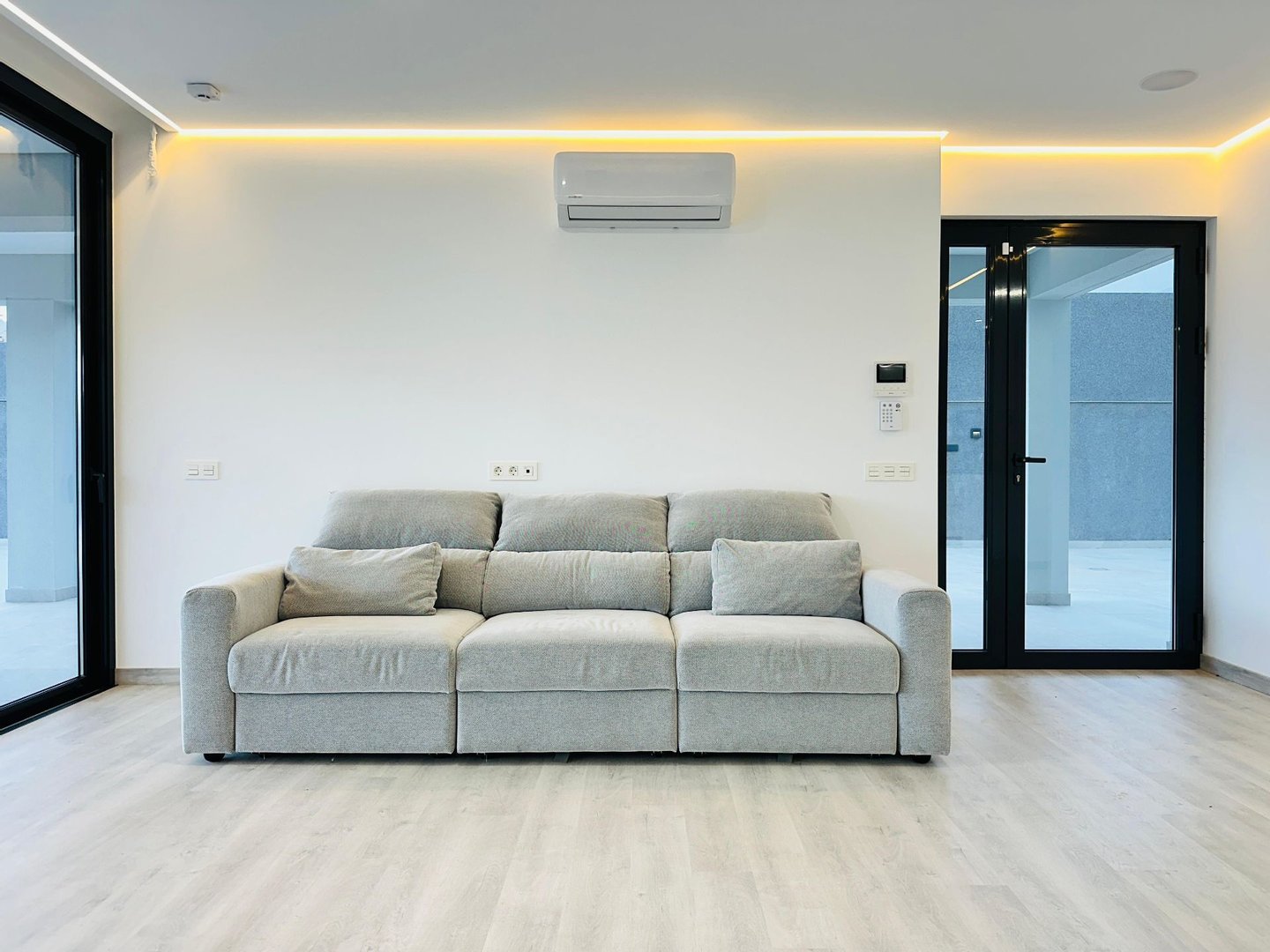 Geräumiges und helles Wohnzimmer mit direktem Zugang nach draußen, voll ausgestattete Küche und Gästetoilette.