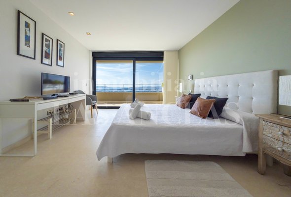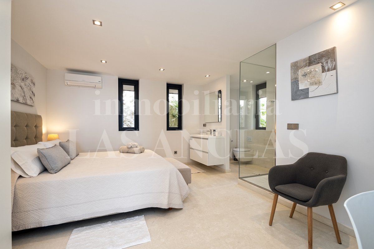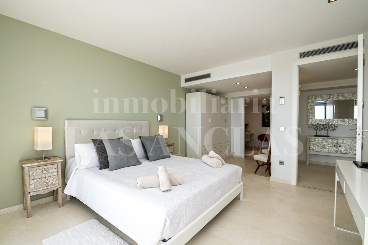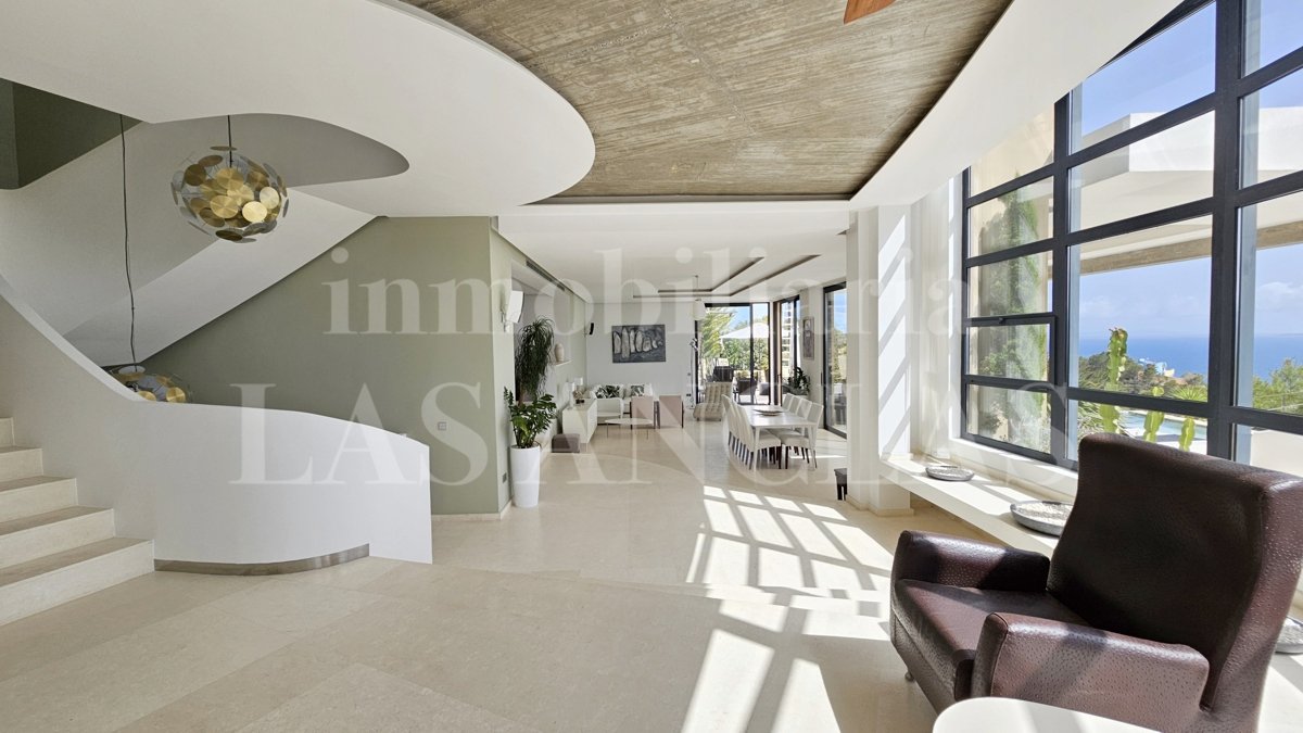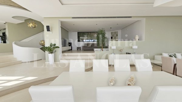 In einer der exklusivsten Gegenden der Insel, in der Nähe des Strandes Talamanca und des Yachthafens Marina Botafoch, befindet sich diese luxuriöse Designervilla mit einer touristischen Vermietungslizenz und einem spektakulären 180º-Panoramablick auf