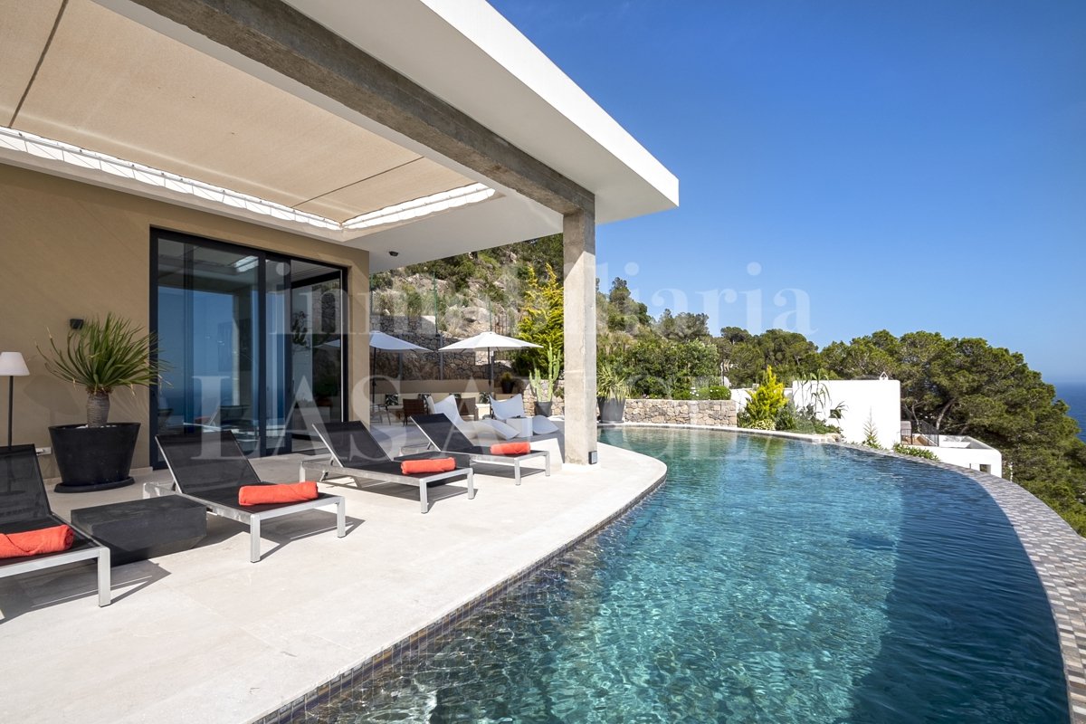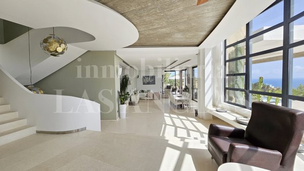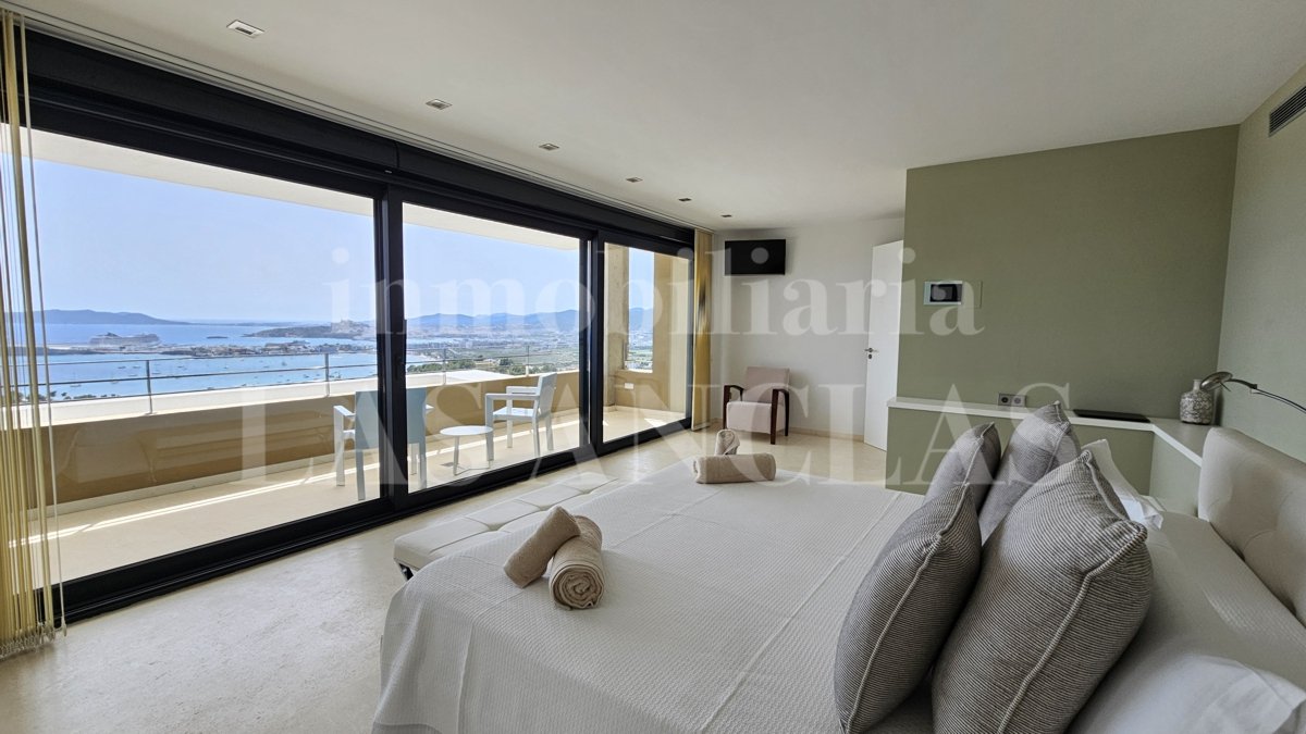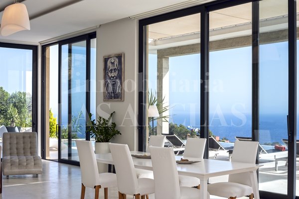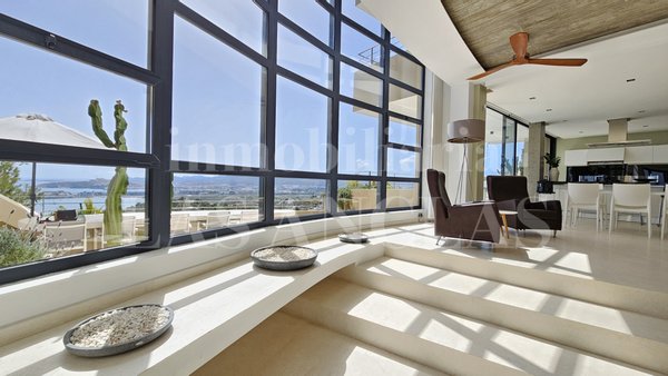 In einer der exklusivsten Gegenden der Insel, in der Nähe des Strandes Talamanca und des Yachthafens Marina Botafoch, befindet sich diese luxuriöse Designervilla mit einer touristischen Vermietungslizenz und einem spektakulären 180º-Panoramablick auf das Meer, den Hafen, die Altstadt von Ibiza und Formentera, die ihresgleichen sucht.